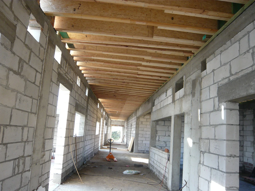 Budynek postawiony częściowo na torfie, na studniach konstrukcyjnych i płytach żelbetowych, a częściowo na ławach fundamentowych. Konstrukcja mieszana: słupowo-ryglowa plus ściany nośne murowane z betonu komórkowego, dach płaski na konstrukcji stalowej i z dźwigarów z drewna klejonego Kronopol. Powierzchnia budynku: 761 m2