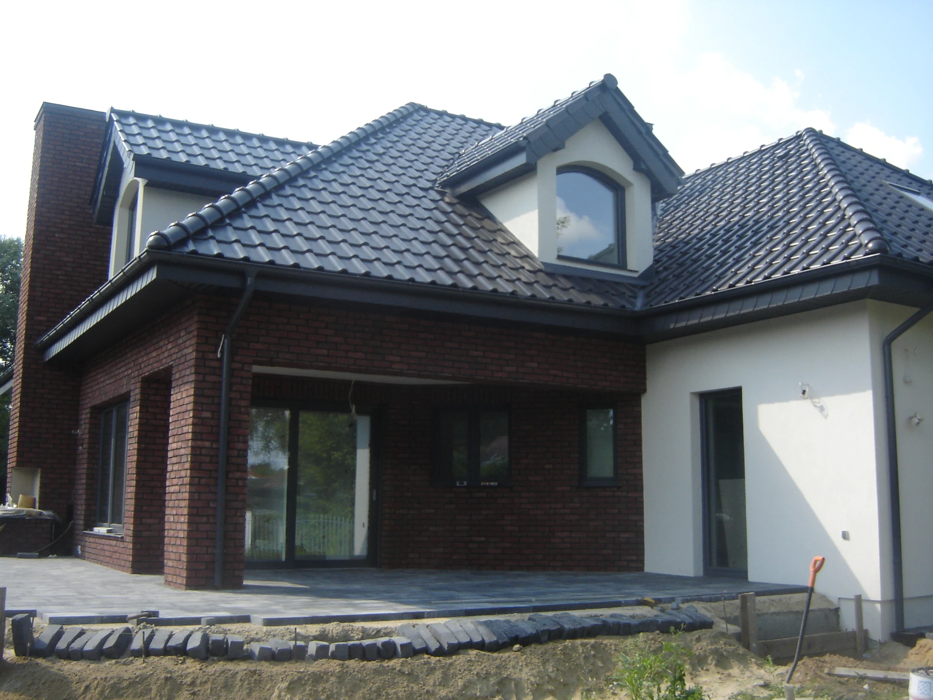 Projekt indywidualny. Grunty torfowe. Budynek posadowiony na studiach i płycie fundamentowej. Ściany wykonane z porothermu. Elewacja klinkier i BSO. Pokrycie dachowe blachodachówka.