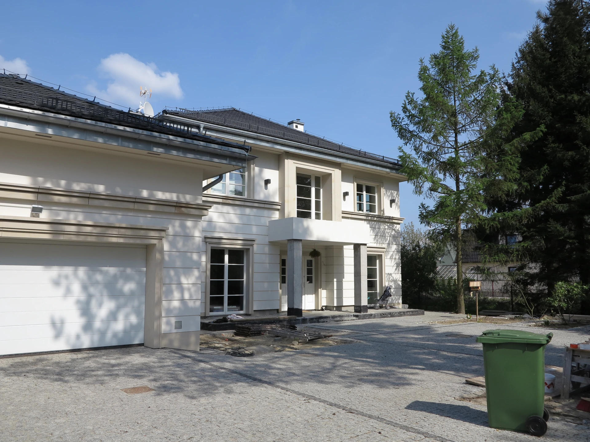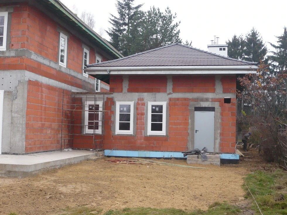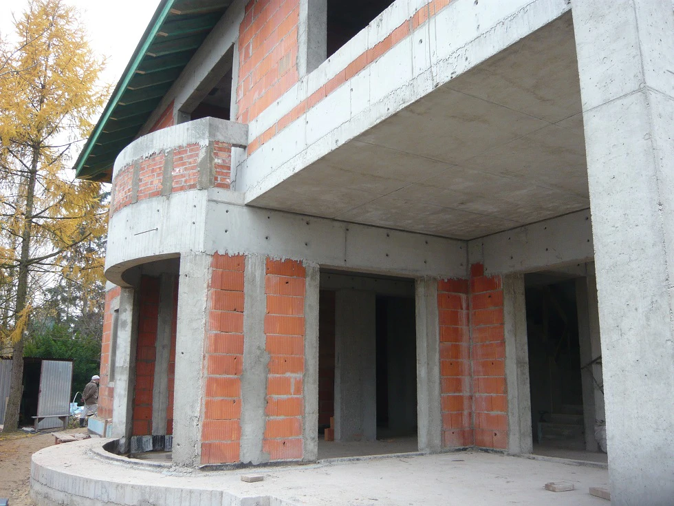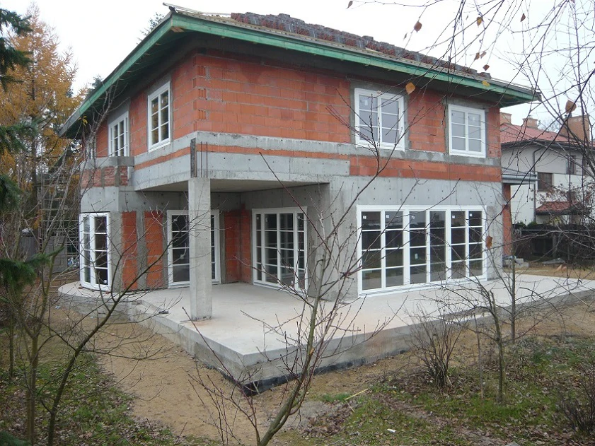 Projekt indywidualny. Budynek posadowiony na ławach fundamentowych żelbetowych z izolacją przeciwwilgociową. Ściany murowane z POROTHERM 25 P+W. Stropy żelbetowe oraz schody żelbetowe. Dach o konstrukcji drewnianej, pokrycie dachu dachówka karpiówka. Elewacja w systemie ocieplenia z tynkiem cienkowarstwowym oraz detalami architektonicznymi w postaci boniowania i opasek. Stolarka okienna PCV, duże przeszklenia od strony ogrodu. Ogrzewanie nadmuchowe. Powierzchnia domu 371 m².