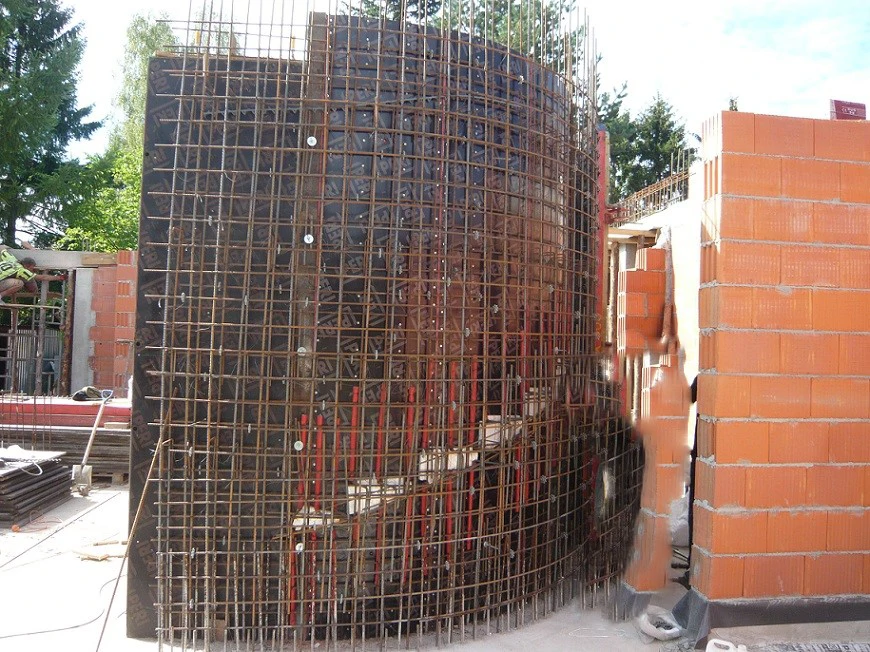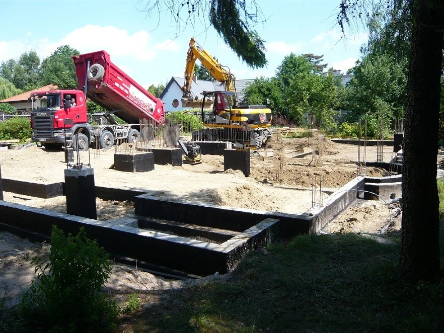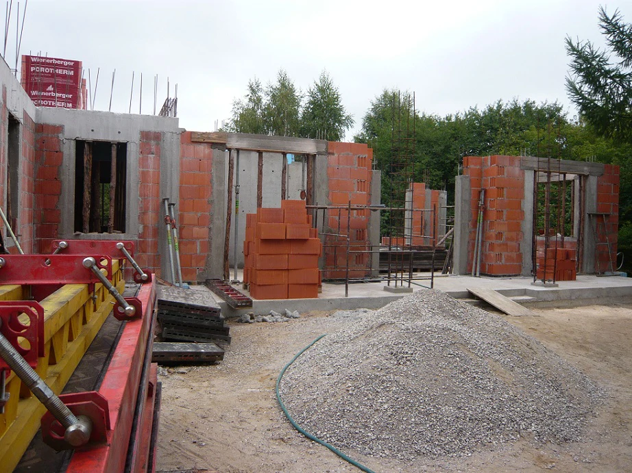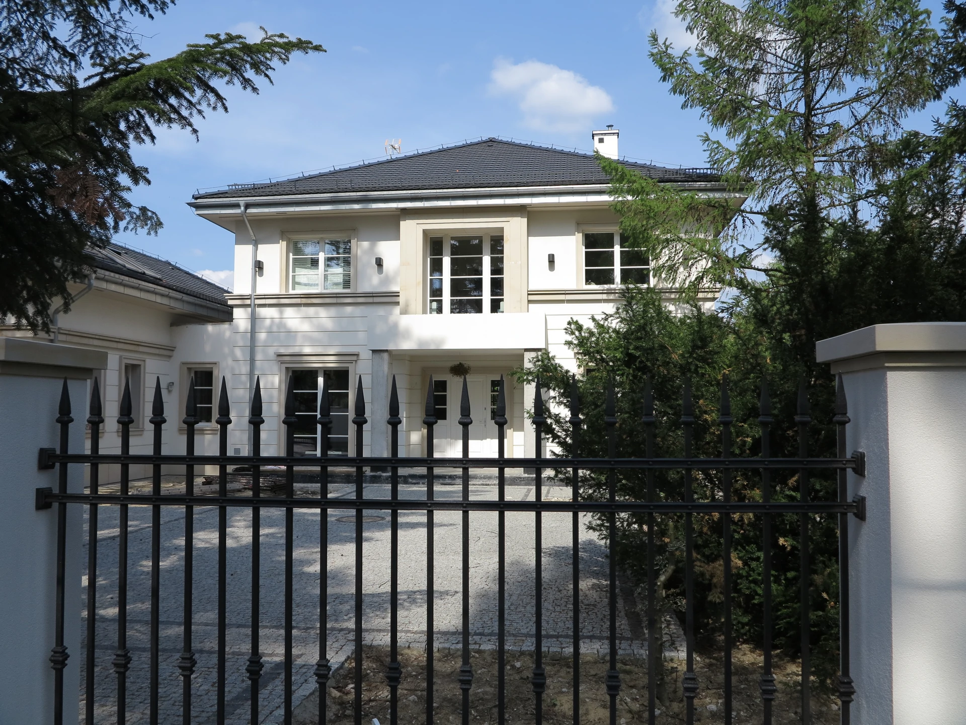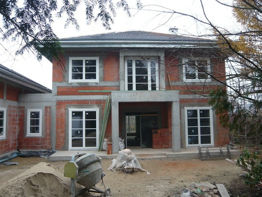 Projekt indywidualny. Budynek posadowiony na ławach fundamentowych żelbetowych z izolacją przeciwwilgociową. Ściany murowane z POROTHERM 25 P+W. Stropy żelbetowe oraz schody żelbetowe. Dach o konstrukcji drewnianej, pokrycie dachu dachówka karpiówka. Elewacja w systemie ocieplenia z tynkiem cienkowarstwowym oraz detalami architektonicznymi w postaci boniowania i opasek. Stolarka okienna PCV, duże przeszklenia od strony ogrodu. Ogrzewanie nadmuchowe. Powierzchnia domu 371 m².