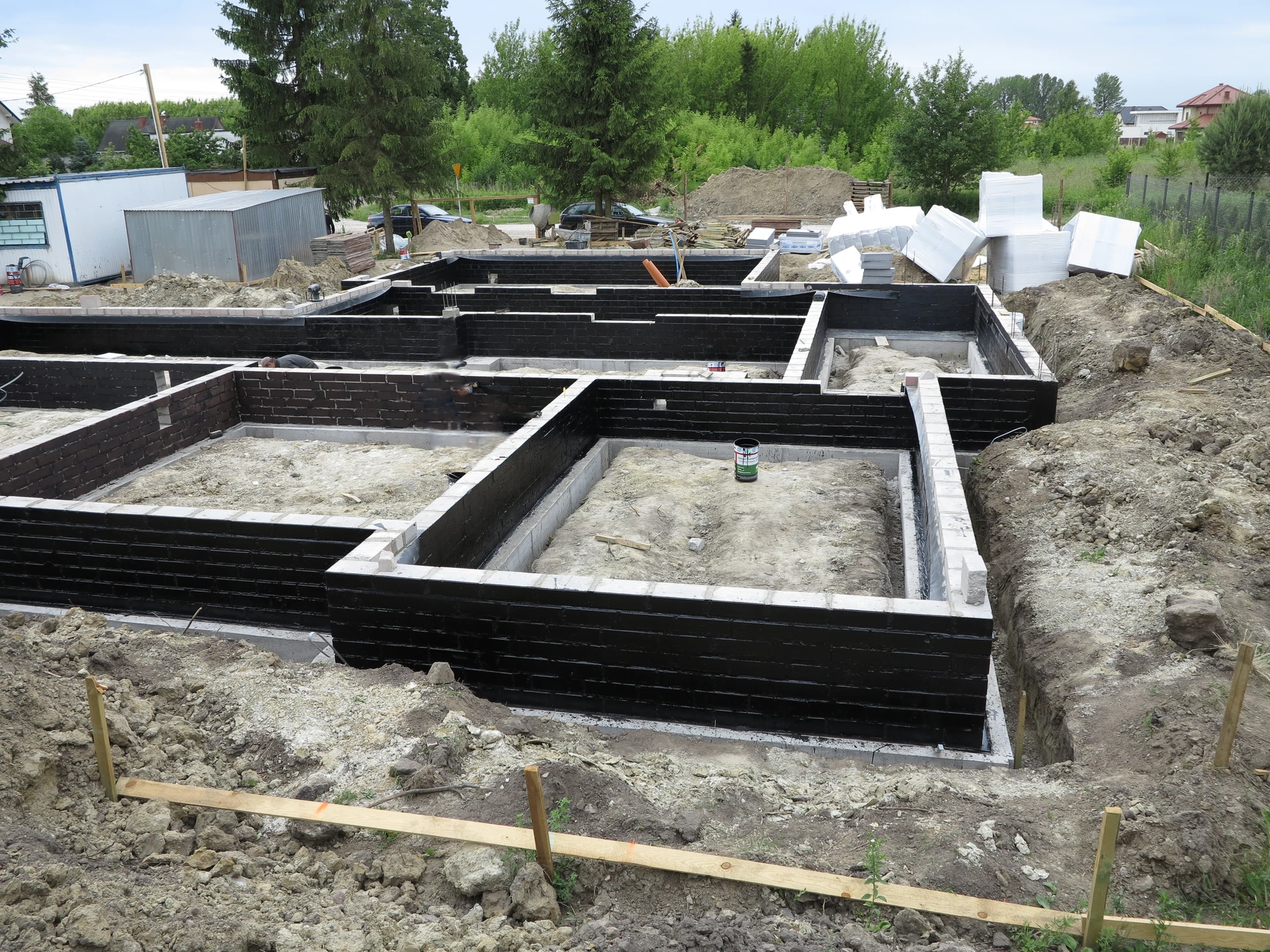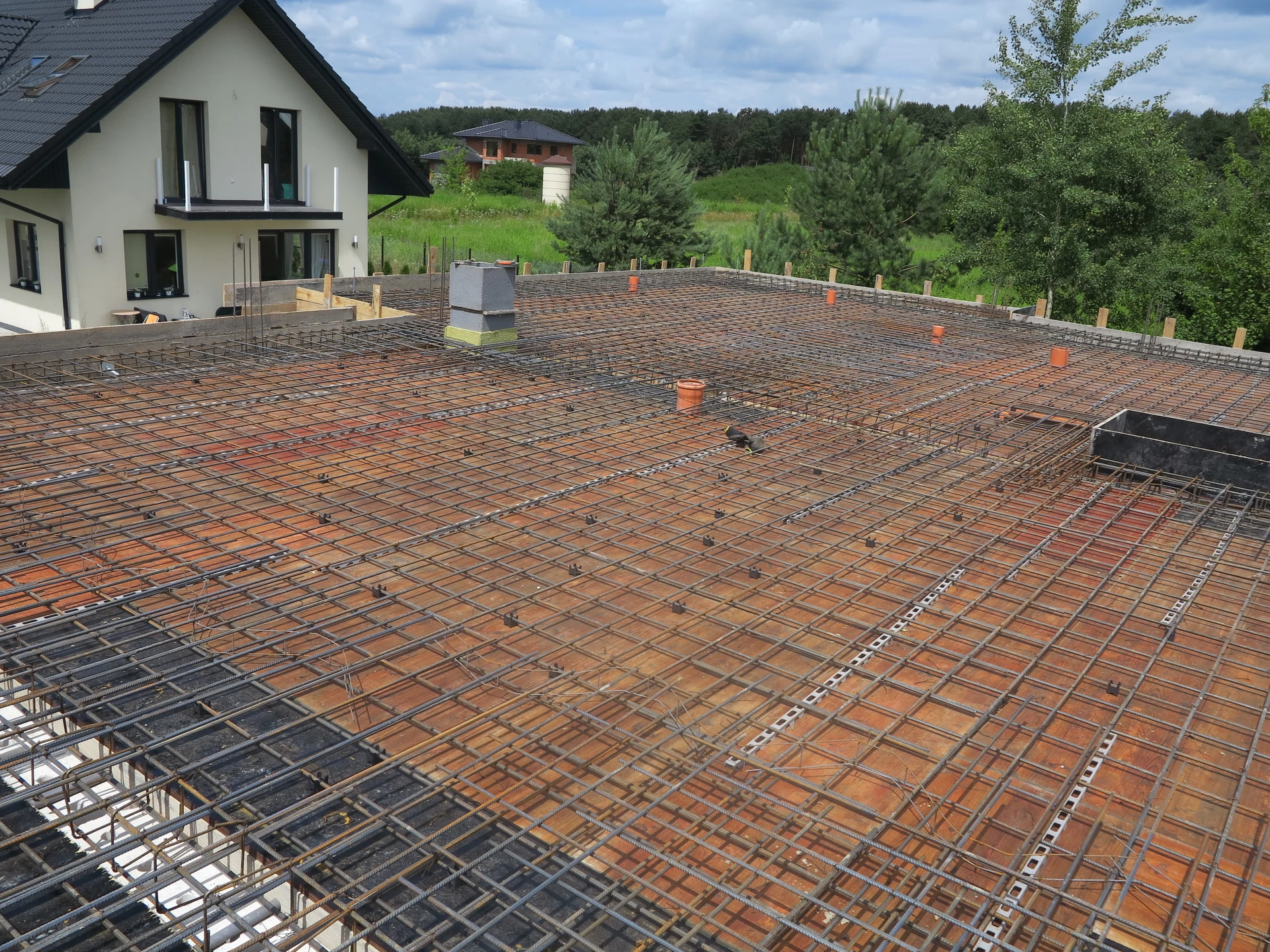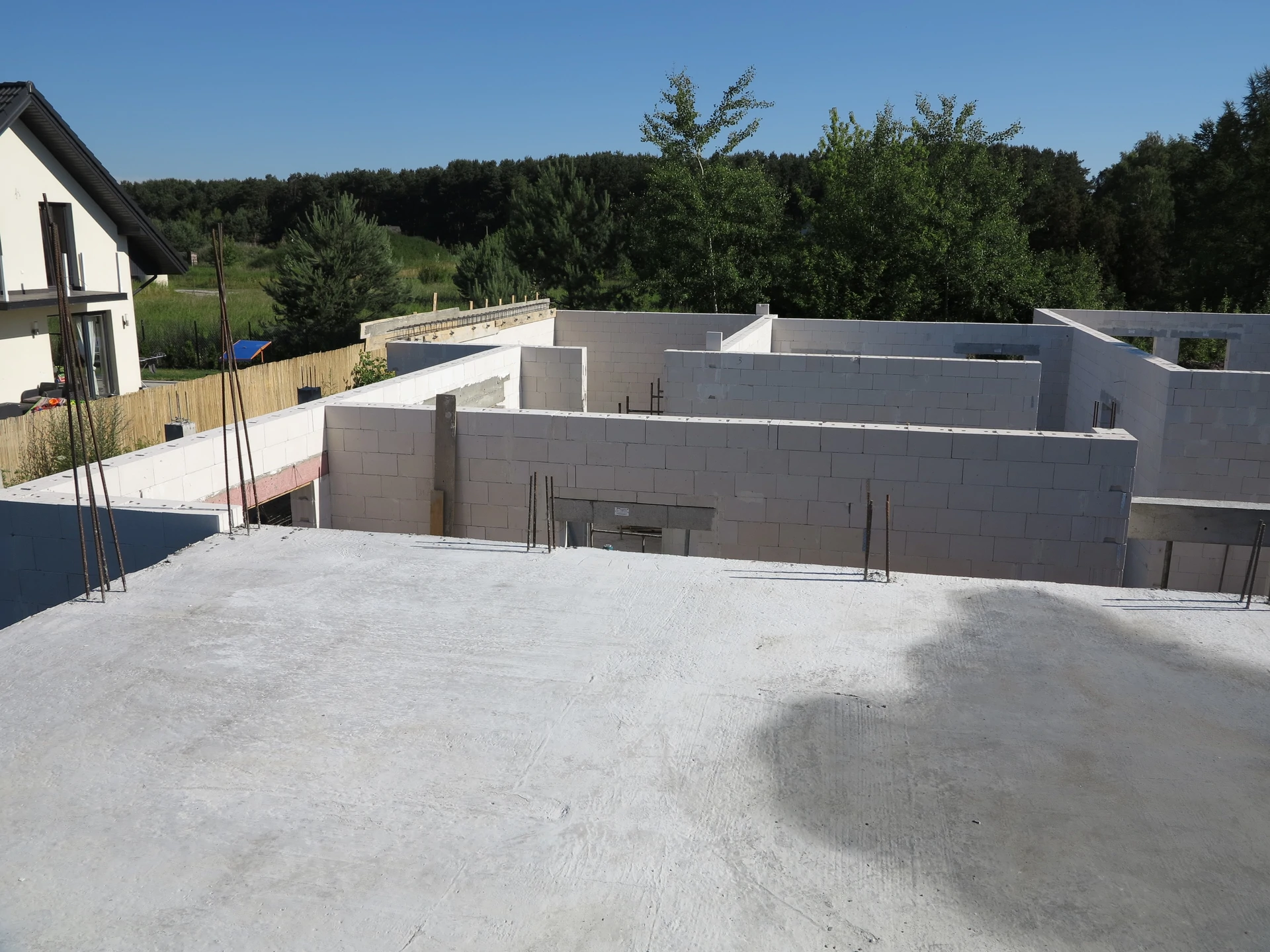 Budowa domu jednorodzinnego, budynek posadowiony na ławach fundamentowych. Ściany parteru wykonane z pustaka ceramicznego. Więźba dachowa z deskowaniem.