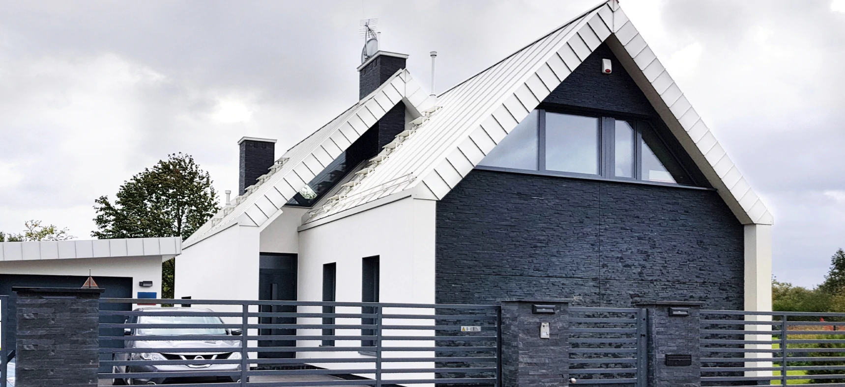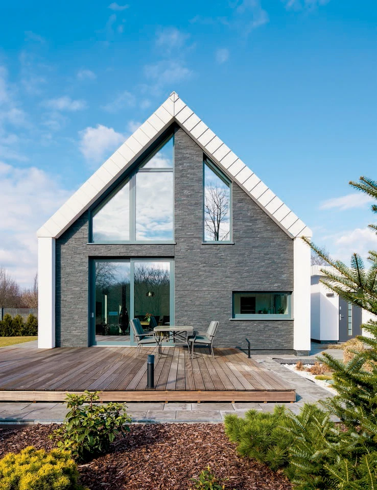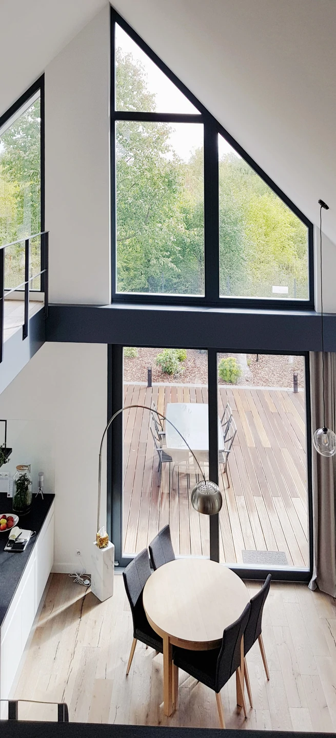 Projekt indywidualny. Budynek posadowiony na ławach fundamentowych. Ściany nadziemia wykonane z silikatów. Schody wspornikowe. Ściana z betonu architektonicznego. Pokrycie blacha aluminiowa na rąbek. Ukryte rynny. Na elewacji częściowo łupek. Stolarka zespolona aluminiowo-drewniana. Powierzchnia domu: 133 m2 Projekt: A8 Architektura Piotr Lewandowski