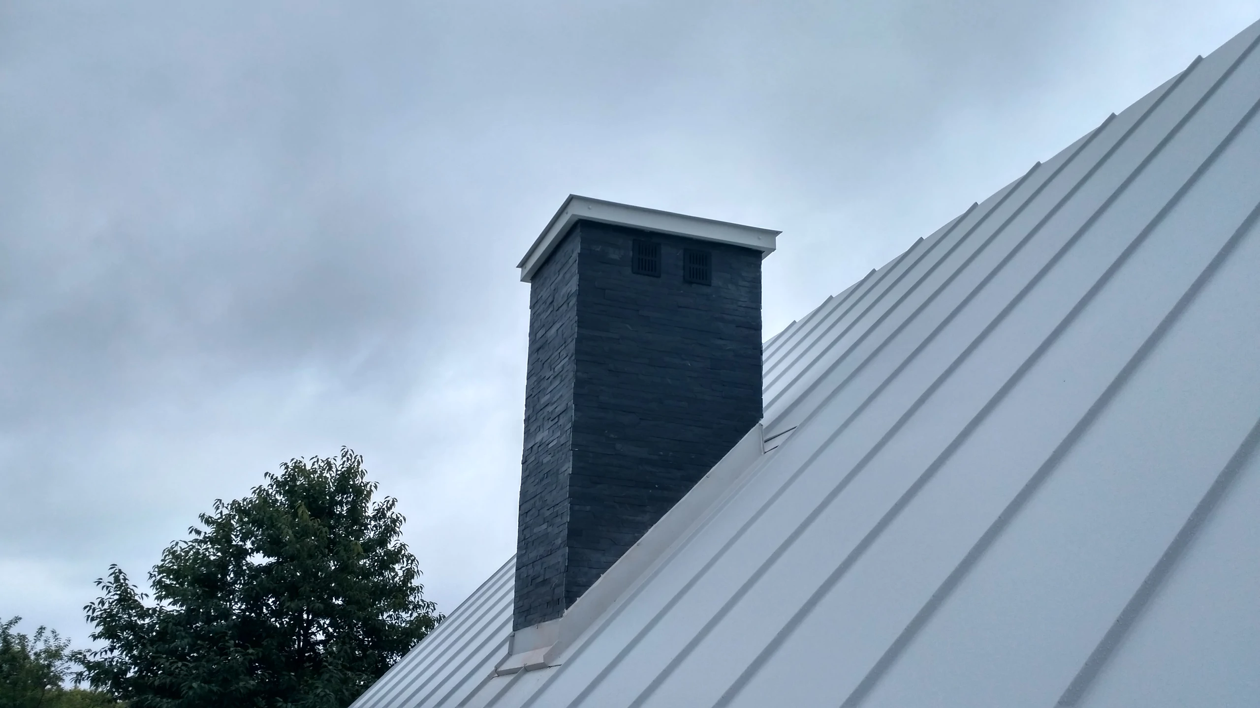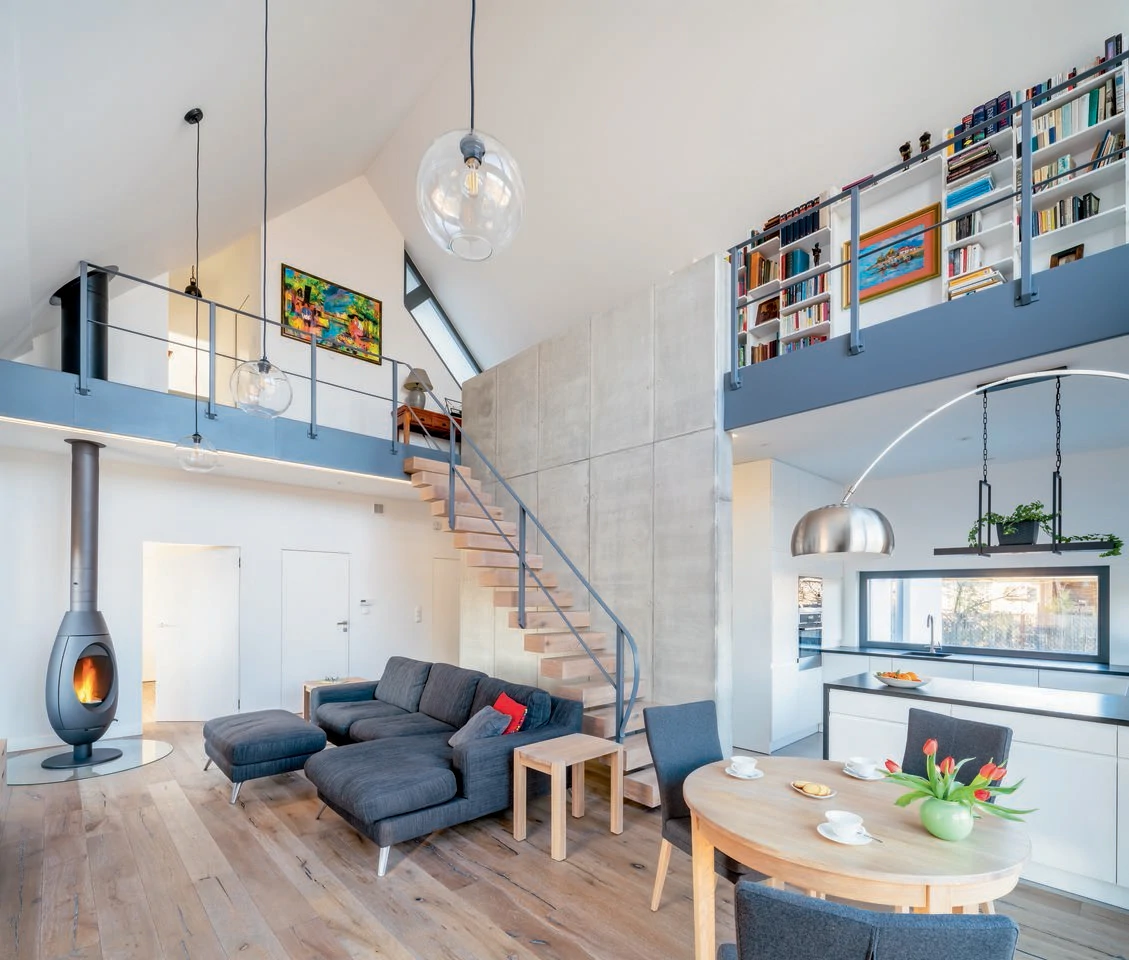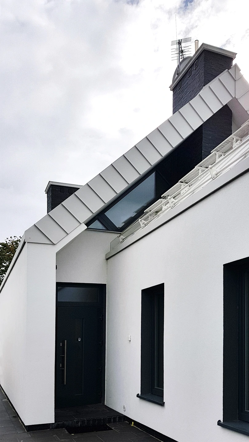 Projekt indywidualny. Budynek posadowiony na ławach fundamentowych. Ściany nadziemia wykonane z silikatów. Schody wspornikowe. Ściana z betonu architektonicznego. Pokrycie blacha aluminiowa na rąbek. Ukryte rynny. Na elewacji częściowo łupek. Stolarka zespolona aluminiowo-drewniana. Powierzchnia domu: 133 m2 Projekt: A8 Architektura Piotr Lewandowski