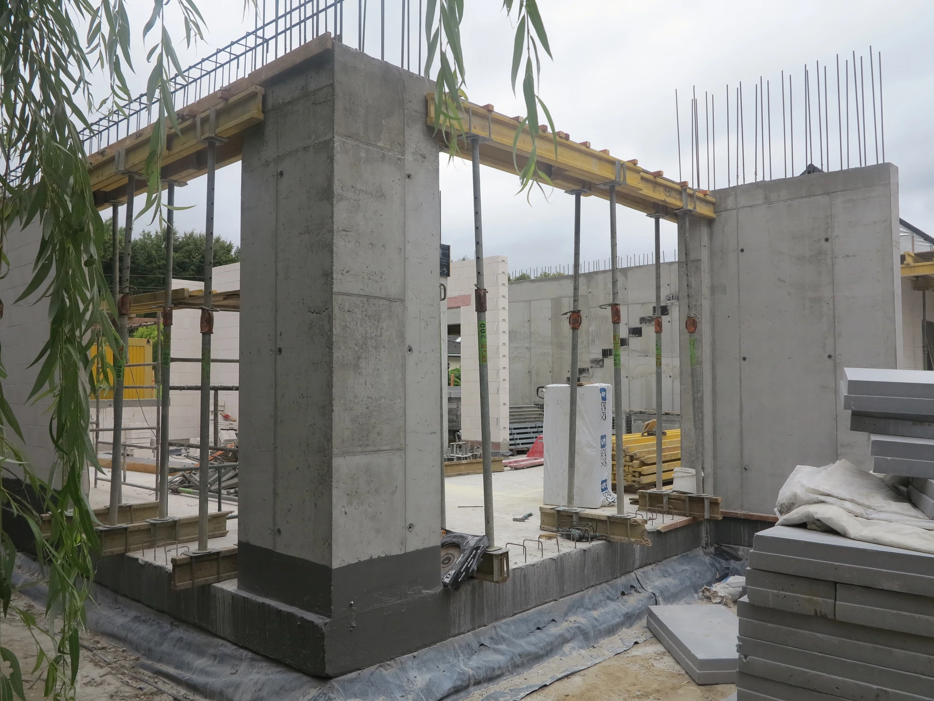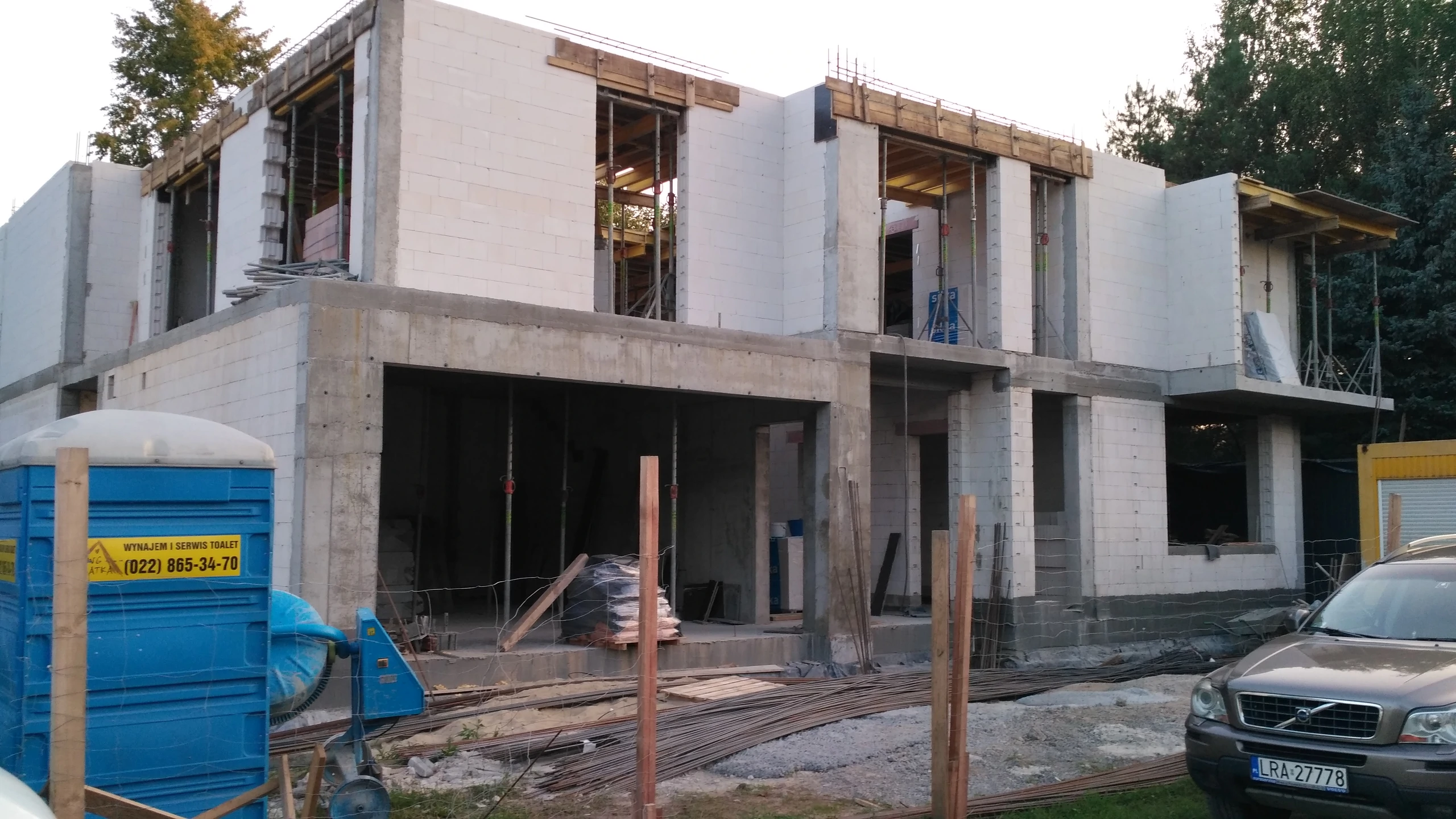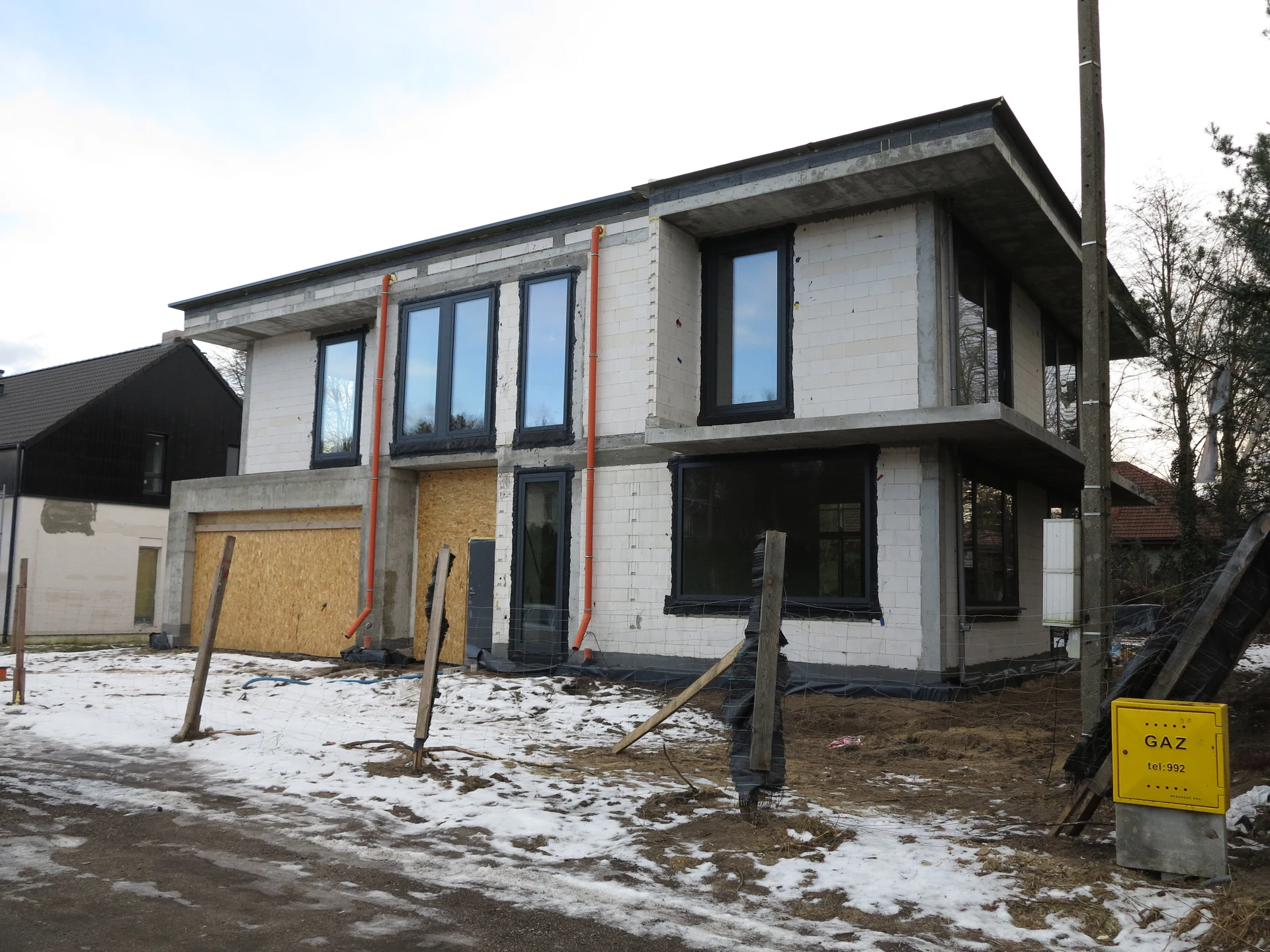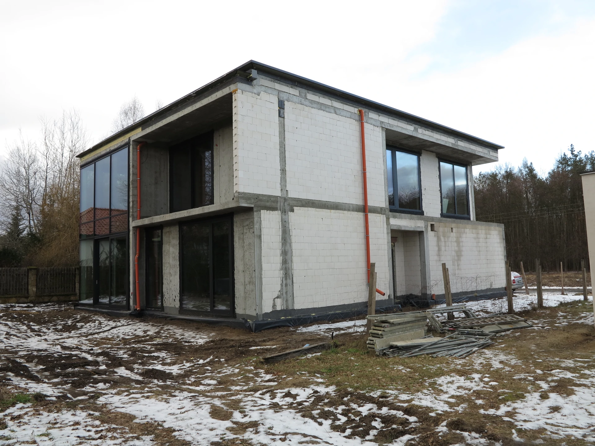 Budowa domu jednorodzinnego, budynek posadowiony na płycie fundamentowej. Ściany wykonane z pustaka ceramicznego. Dach płaski.