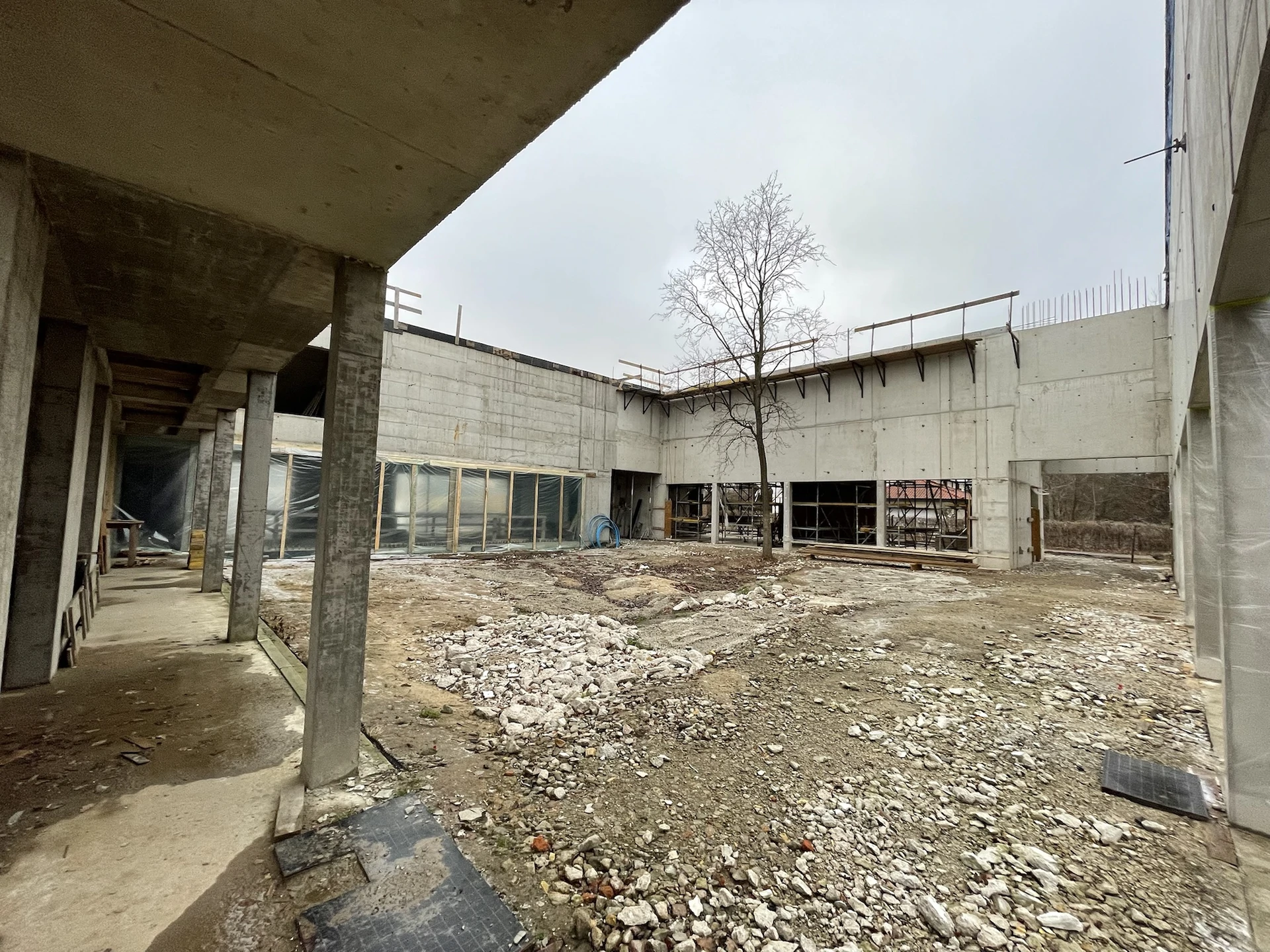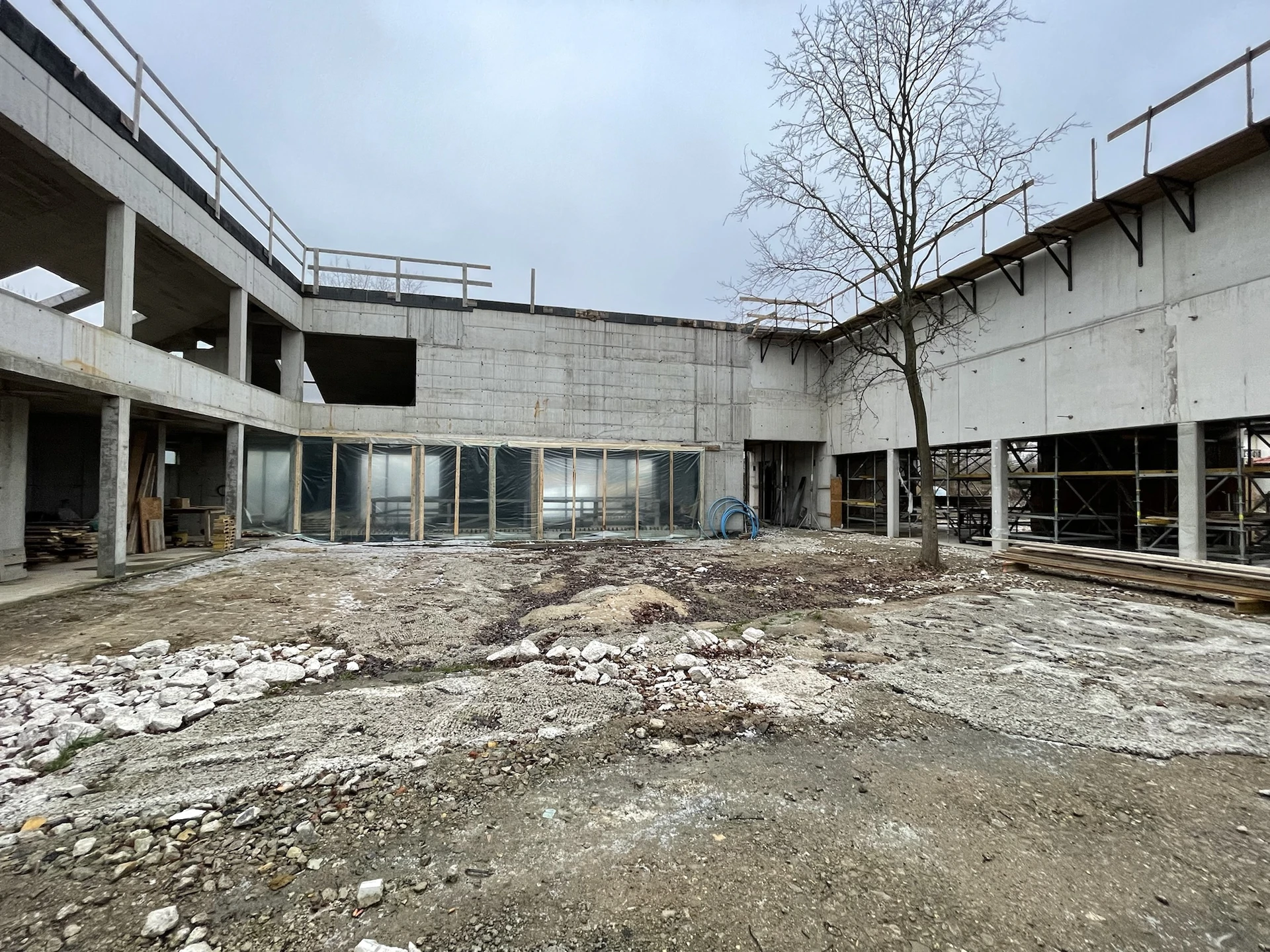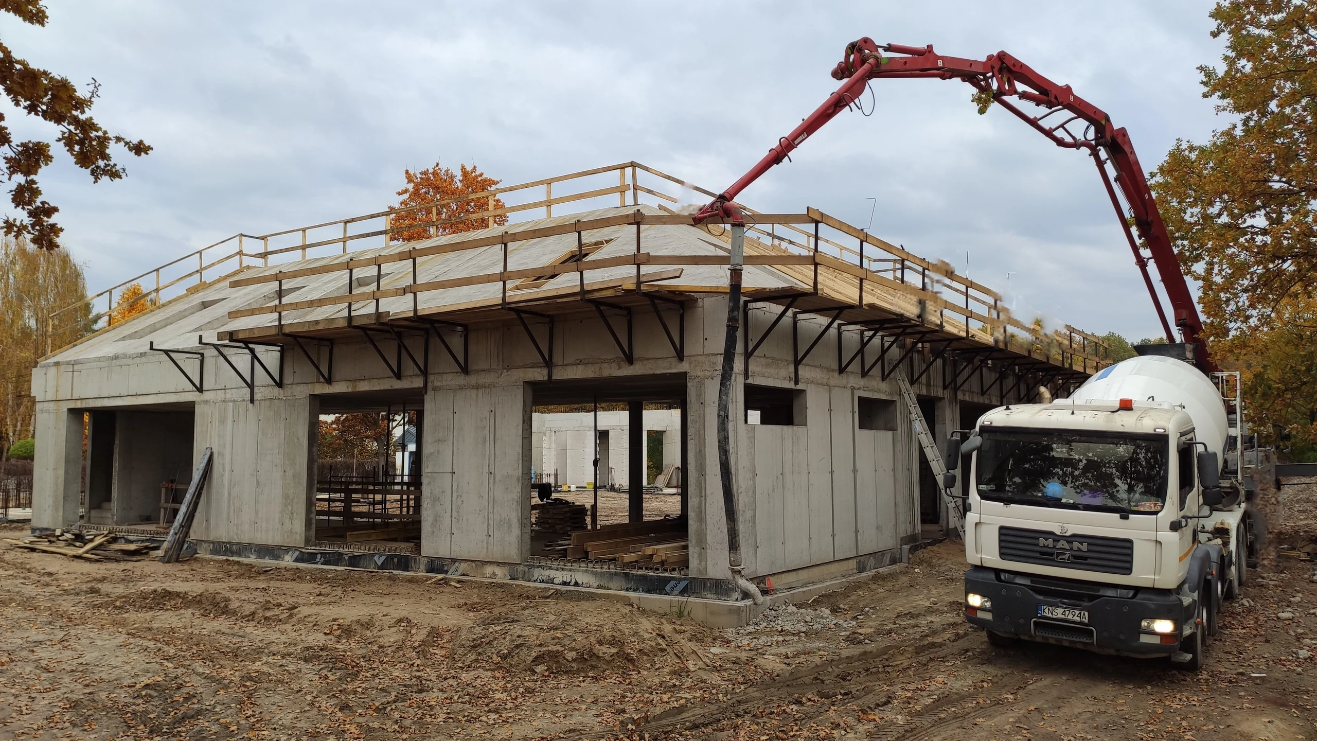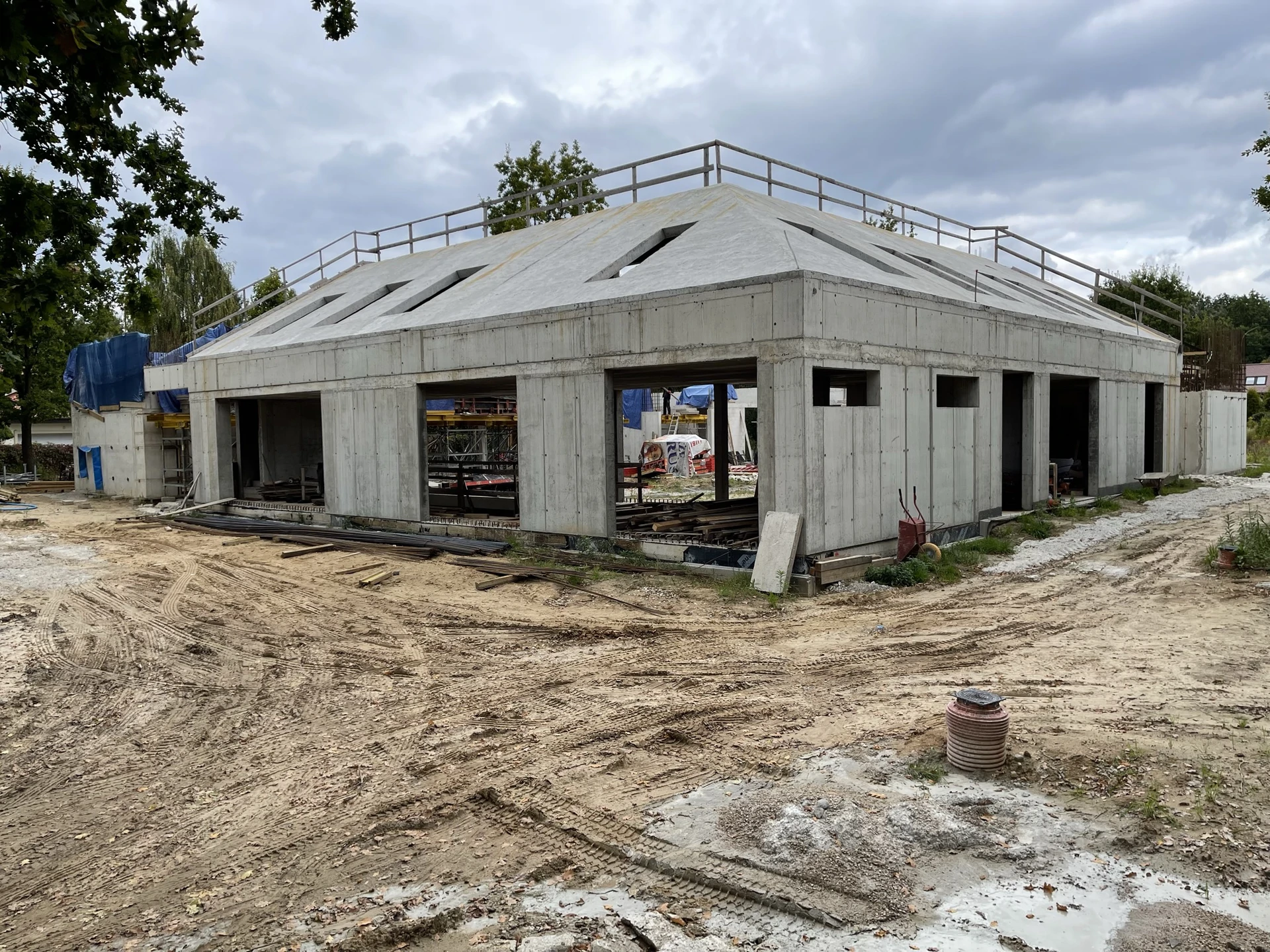 Realizacja obejmuje wykonanie obiektu o układzie zamkniętym wokół wewnętrznego patio. Główna część nadziemna została wykonana w technologii żelbetowej, z zastosowaniem betonu architektonicznego jako docelowej powierzchni ścian na parterze i piętrze. Istotnym elementem geometrii obiektu jest strop/dach po skosie wylewany z żelbetu, wymagający precyzyjnego deskowania oraz gęstego zbrojenia (również w rejonach otworów i krawędzi).