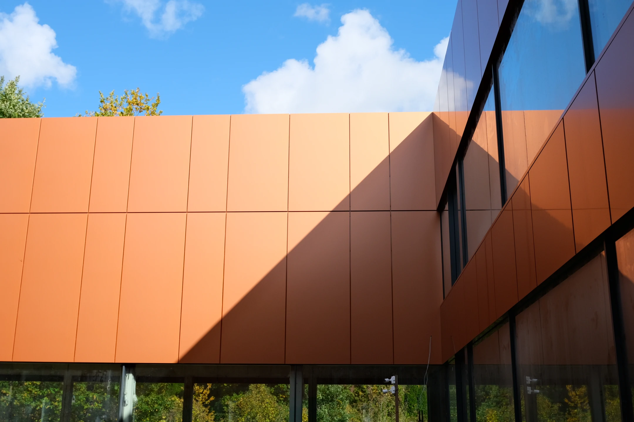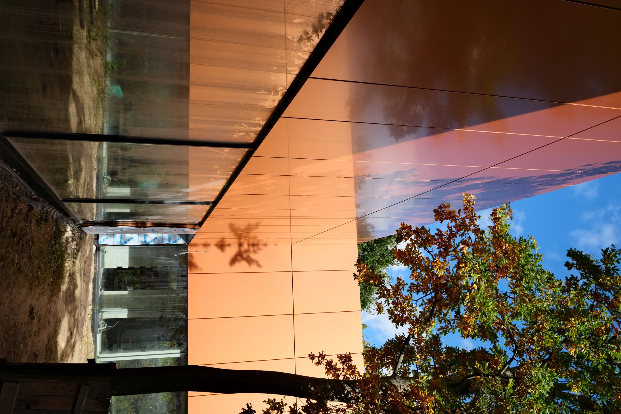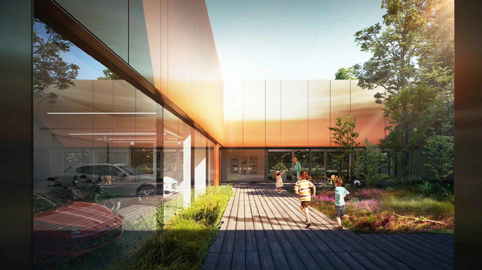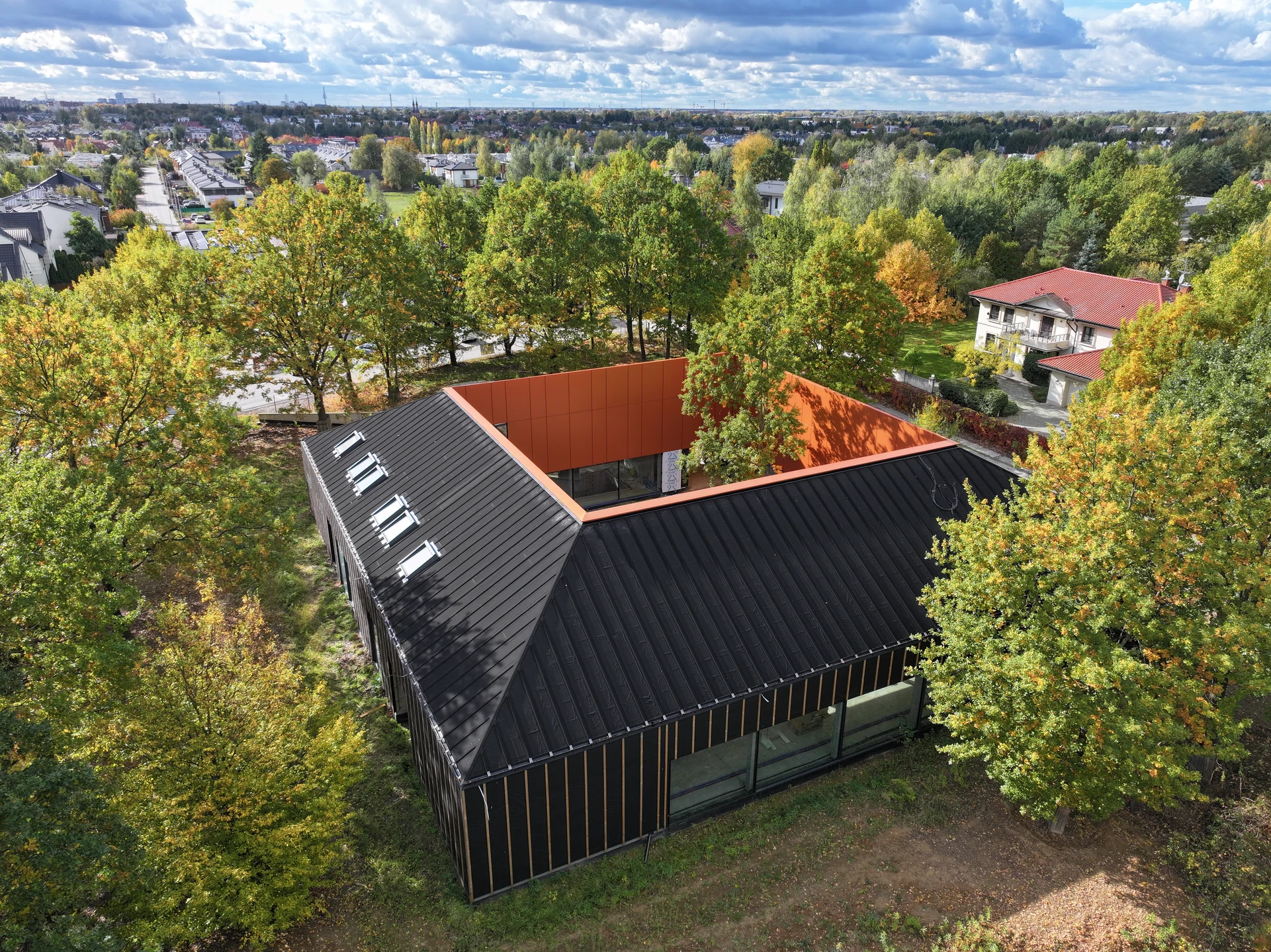 Realizacja obejmuje wykonanie obiektu o układzie zamkniętym wokół wewnętrznego patio. Główna część nadziemna została wykonana w technologii żelbetowej, z zastosowaniem betonu architektonicznego jako docelowej powierzchni ścian na parterze i piętrze. Istotnym elementem geometrii obiektu jest strop/dach po skosie wylewany z żelbetu, wymagający precyzyjnego deskowania oraz gęstego zbrojenia (również w rejonach otworów i krawędzi).