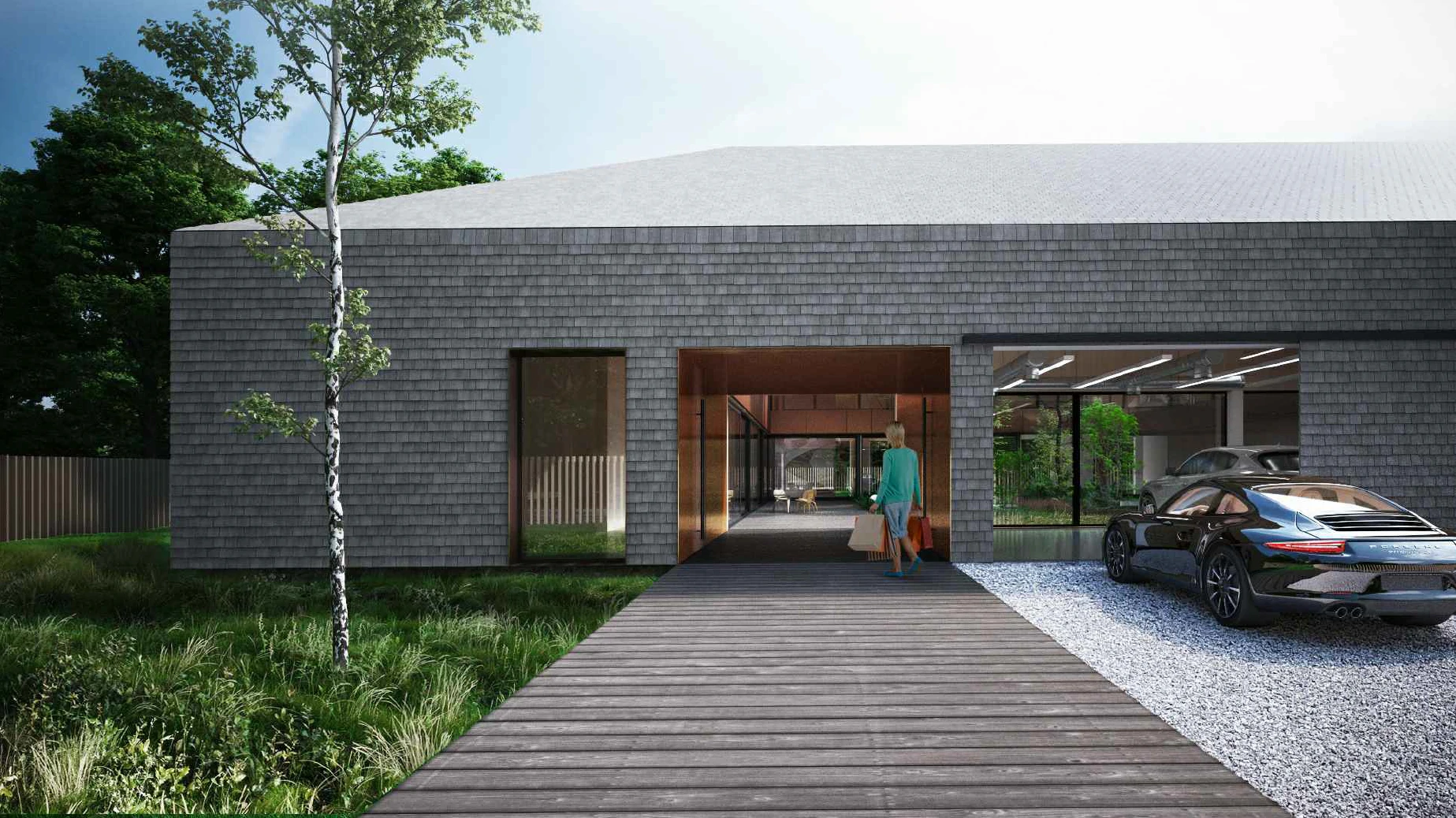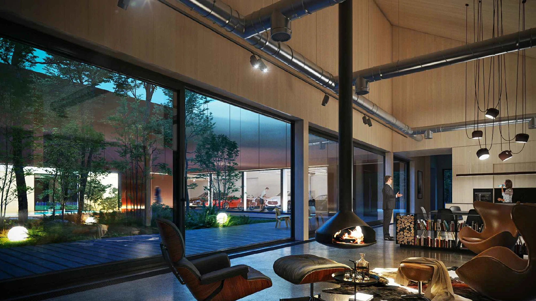 Budynek łączy wymagającą geometrię (patio, duże przeszklenia, strop skośny) z wysokimi wymaganiami technologicznymi: szczelna piwnica – biała wanna, posadowienie na płycie fundamentowej, oraz dodatkowe obiekty żelbetowe (basen). Finalny charakter architektury podkreśla beton architektoniczny i konsekwentnie prowadzona geometria bryły.