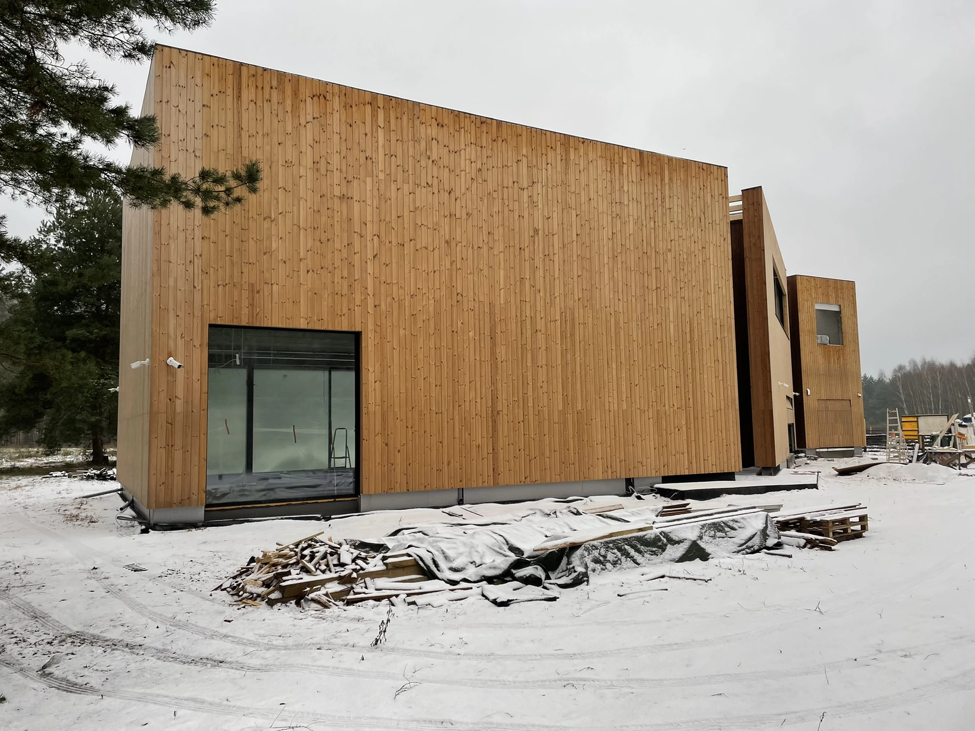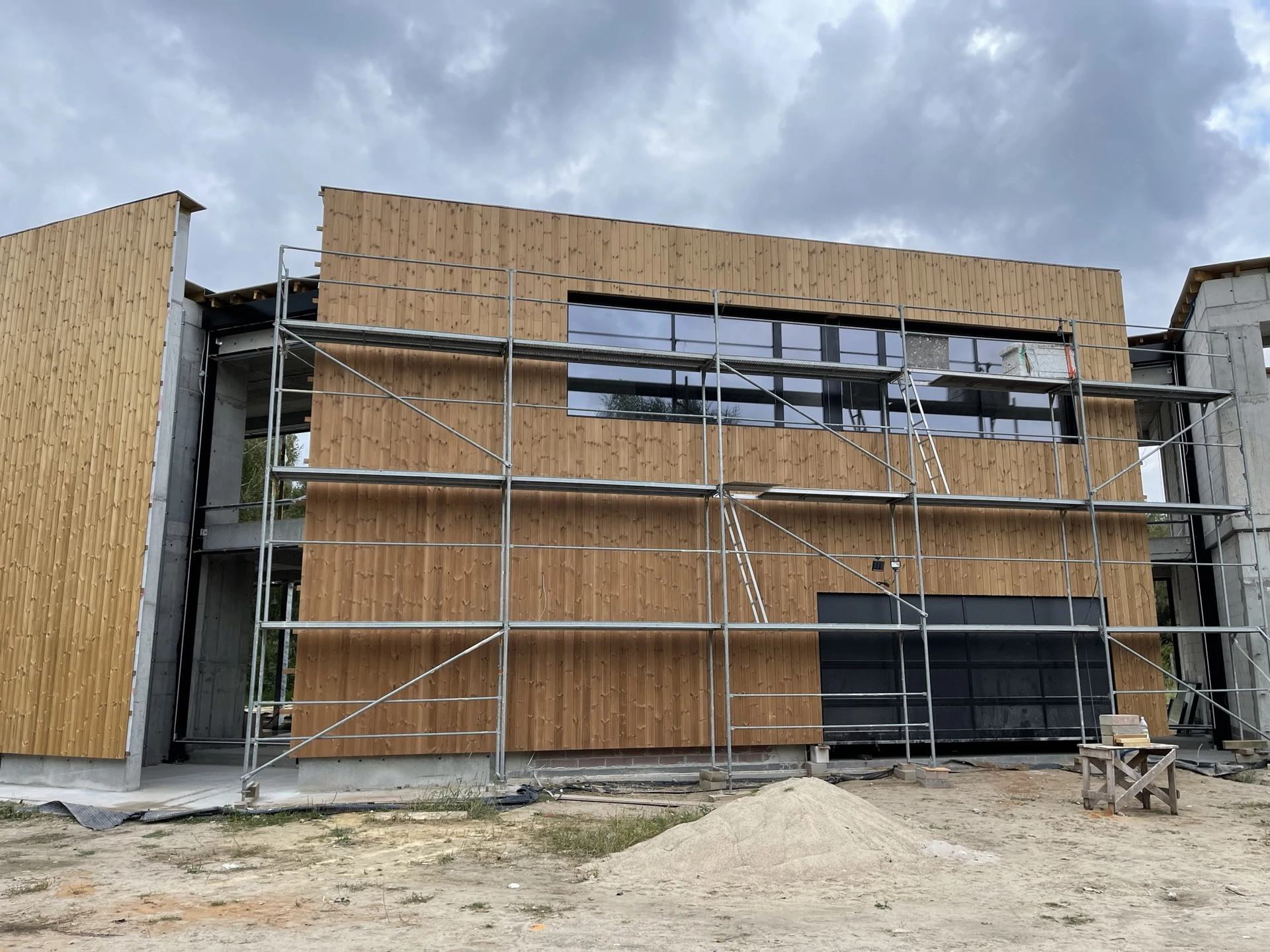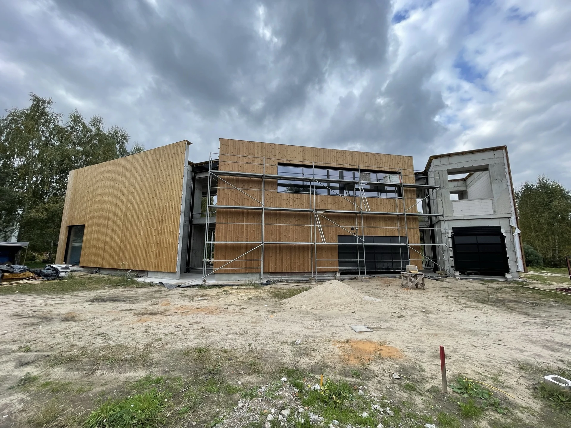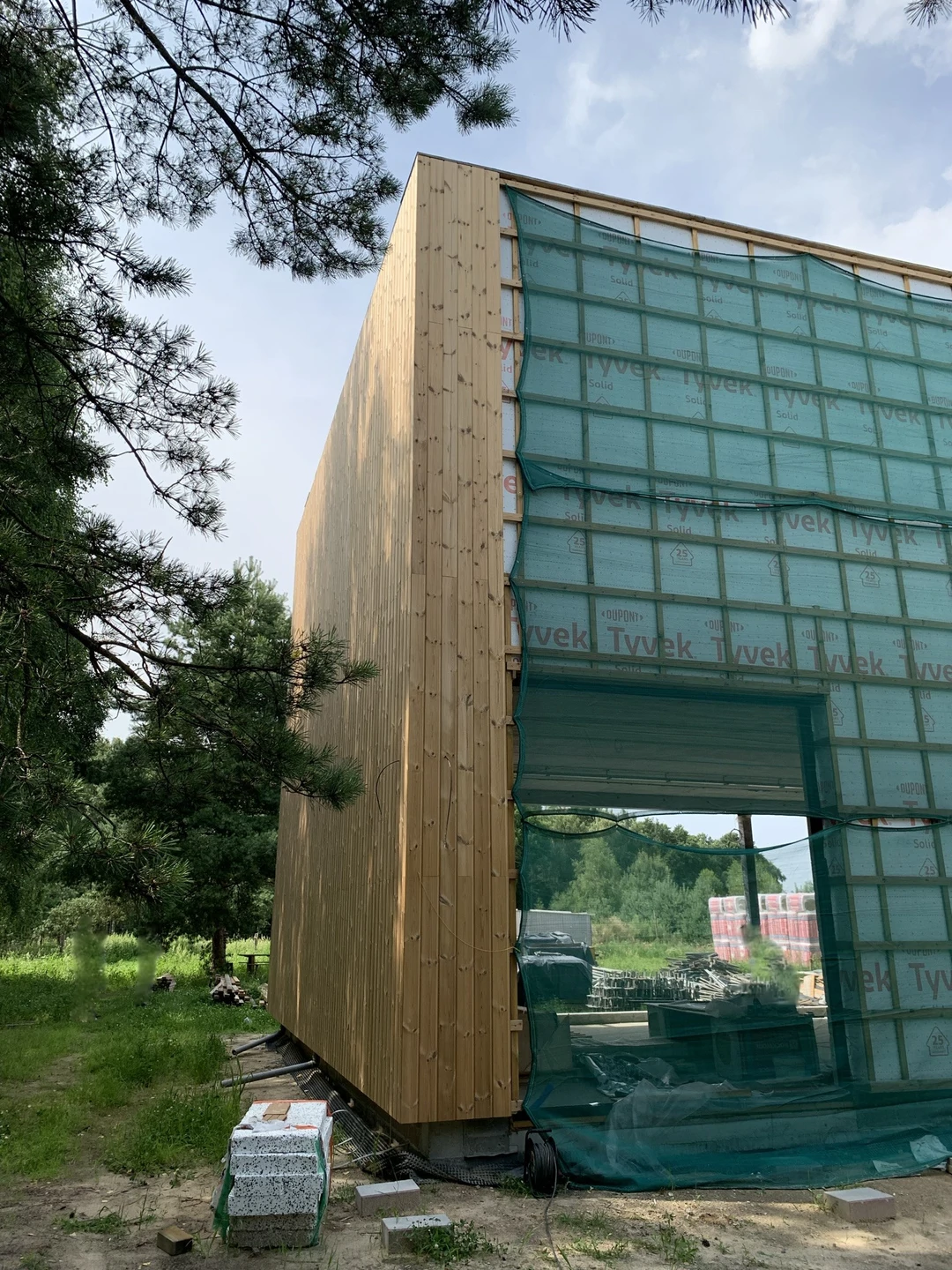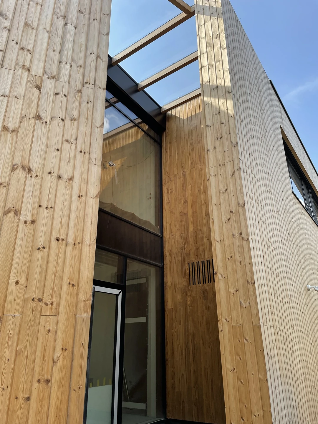 Elewacje wykończono drewnianą okładziną pionową, a charakter techniczny budynku
