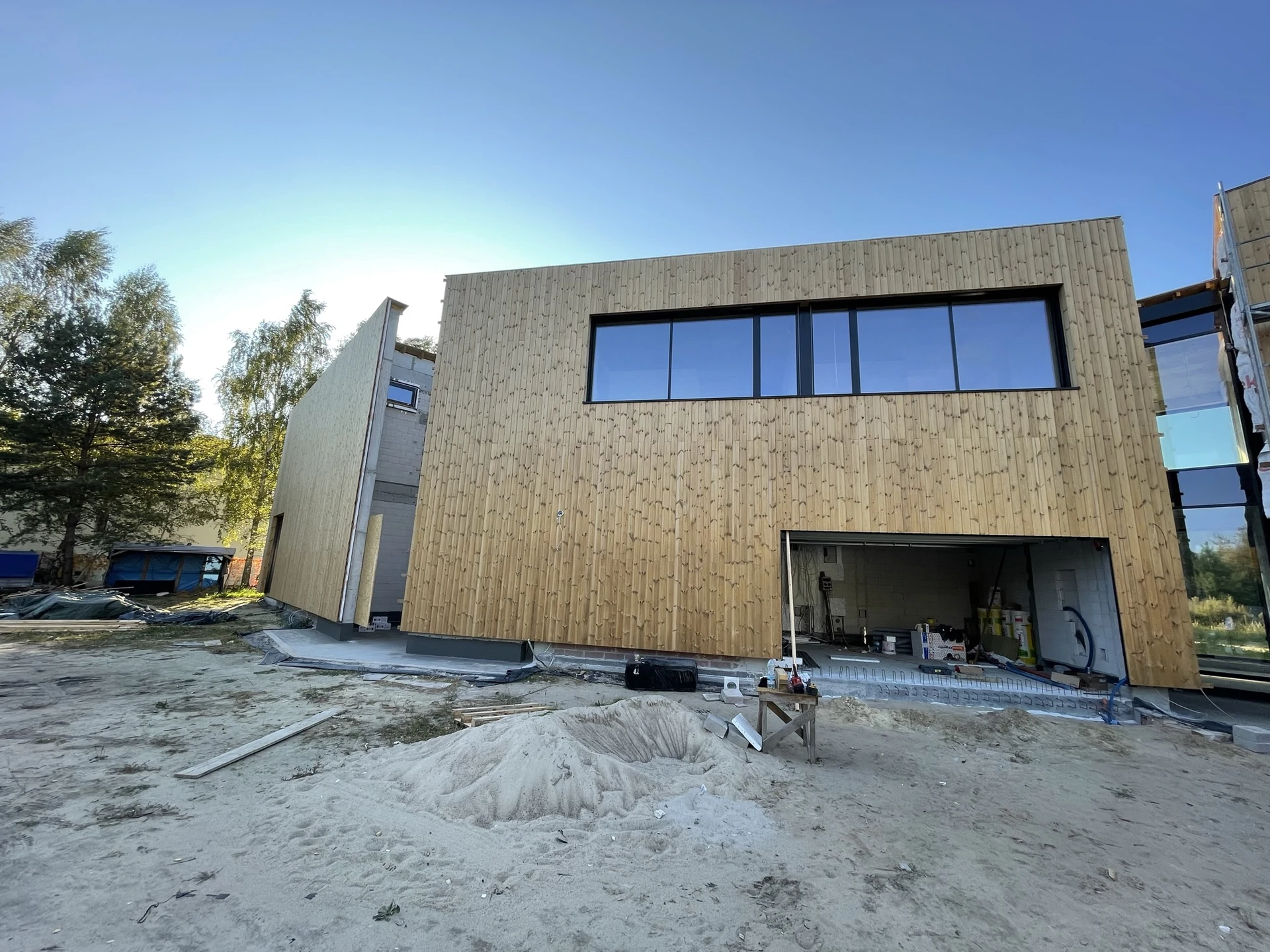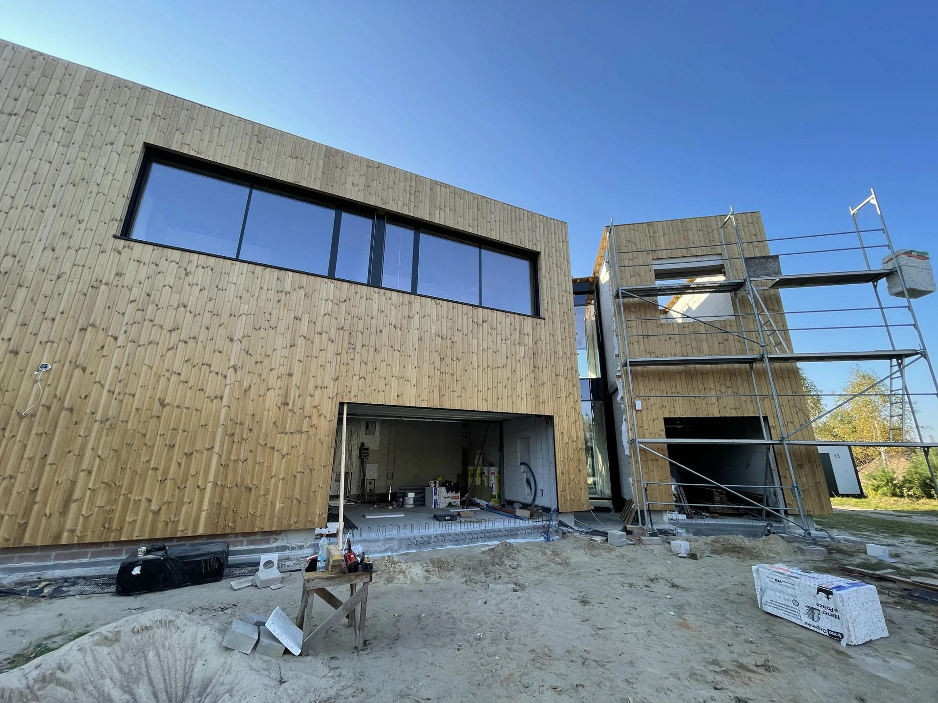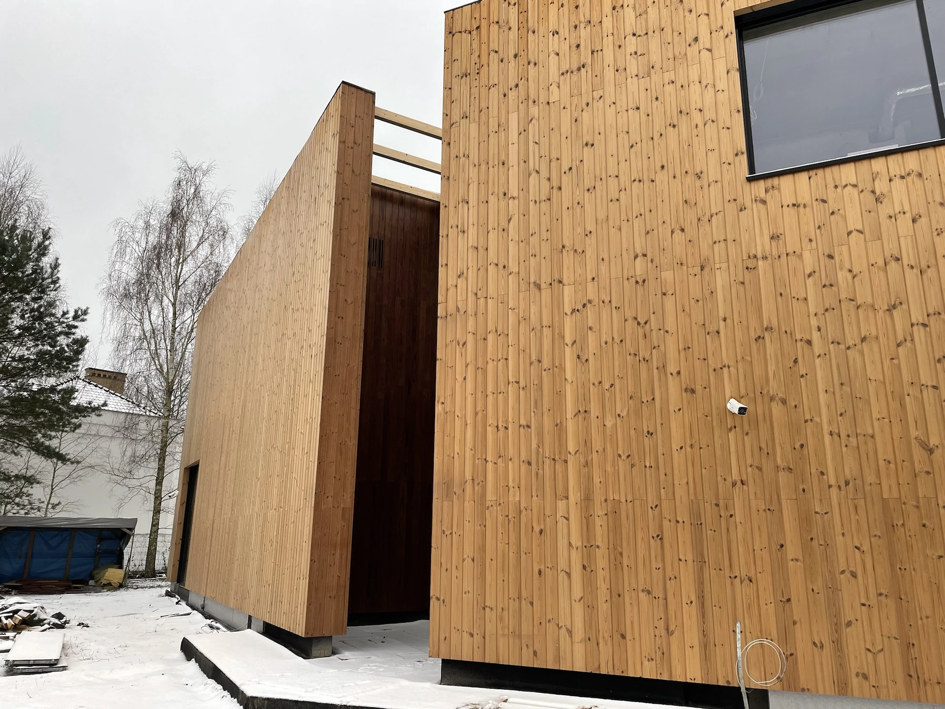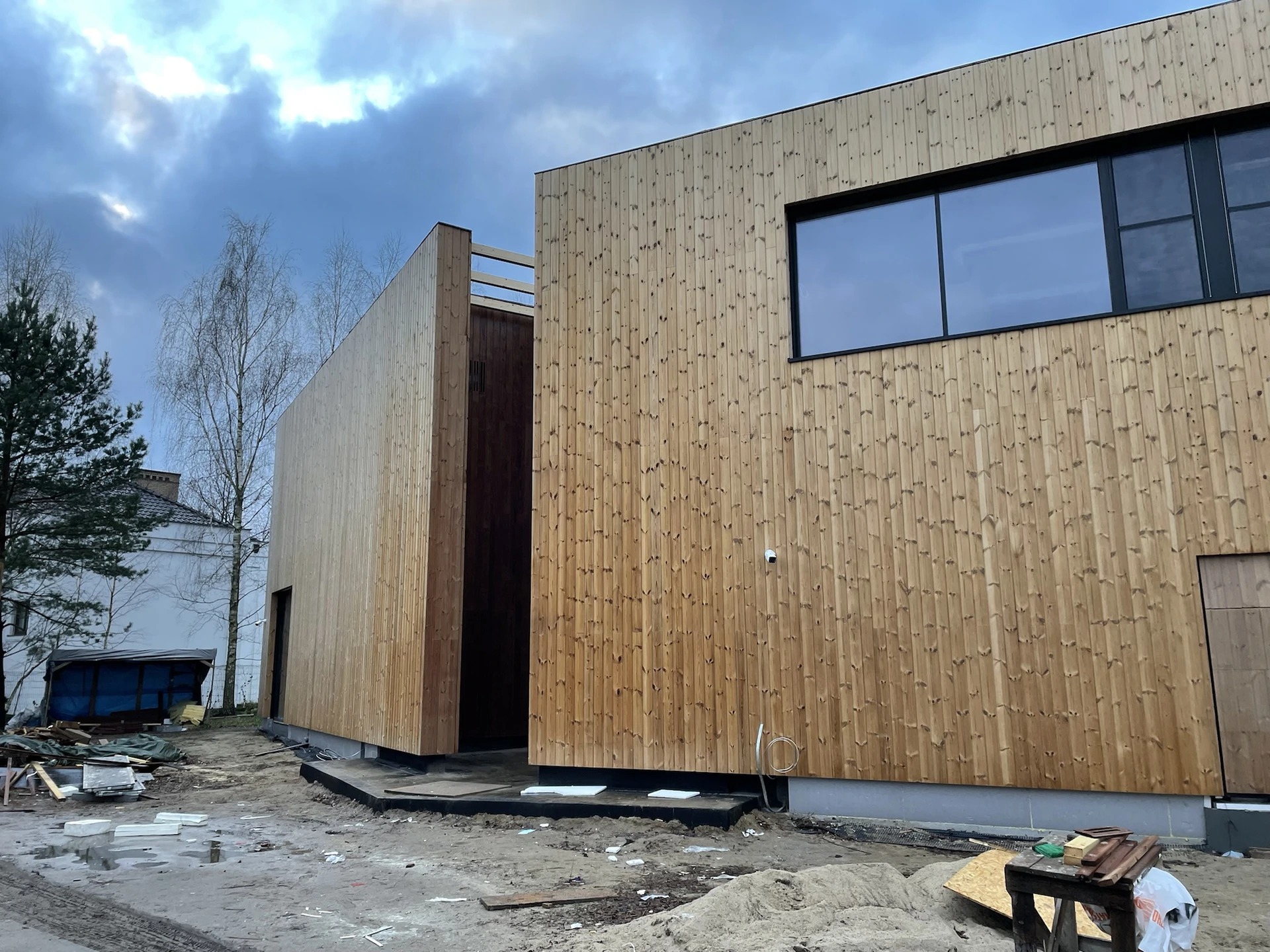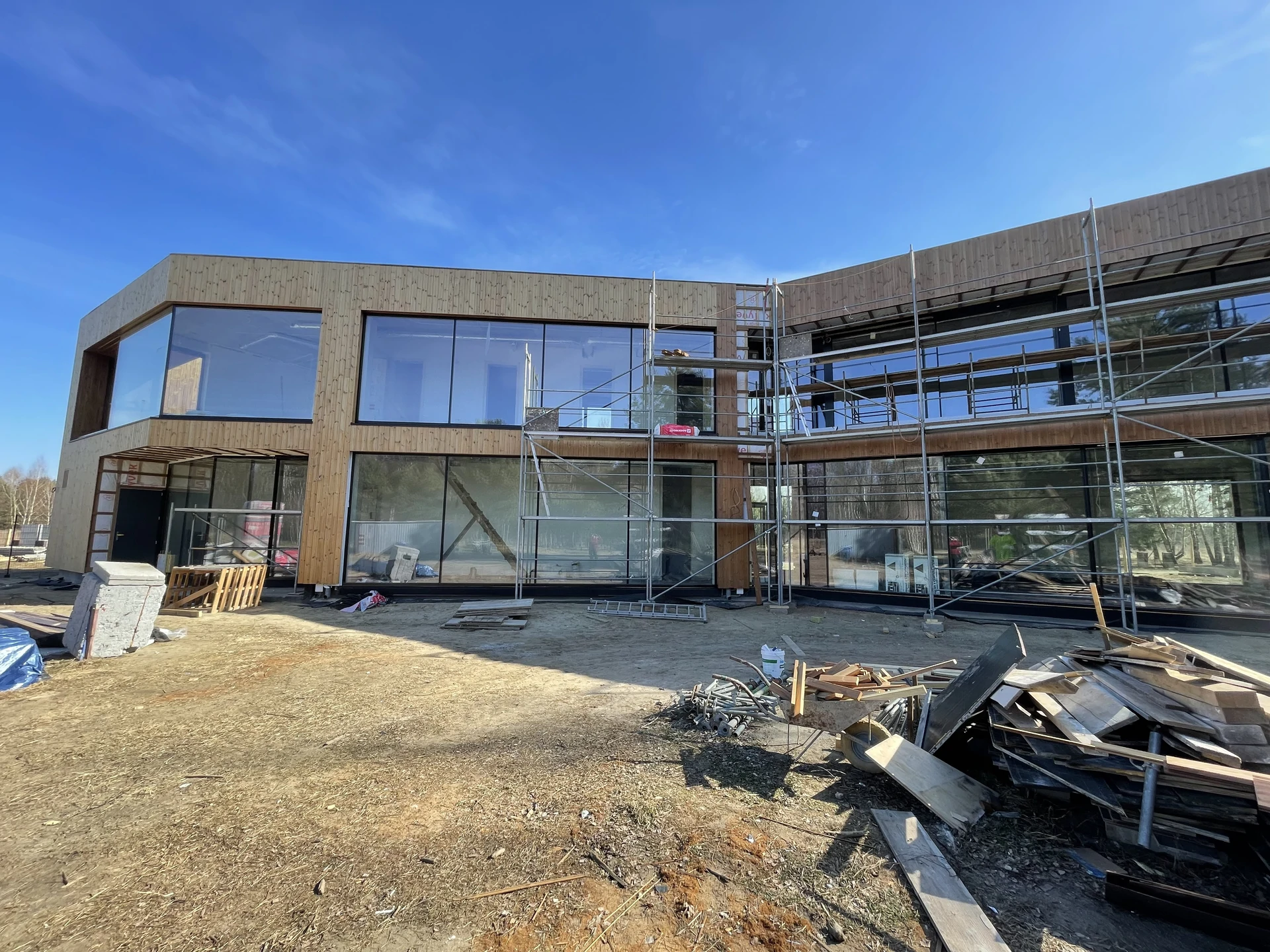 Elewacje wykończono drewnianą okładziną pionową, a charakter techniczny budynku