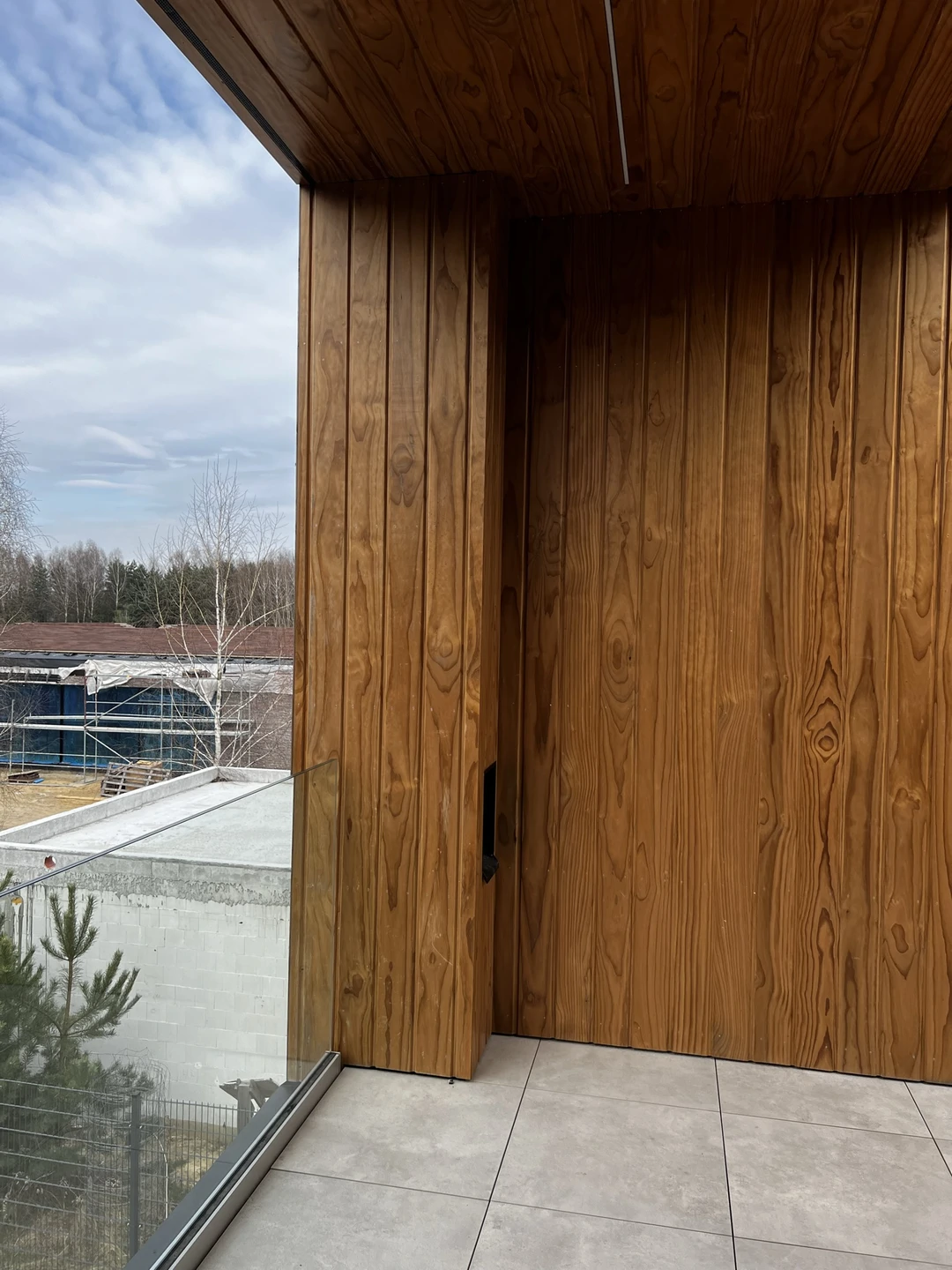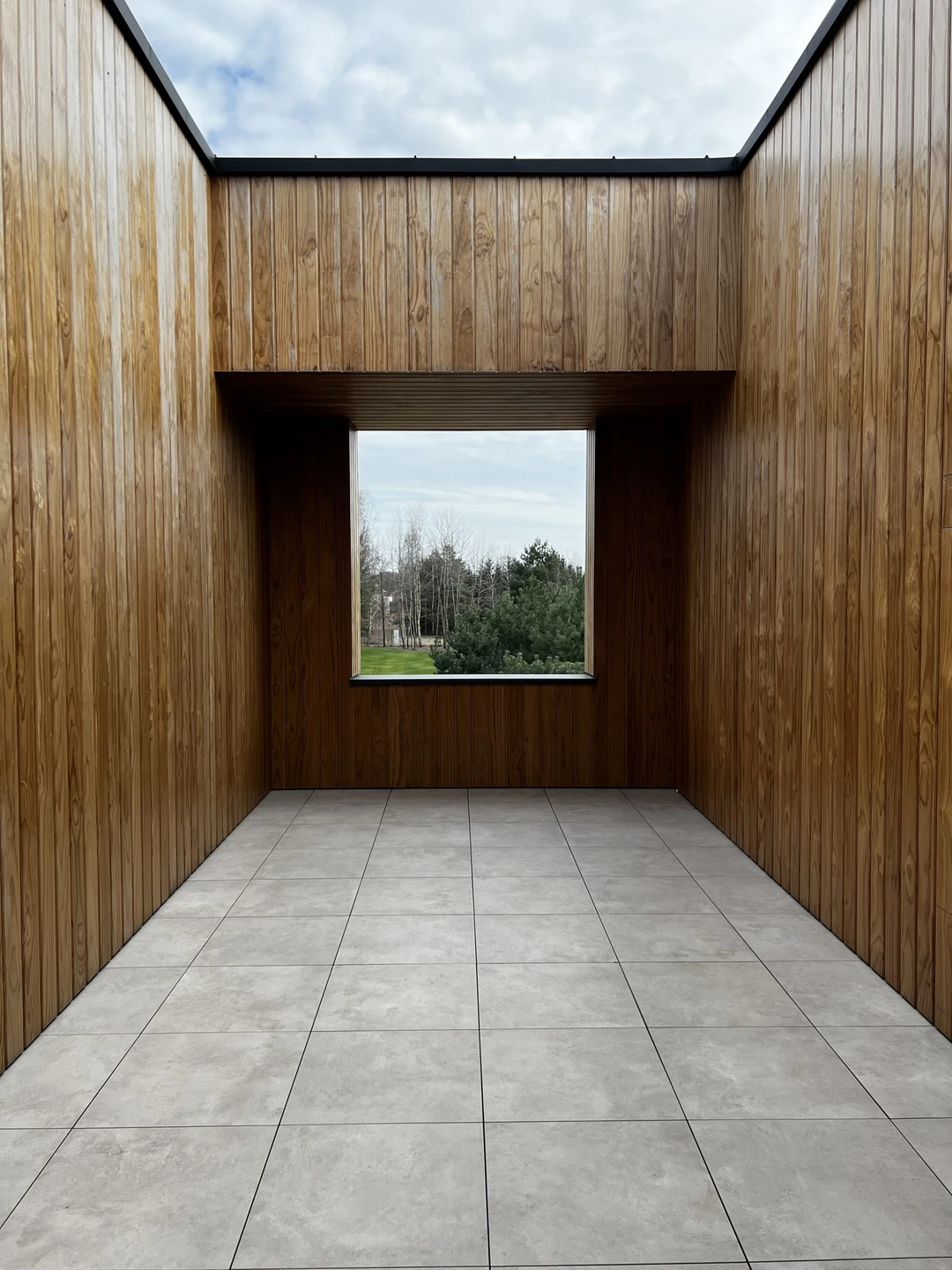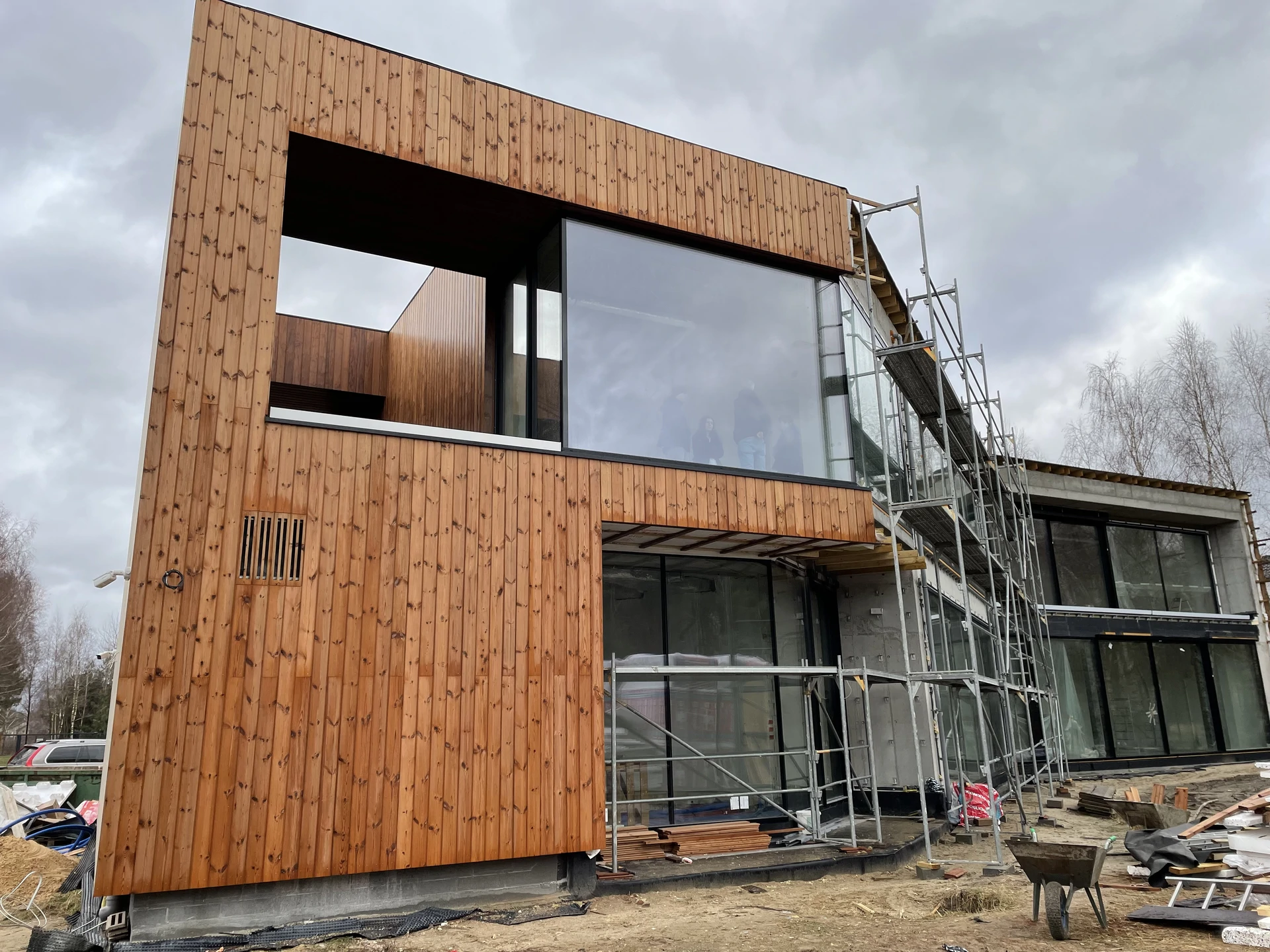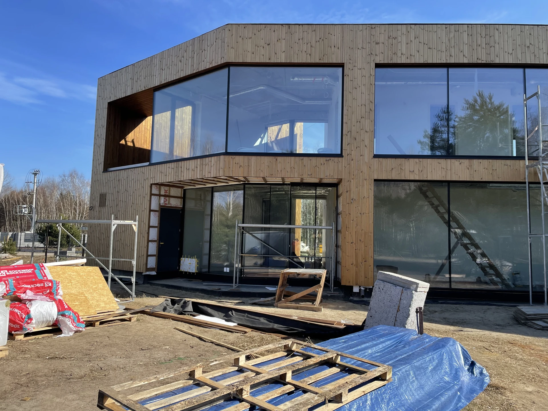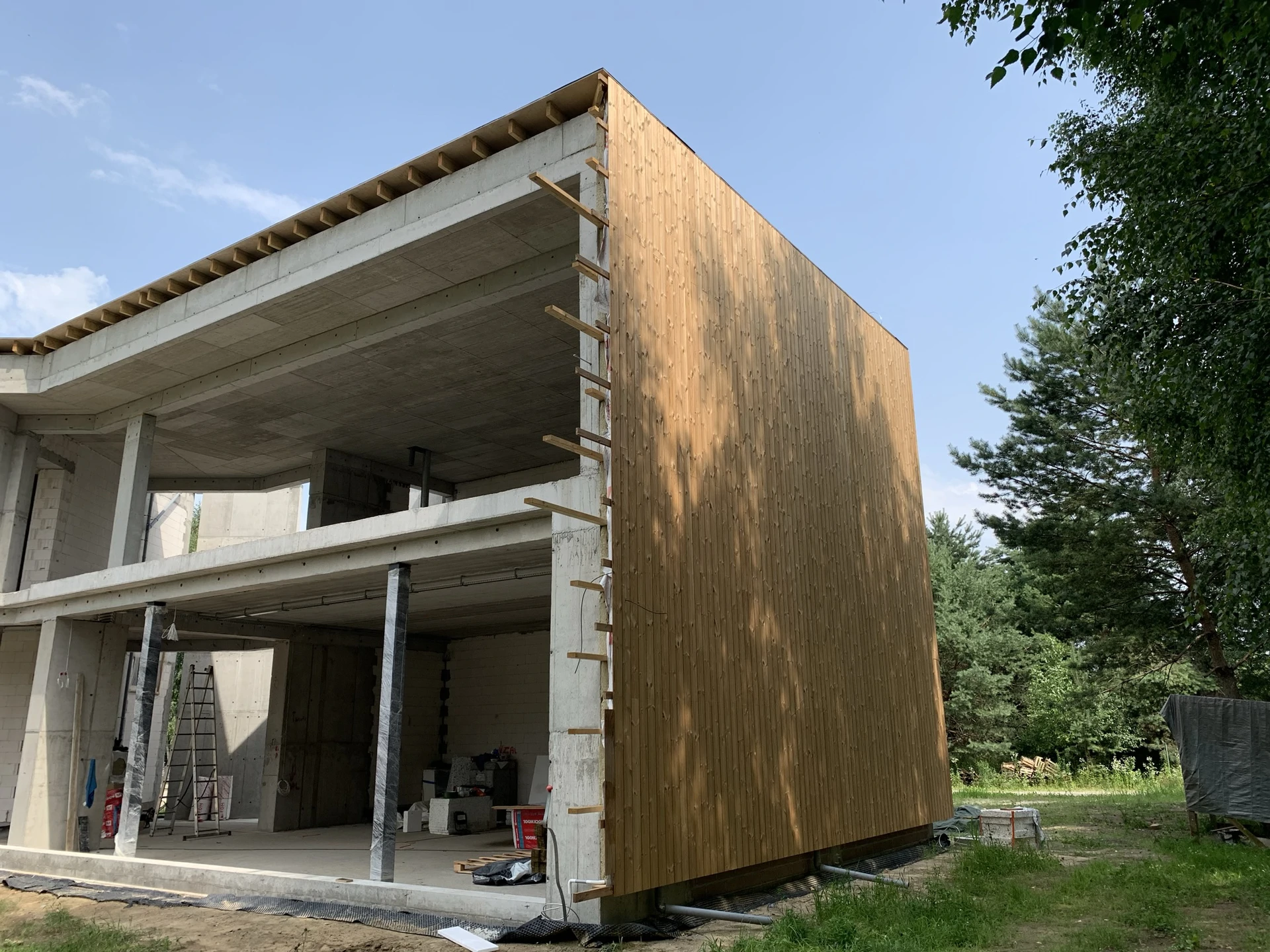 Elewacje wykończono drewnianą okładziną pionową, a charakter techniczny budynku