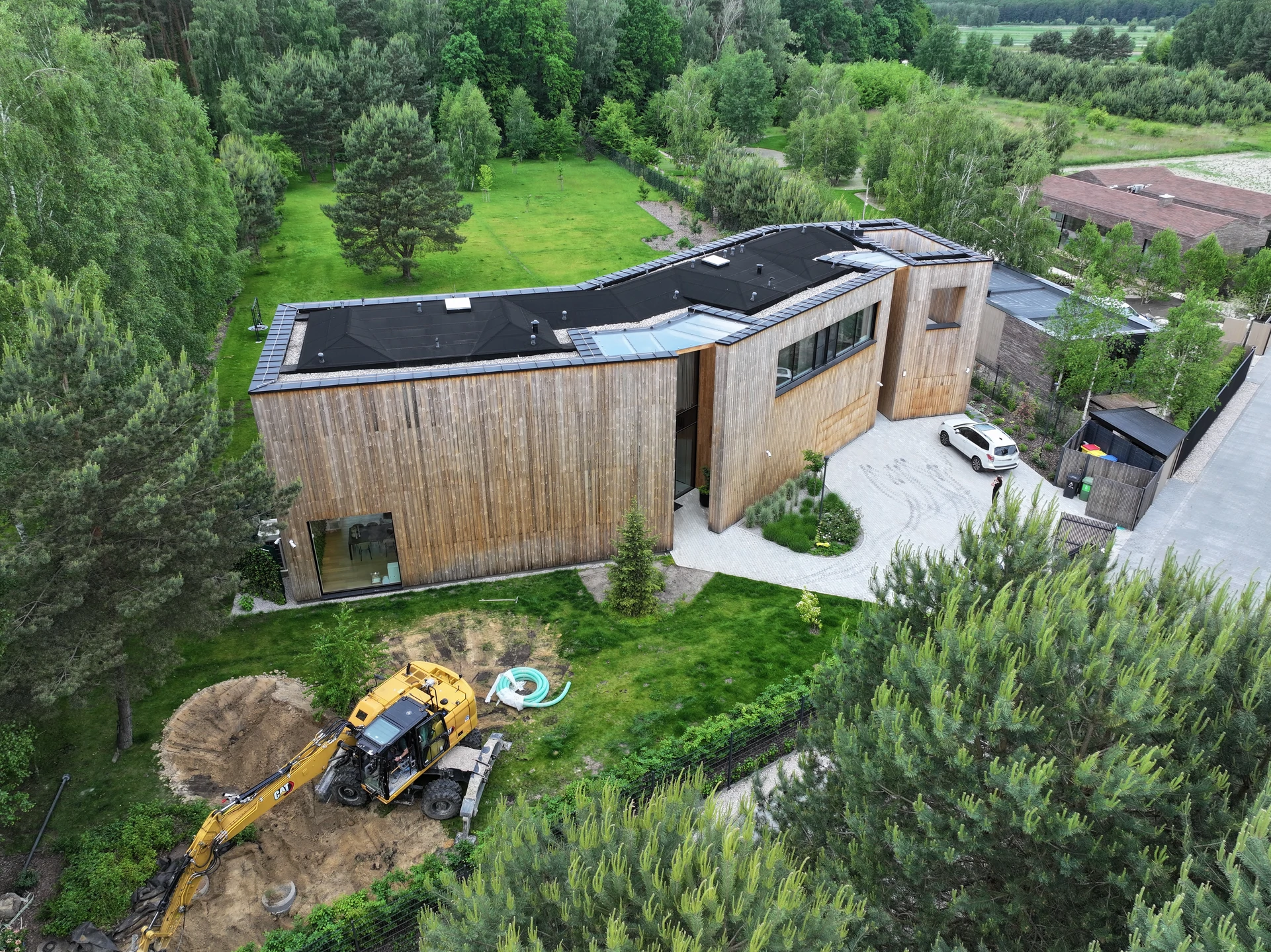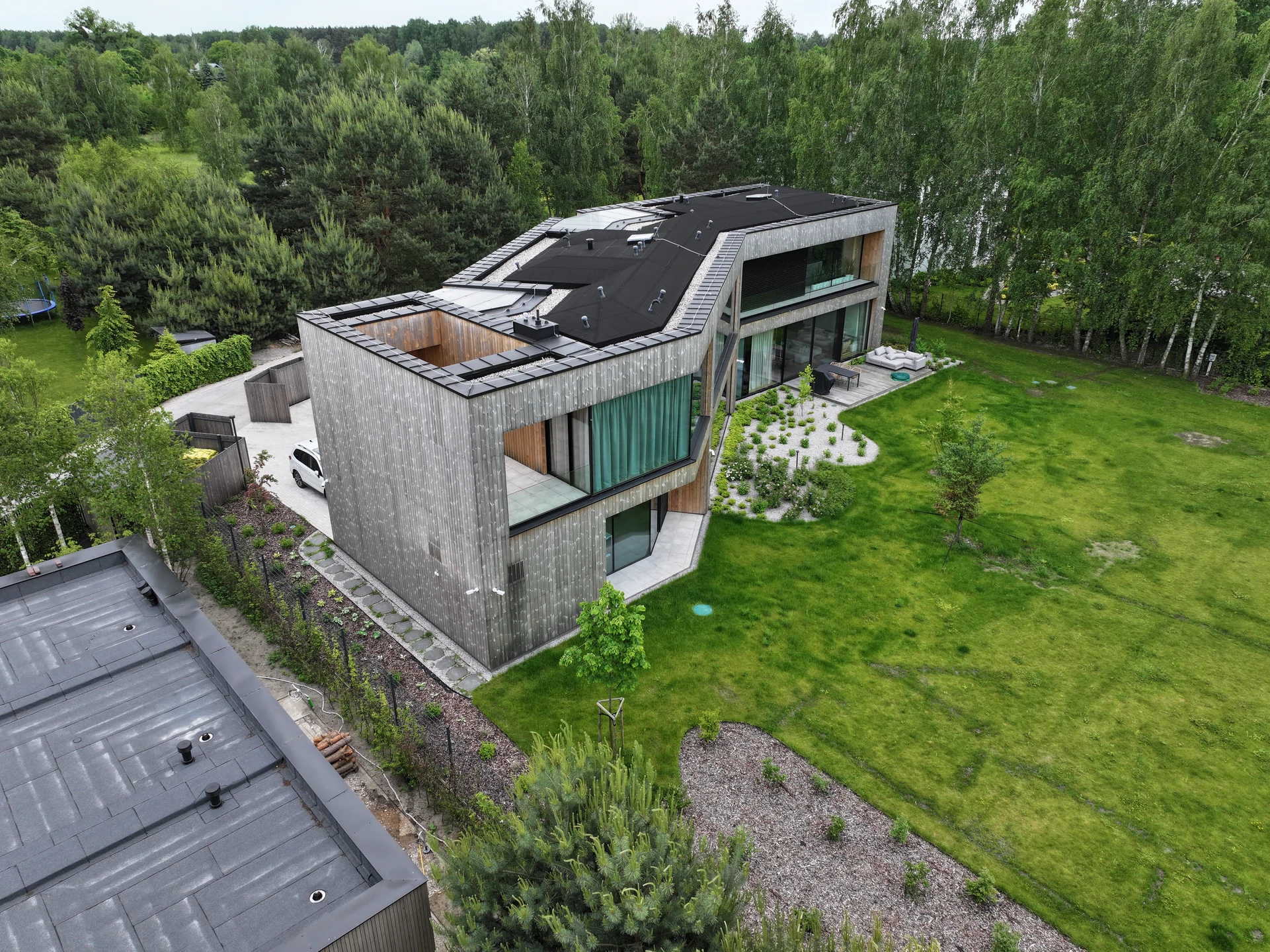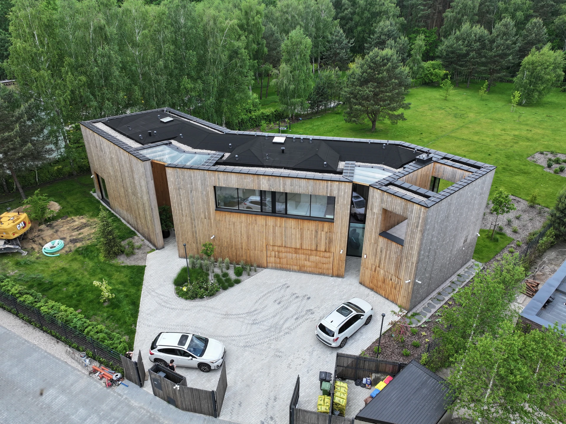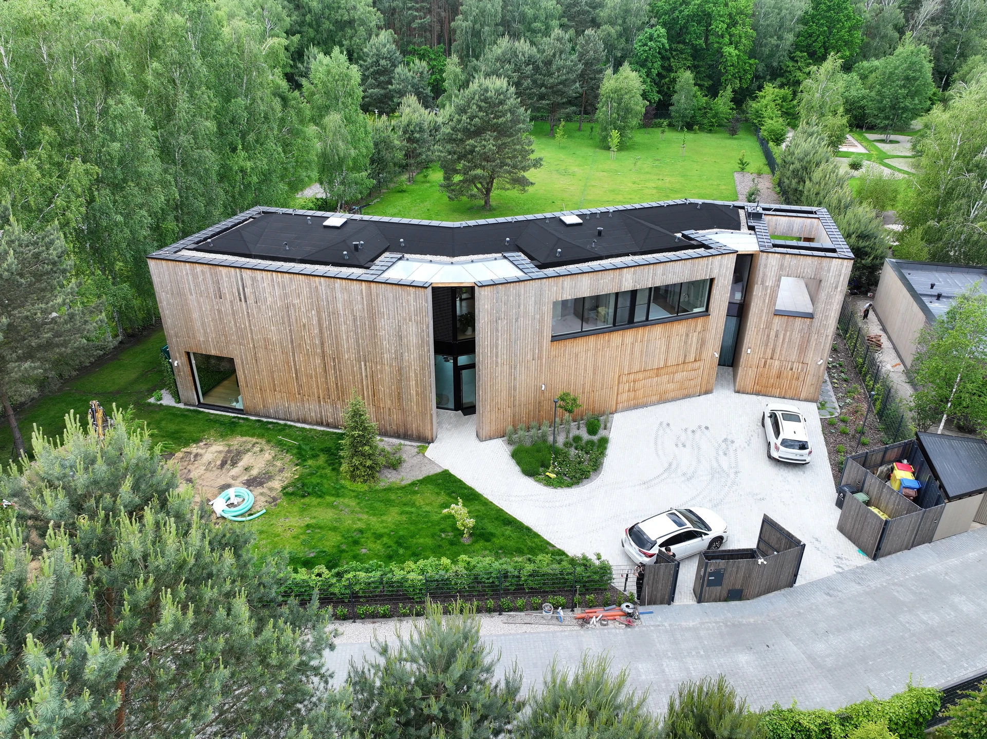 wokół domu wykończono w sposób minimalistyczny: utwardzony podjazd, opaski komunikacyjne oraz