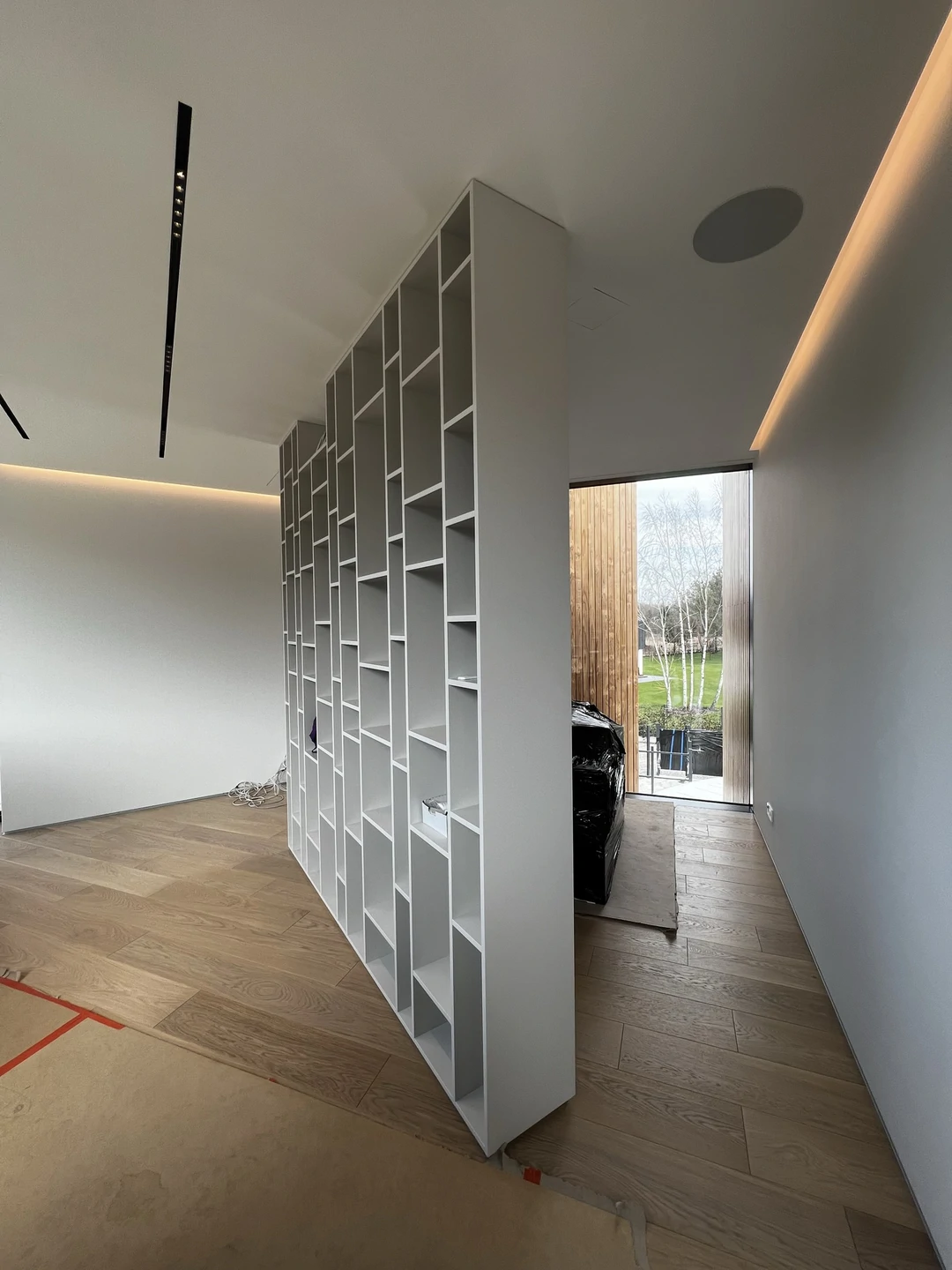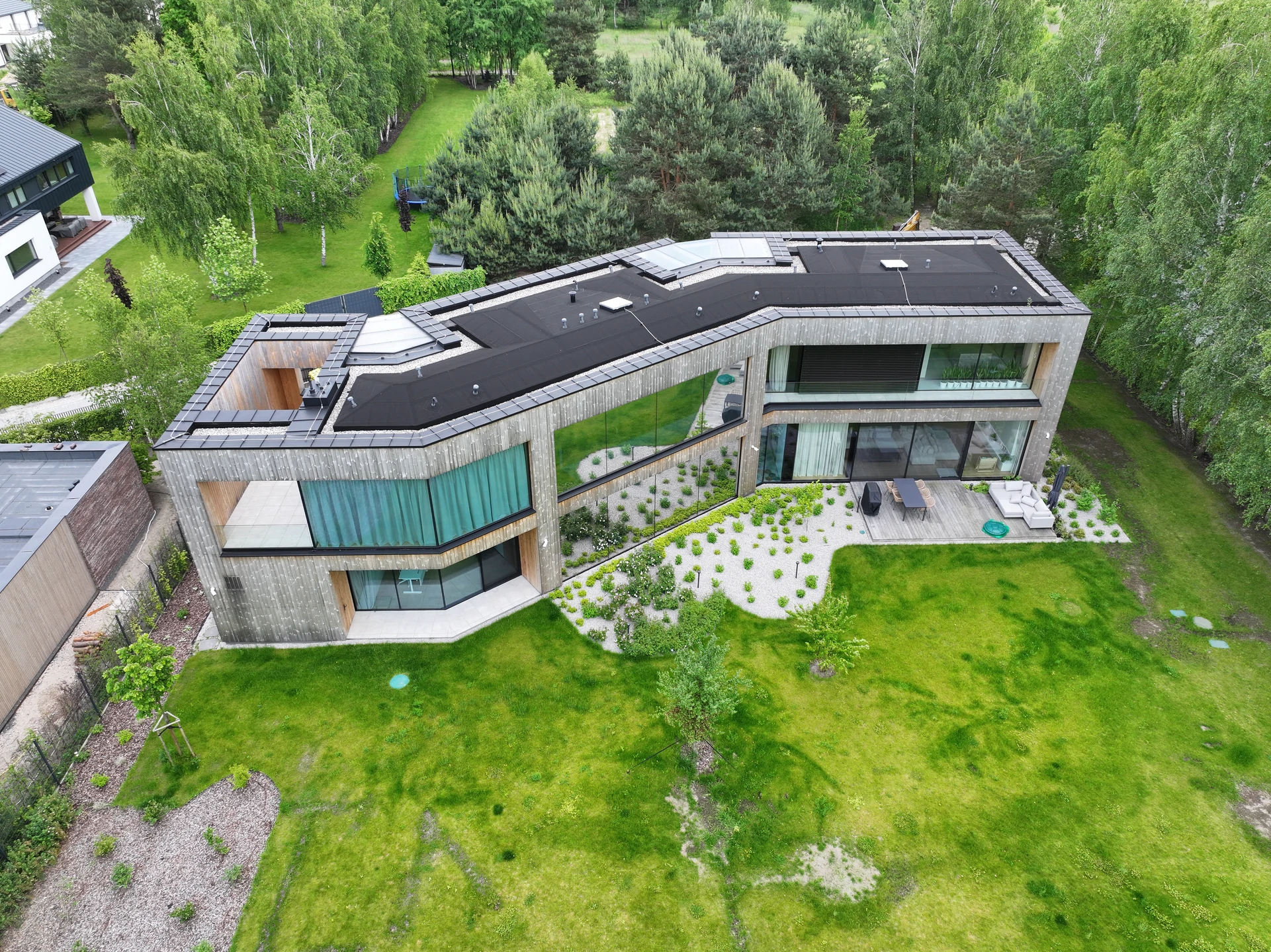 która porządkuje strefy funkcjonalne i kieruje główne otwarcia na ogród. Obiekt posadowiono