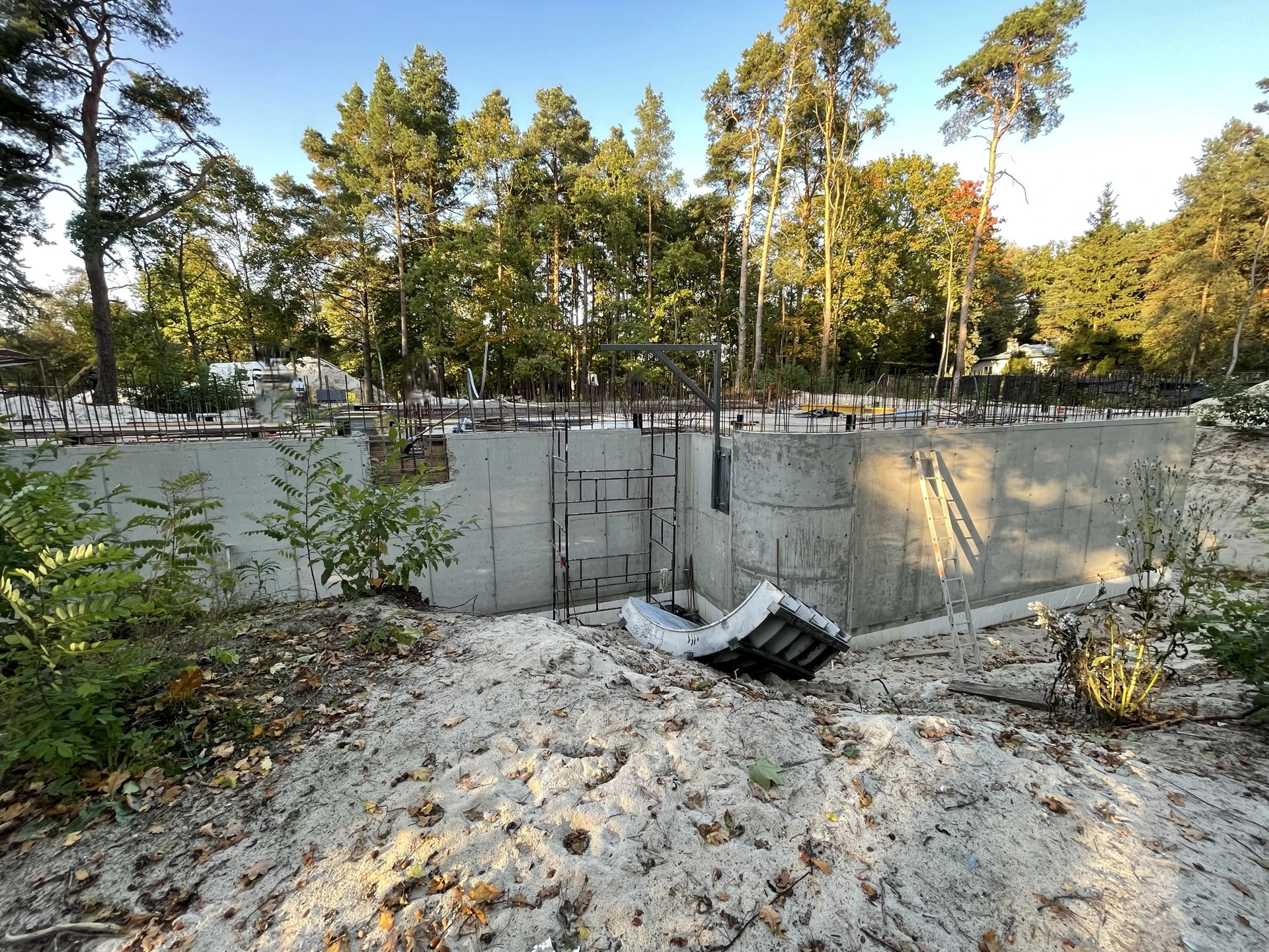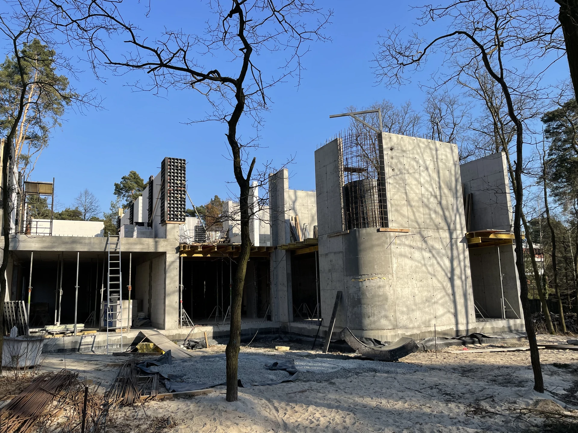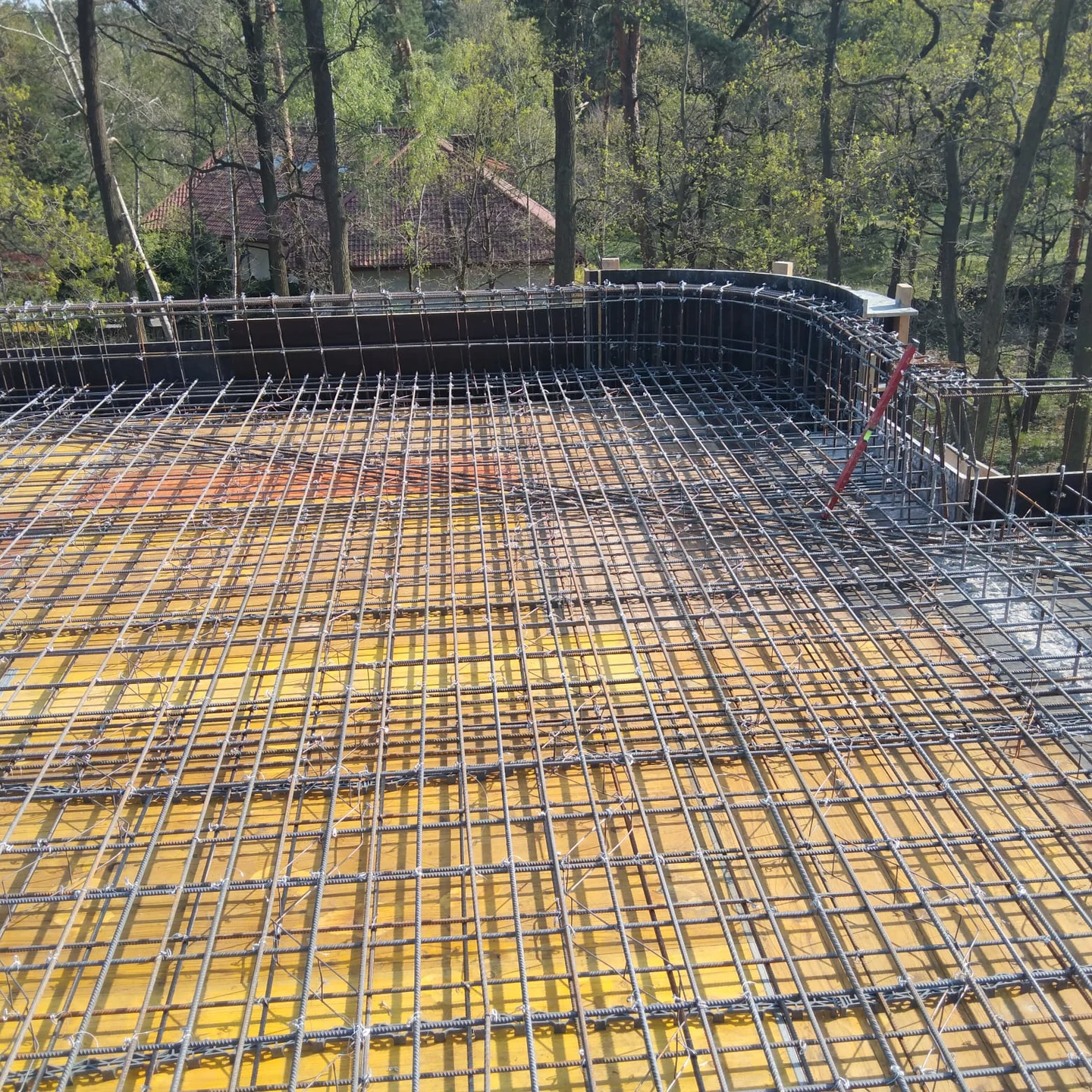 rozbudowanej konstrukcji żelbetowej, w tym ścian piwnicy, ścian oporowych zjazdu do garażu