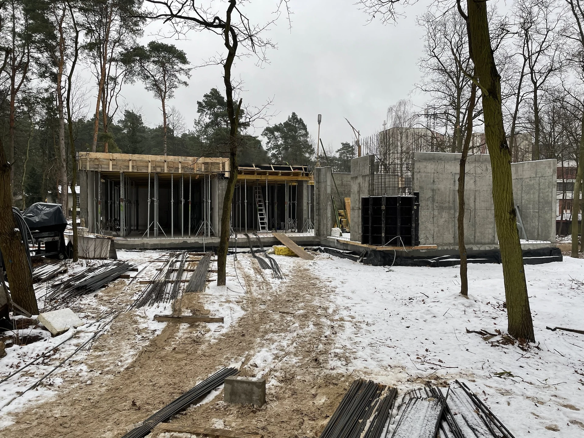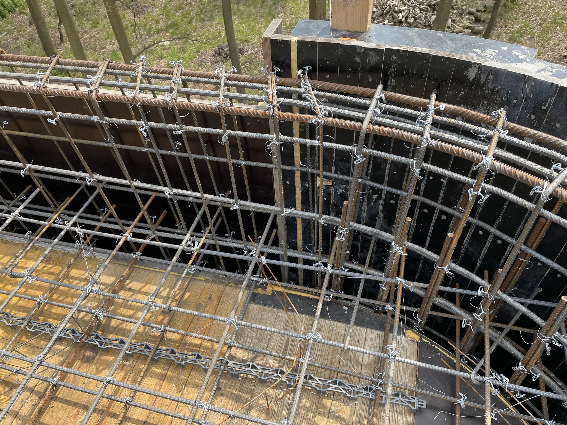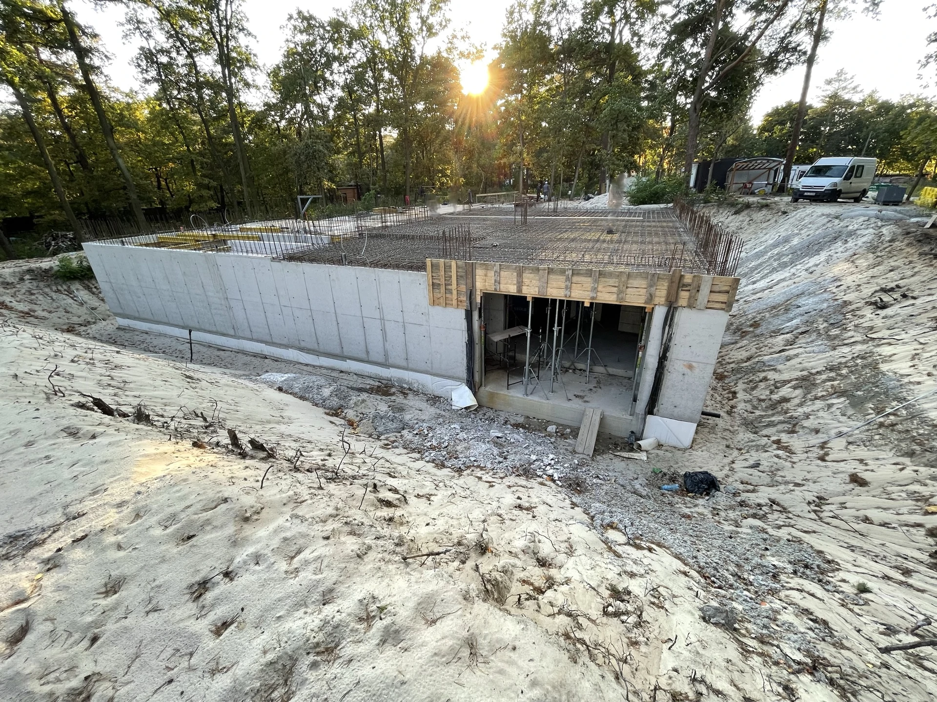 rozbudowanej konstrukcji żelbetowej, w tym ścian piwnicy, ścian oporowych zjazdu do garażu