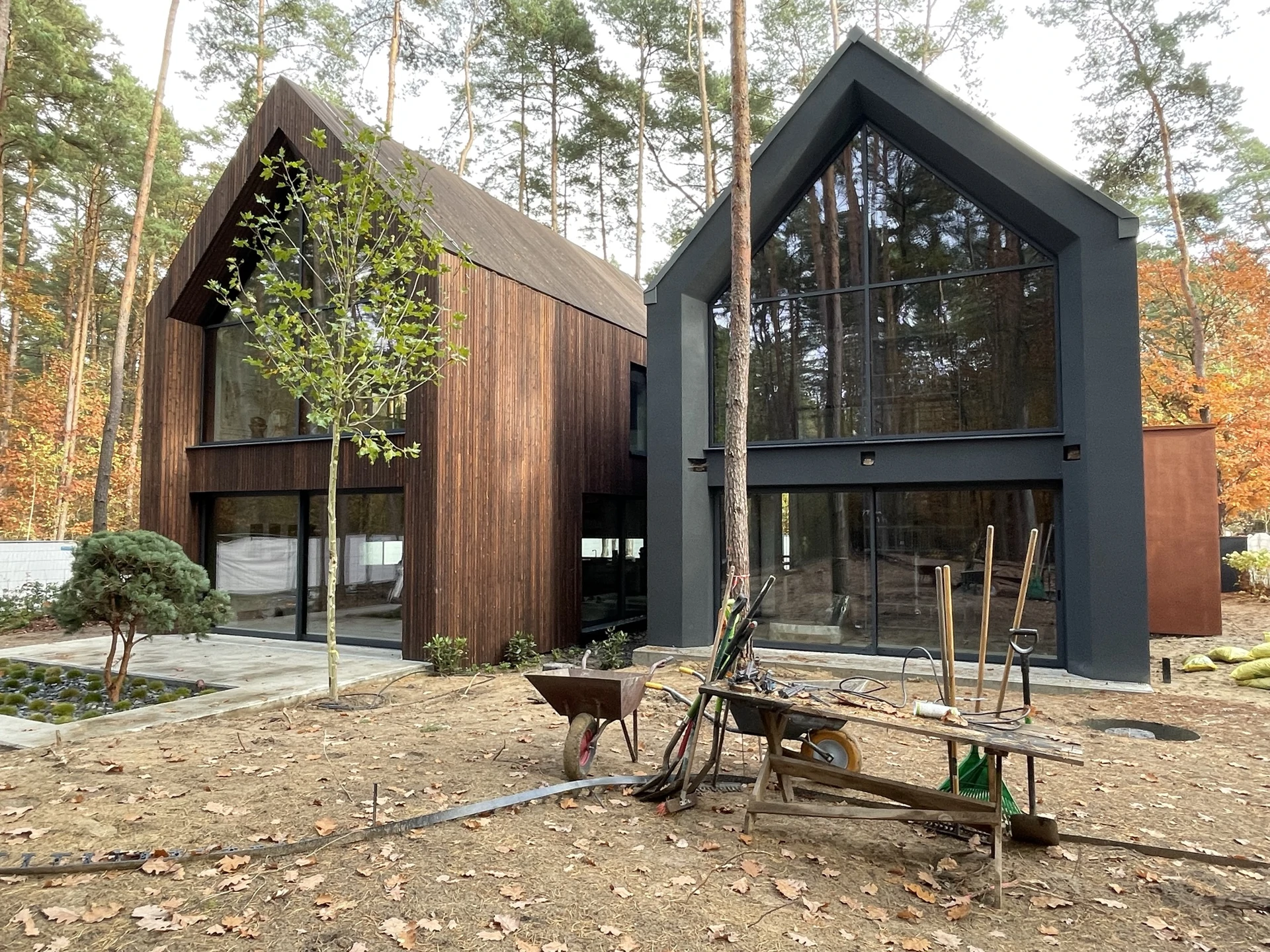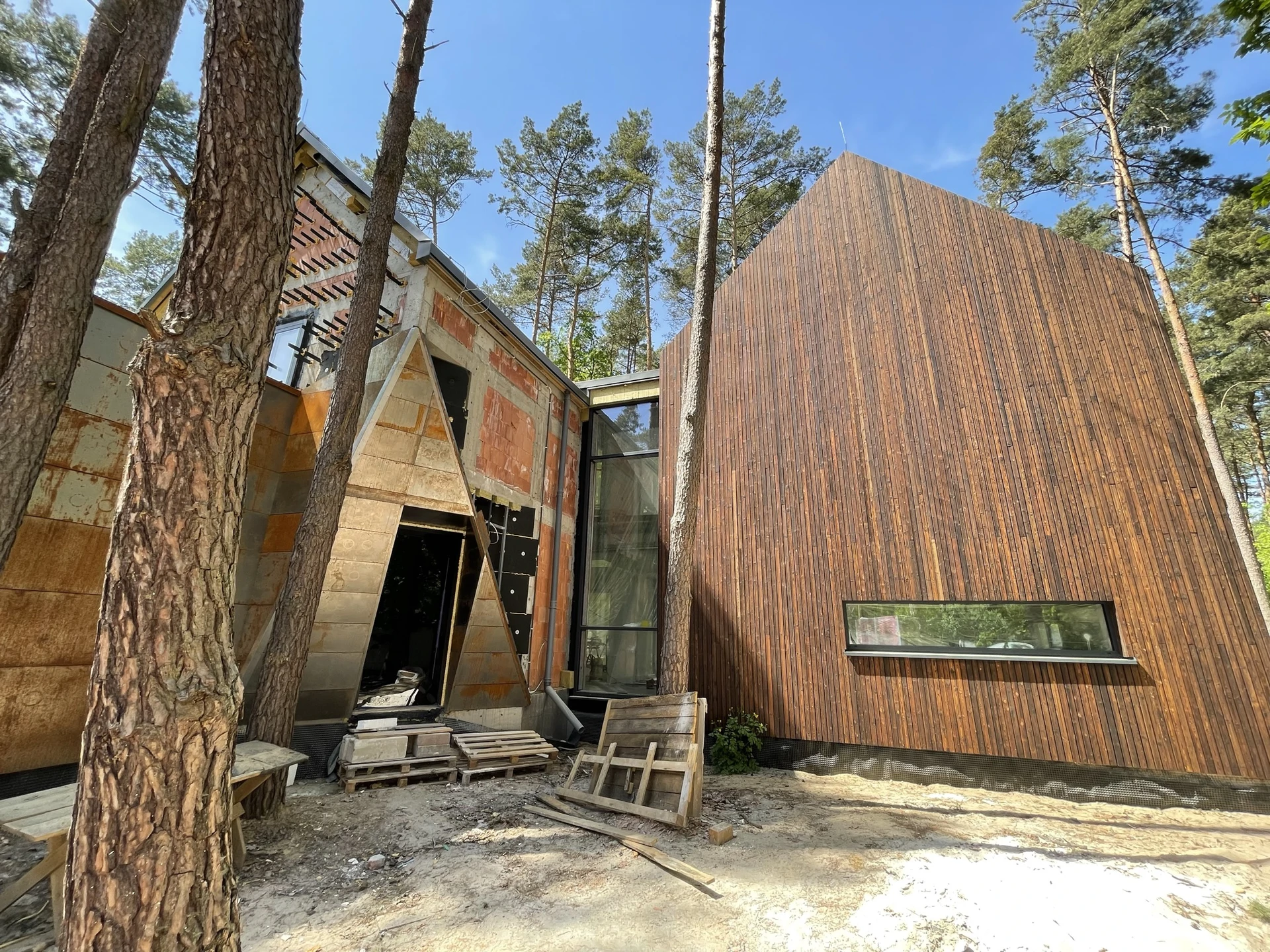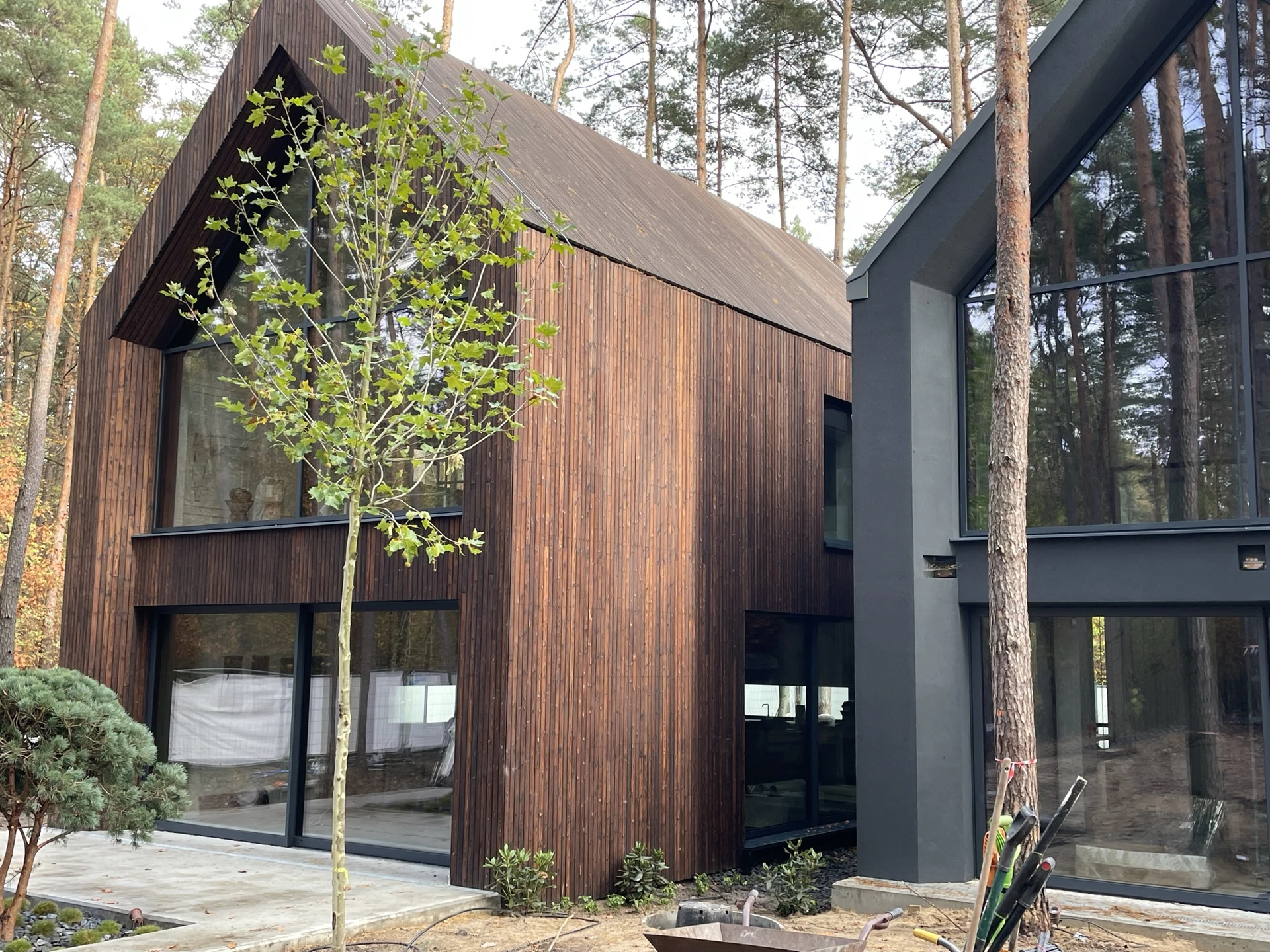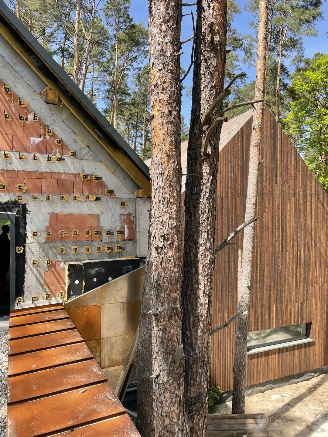 Elewacje wykończono drewnem, ciemnym tynkiem oraz okładziną w kolorze cortenu, a duże przeszklenia otwierają wnętrza na leśne otoczenie.