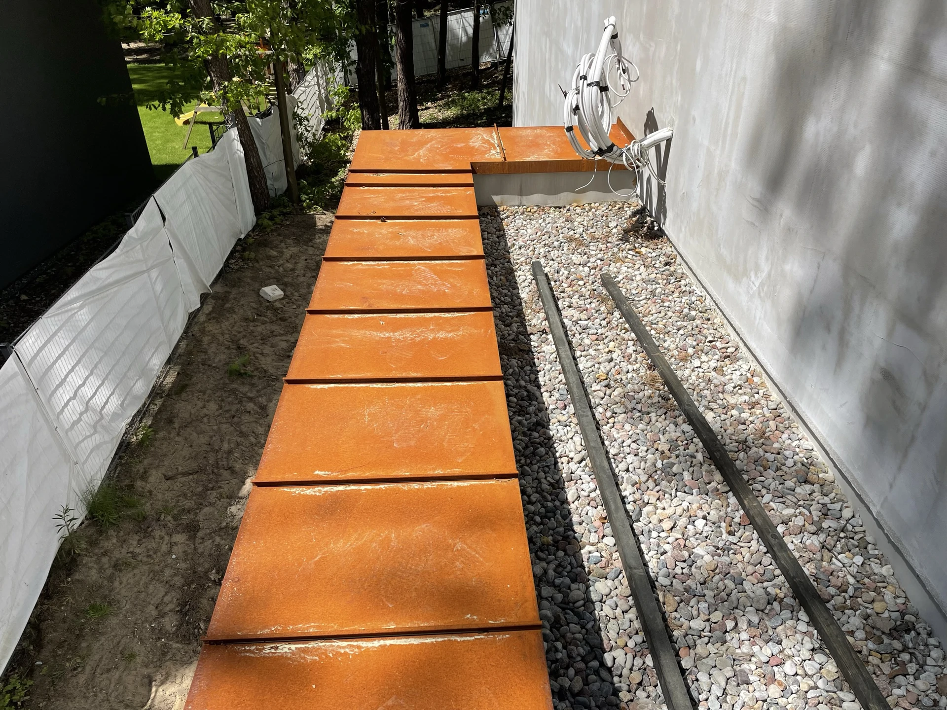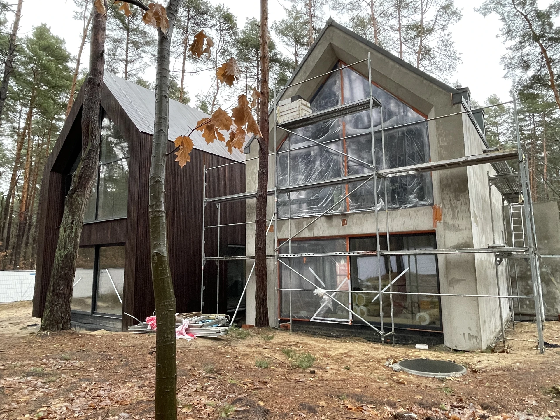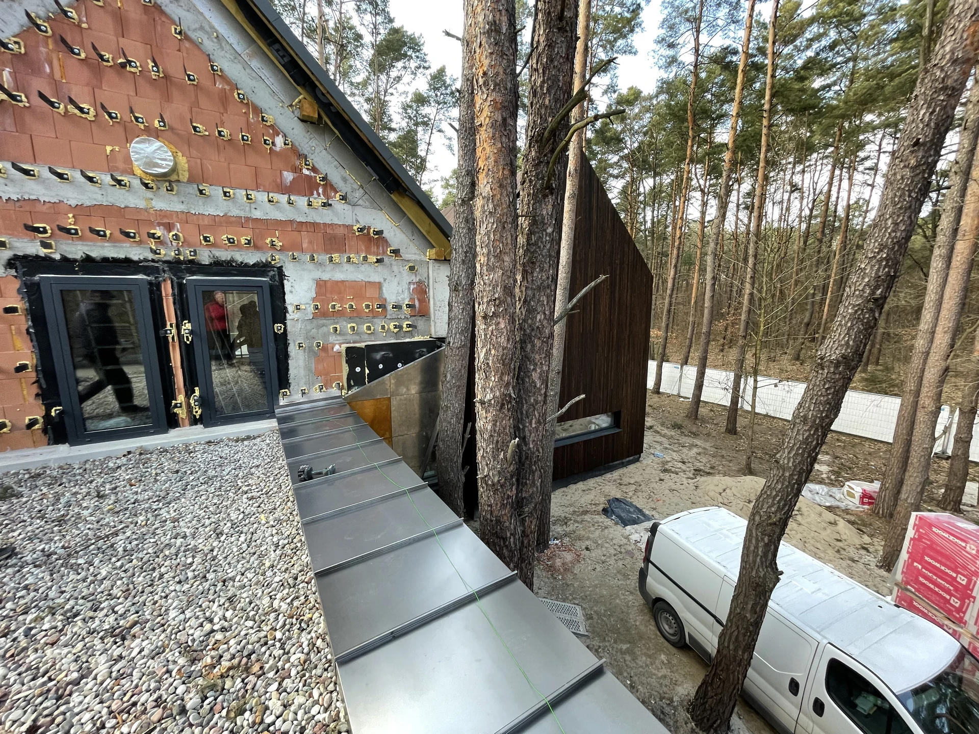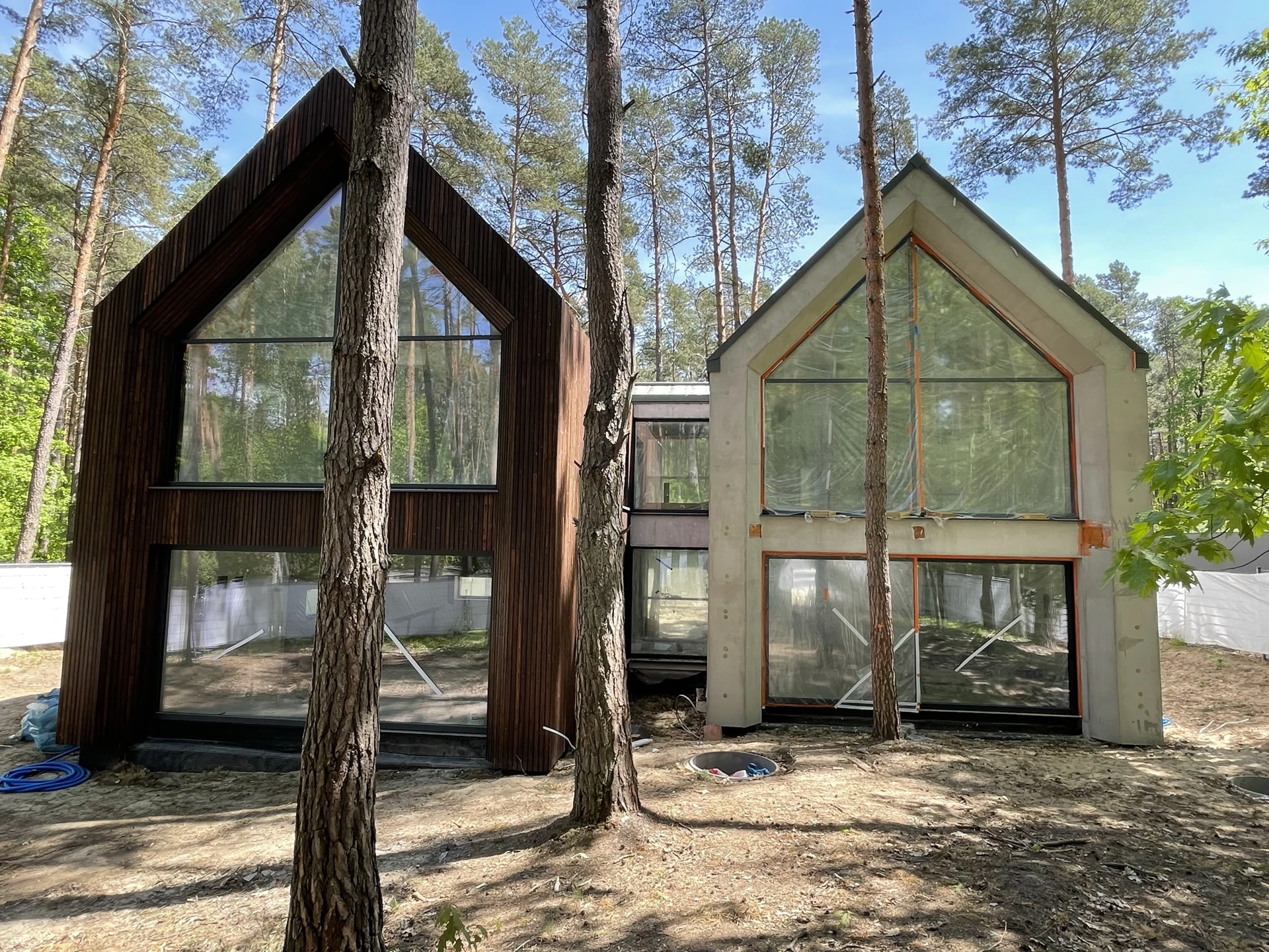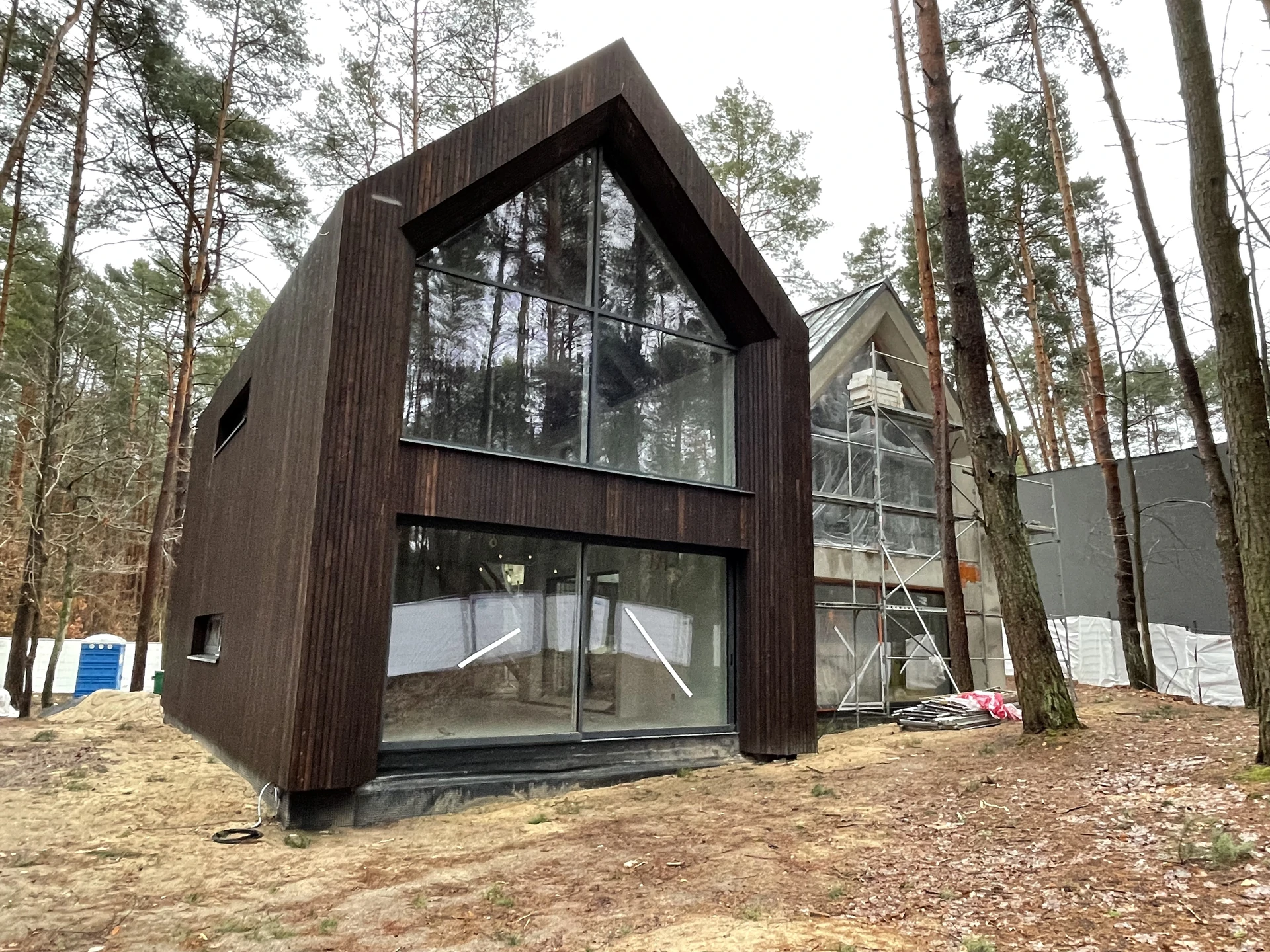 Elewacje wykończono drewnem, ciemnym tynkiem oraz okładziną w kolorze cortenu, a duże przeszklenia otwierają wnętrza na leśne otoczenie.
