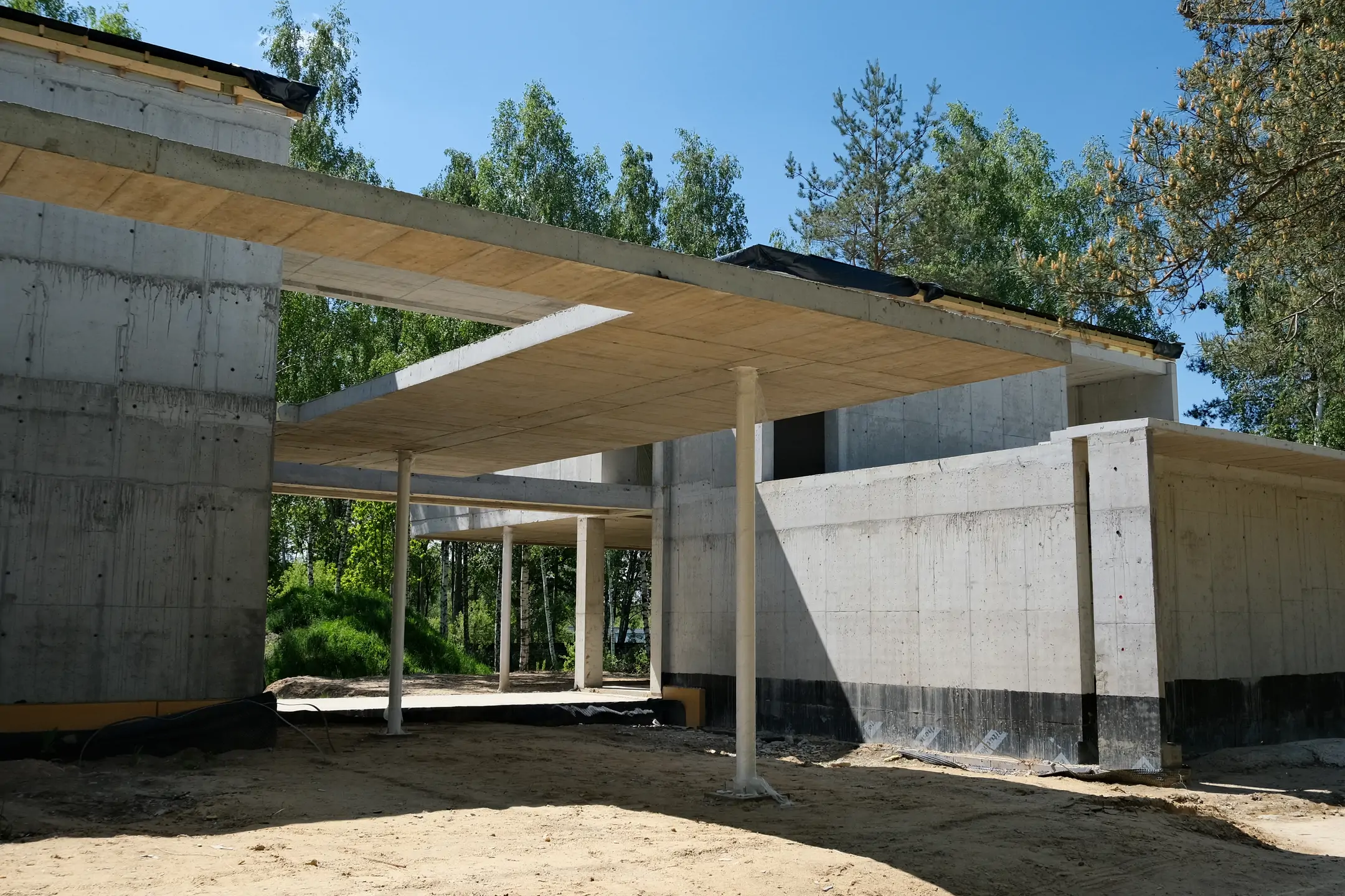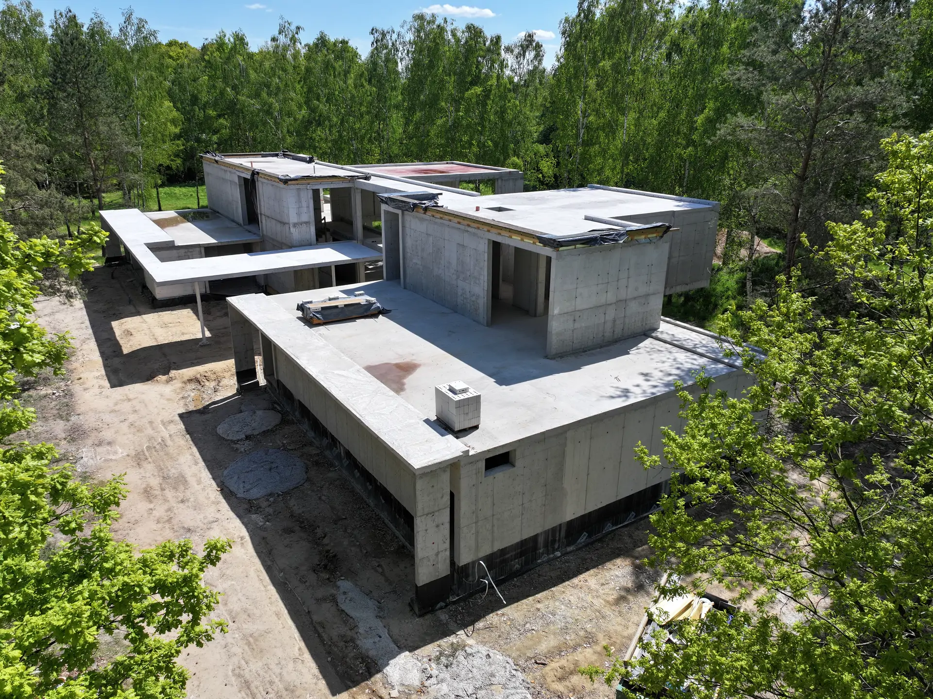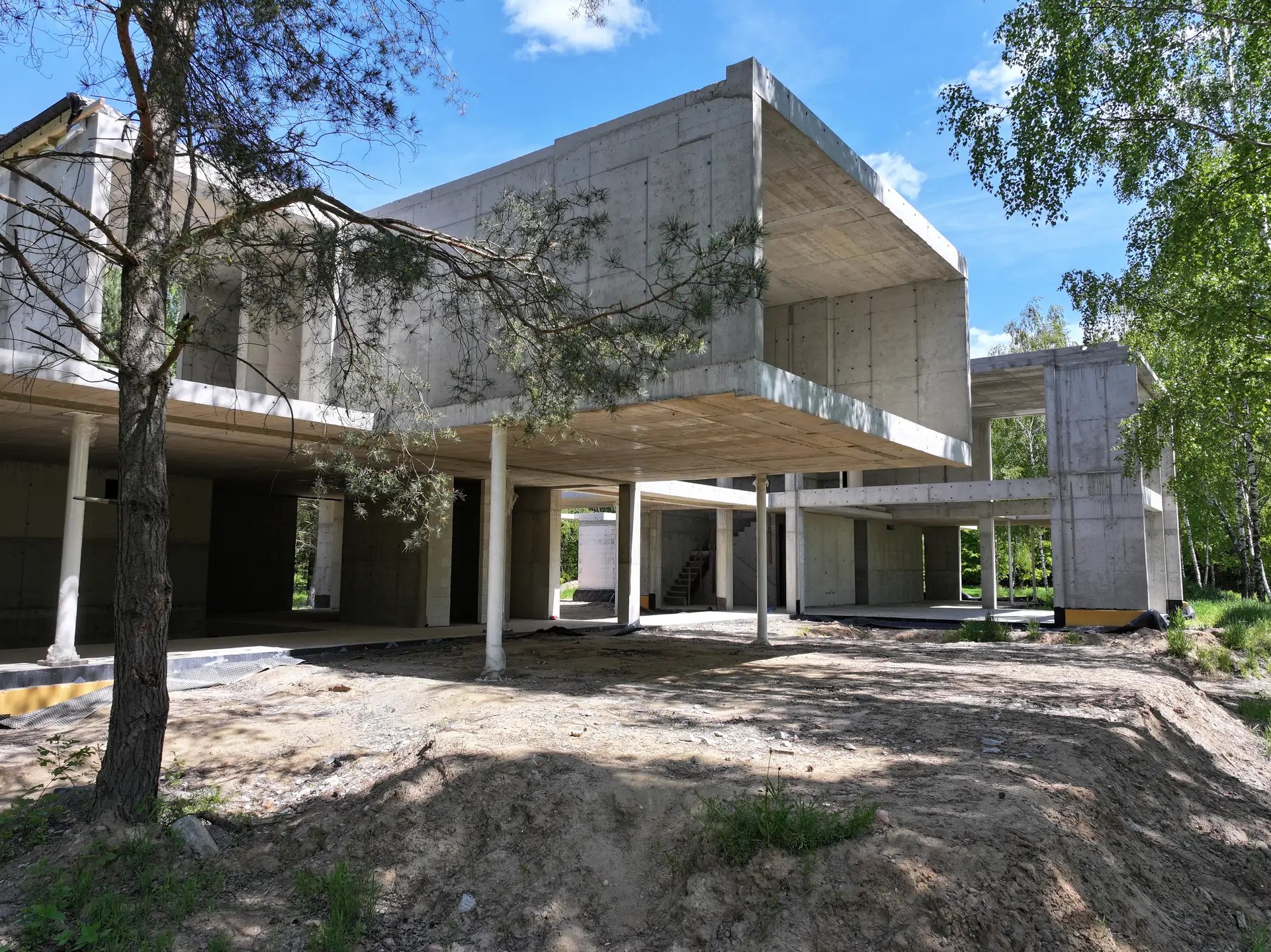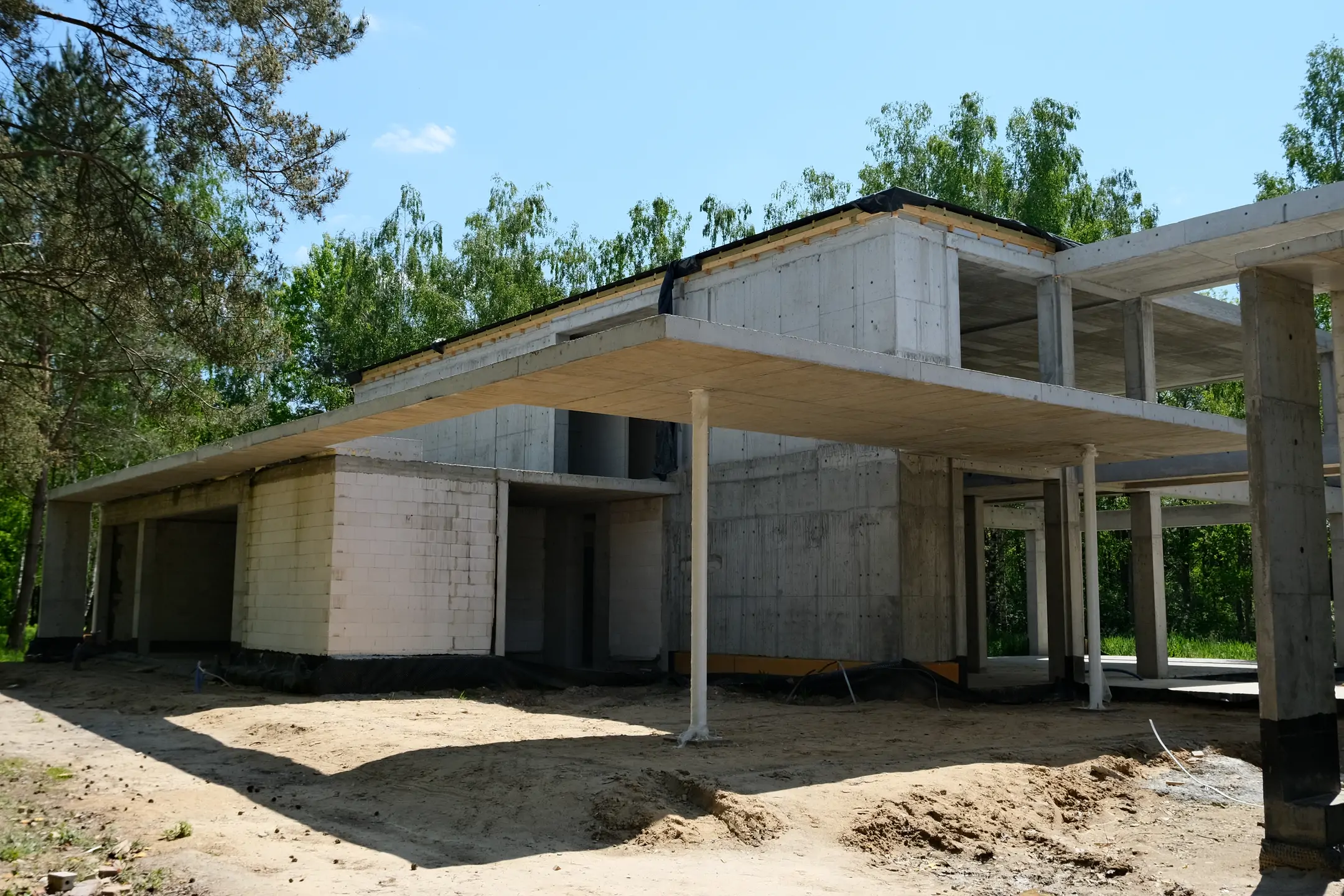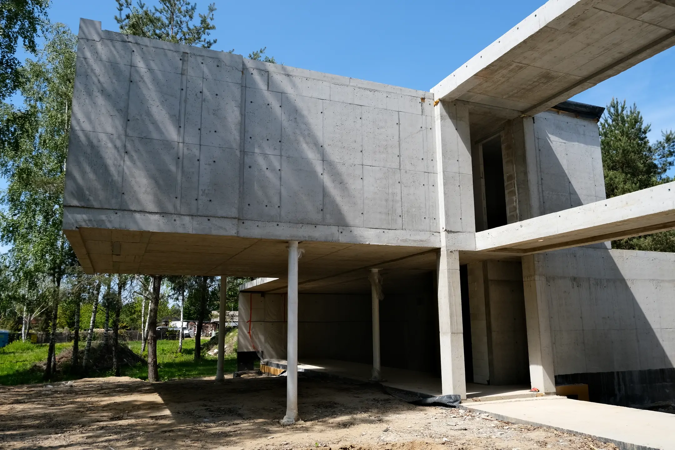 Realizacja w Kamionce obejmowała budowę nowoczesnego budynku jednorodzinnego o powierzchni 545 m², z rozbudowaną konstrukcją żelbetową i wymagającym zakresem robót konstrukcyjnych. Inwestycja została zaprojektowana jako obiekt o minimalistycznej bryle, dużych rozpiętościach, licznych nadwieszeniach oraz szerokich podcieniach, co wymagało precyzyjnego wykonania elementów nośnych i bardzo dokładnej koordynacji prac na etapie stanu surowego.
