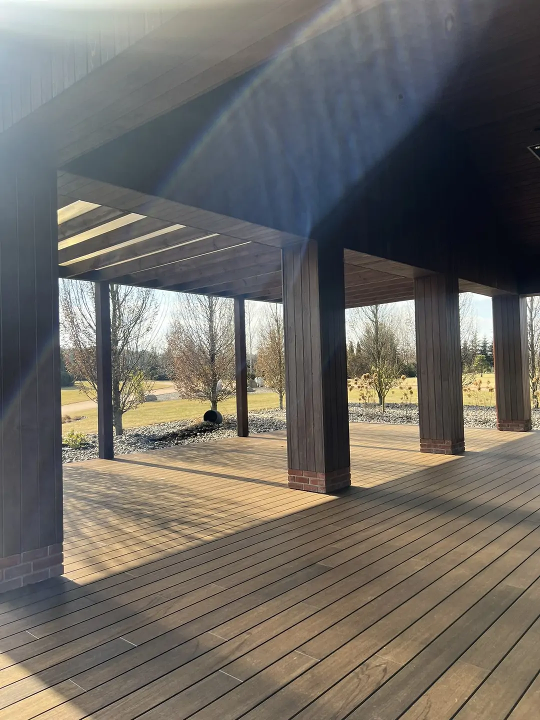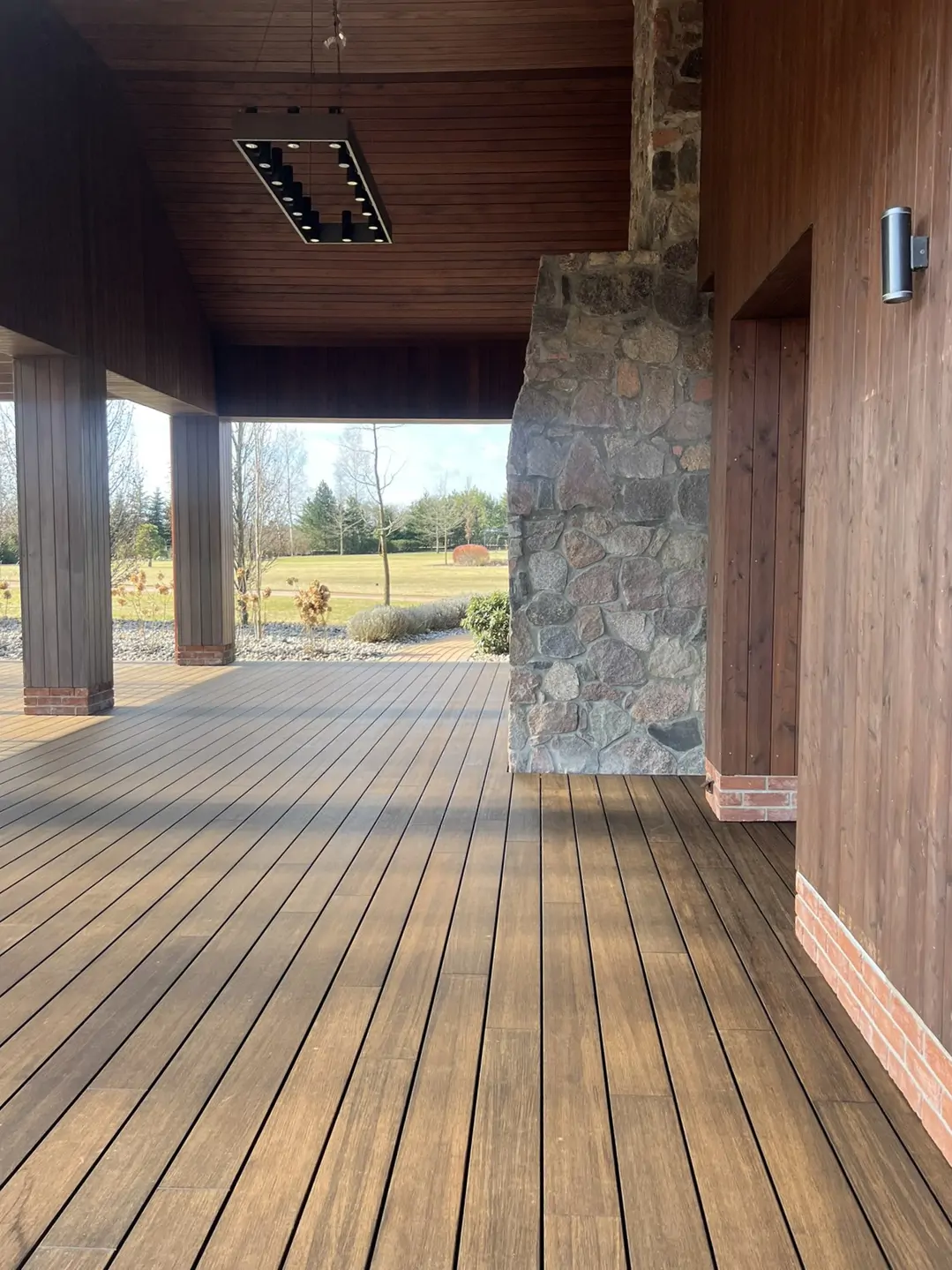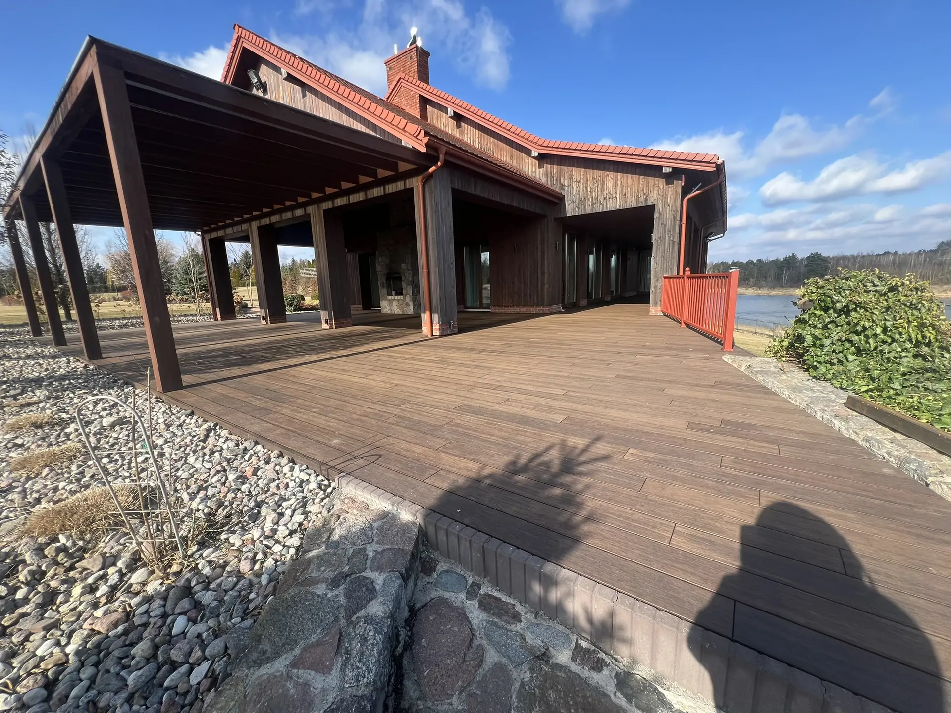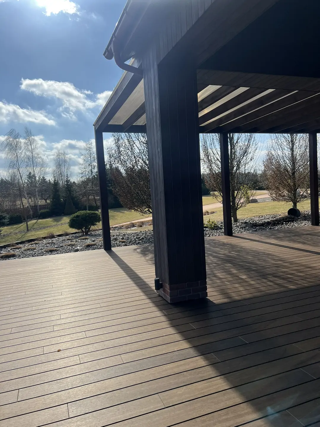 Podczas rozbiórek tarasu okazało się, że pod kominem nie ma poprawnie zrobionego fundamentu. Wzmocniliśmy fundament pod kominem oraz ułożyliśmy na nowo 202,5 m2 tarasu. Taras wykonany na legarach aluminiowych a deska tarasowa - moso bamboo.