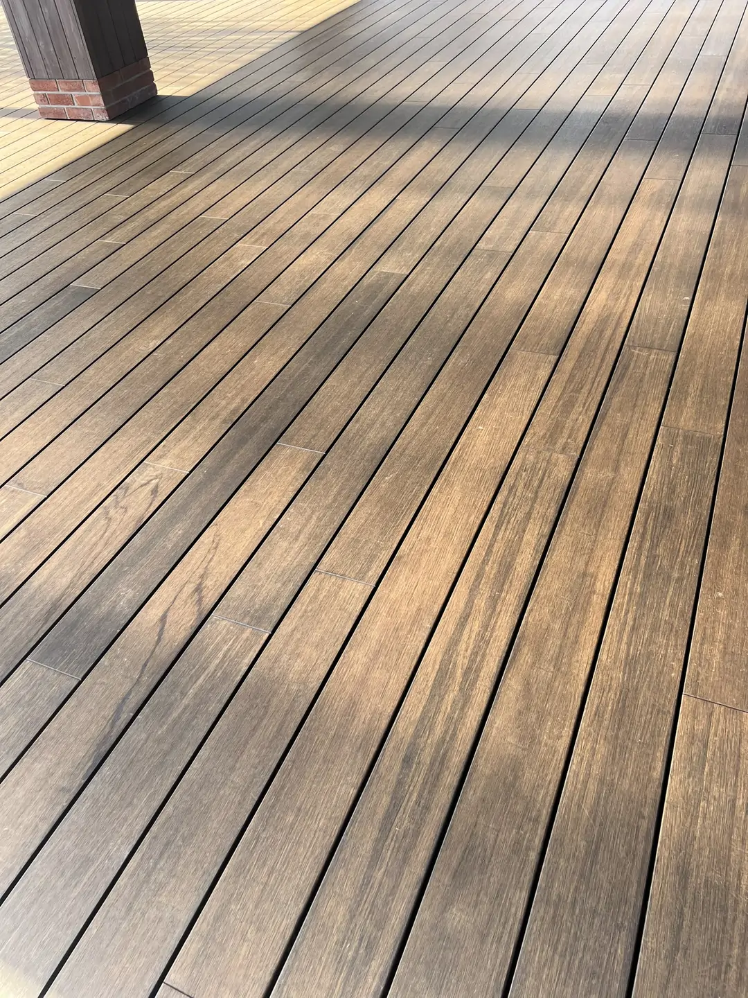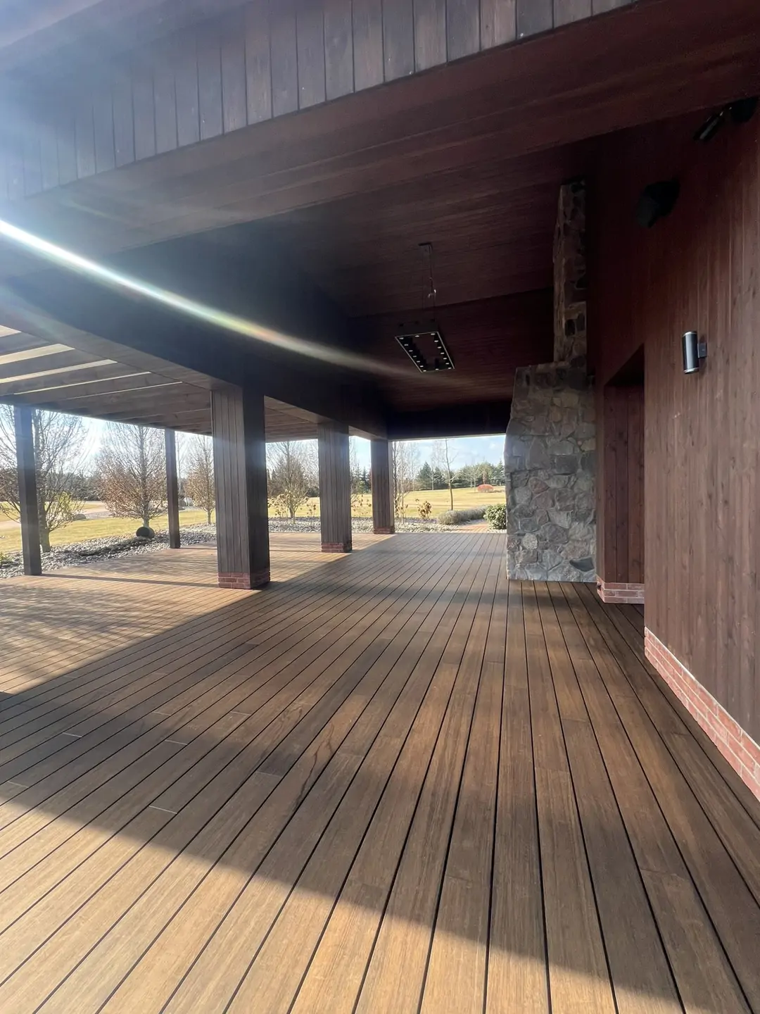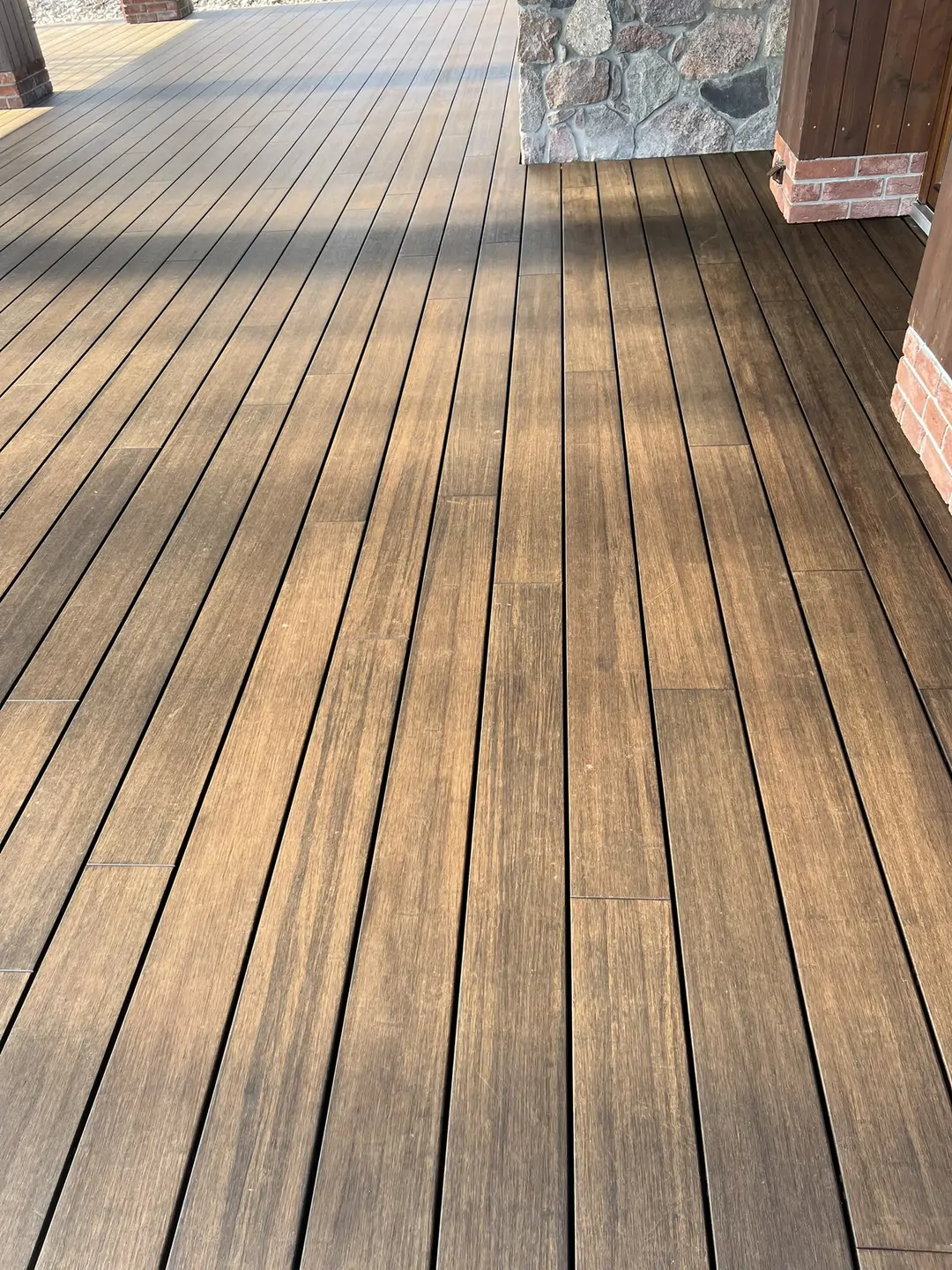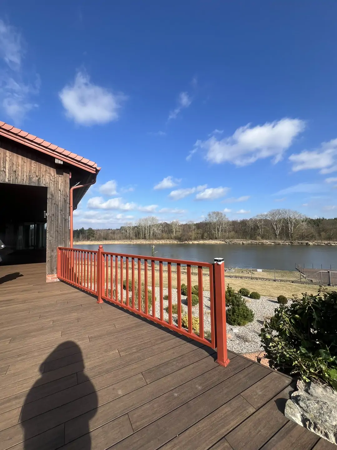 Podczas rozbiórek tarasu okazało się, że pod kominem nie ma poprawnie zrobionego fundamentu. Wzmocniliśmy fundament pod kominem oraz ułożyliśmy na nowo 202,5 m2 tarasu. Taras wykonany na legarach aluminiowych a deska tarasowa - moso bamboo.