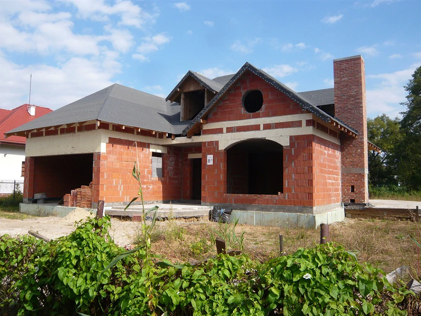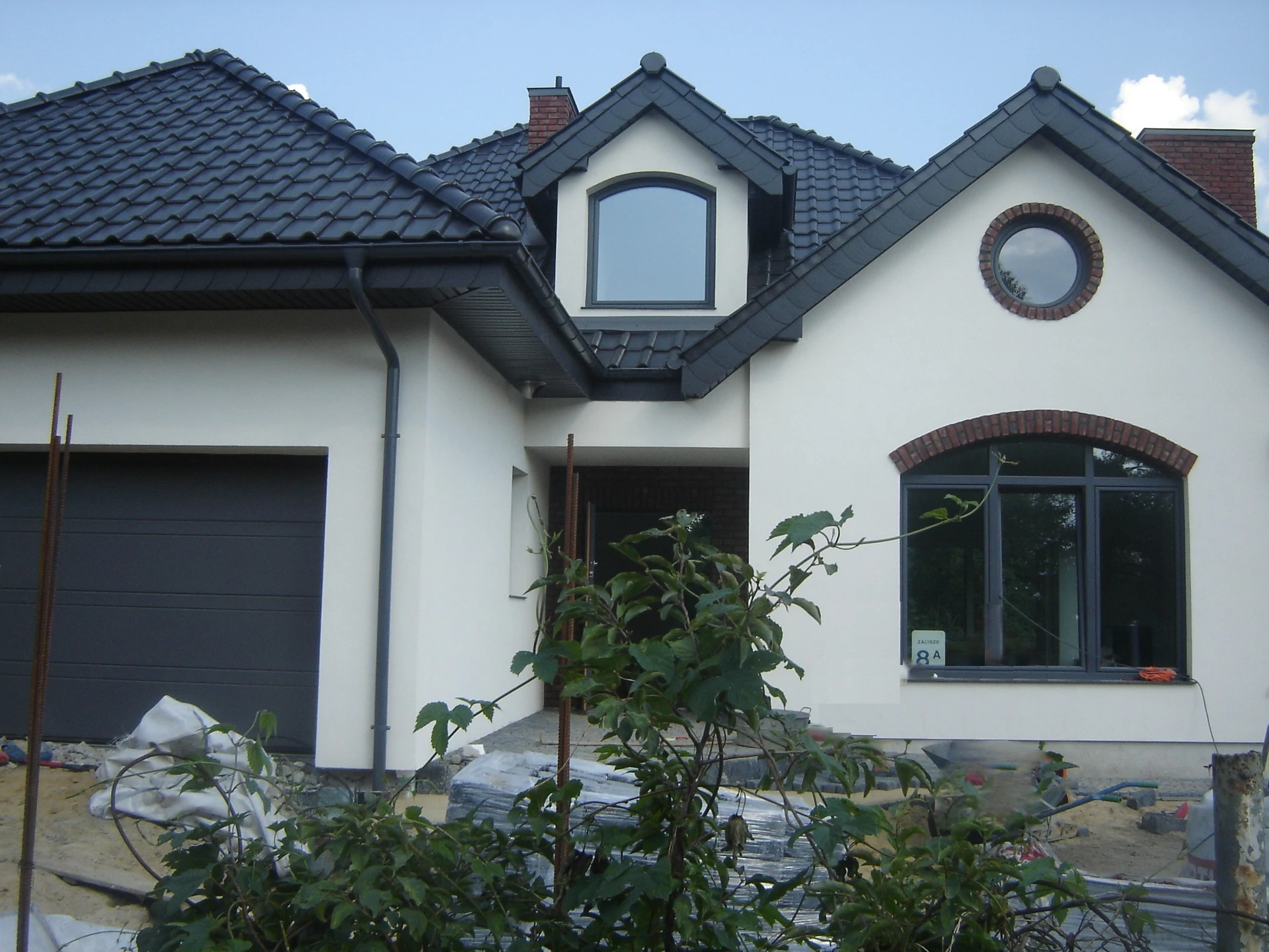 Projekt indywidualny. Grunty torfowe. Budynek posadowiony na studiach i płycie fundamentowej. Ściany wykonane z porothermu. Elewacja klinkier i BSO. Pokrycie dachowe blachodachówka.
