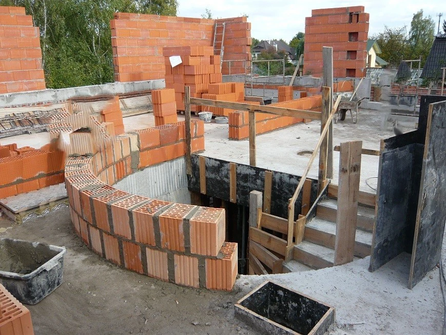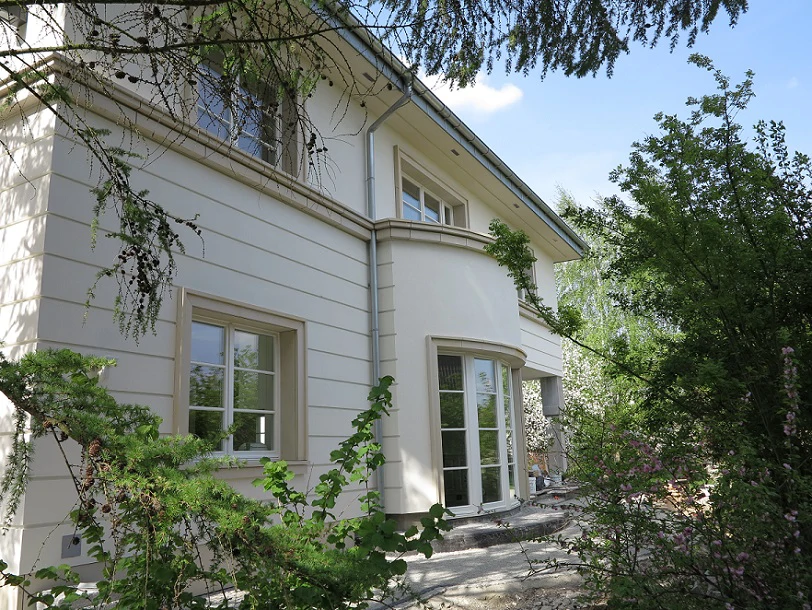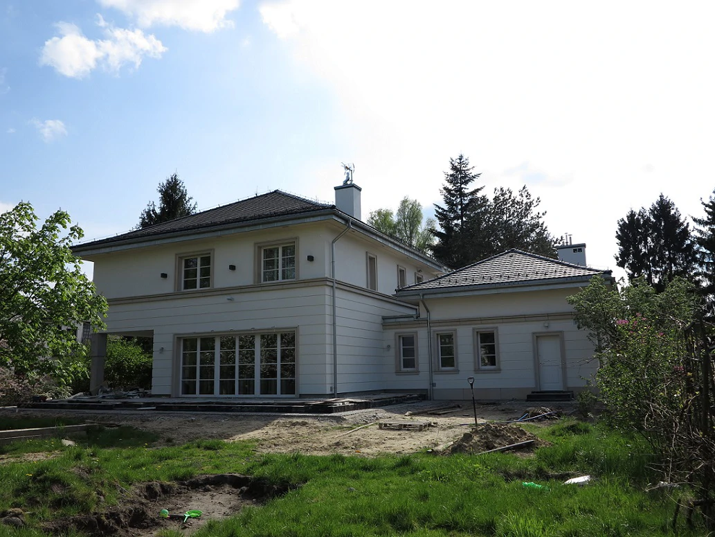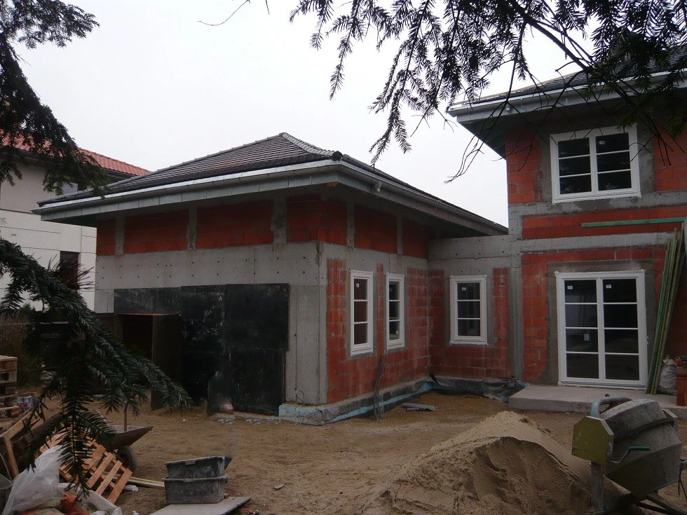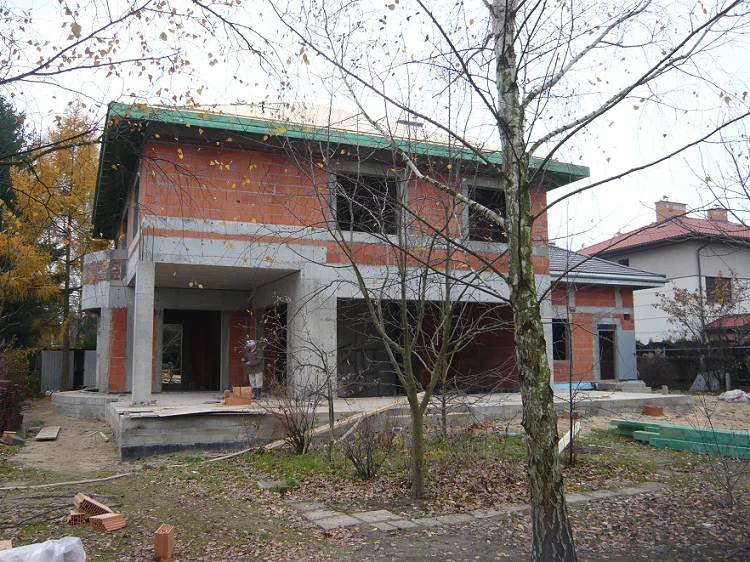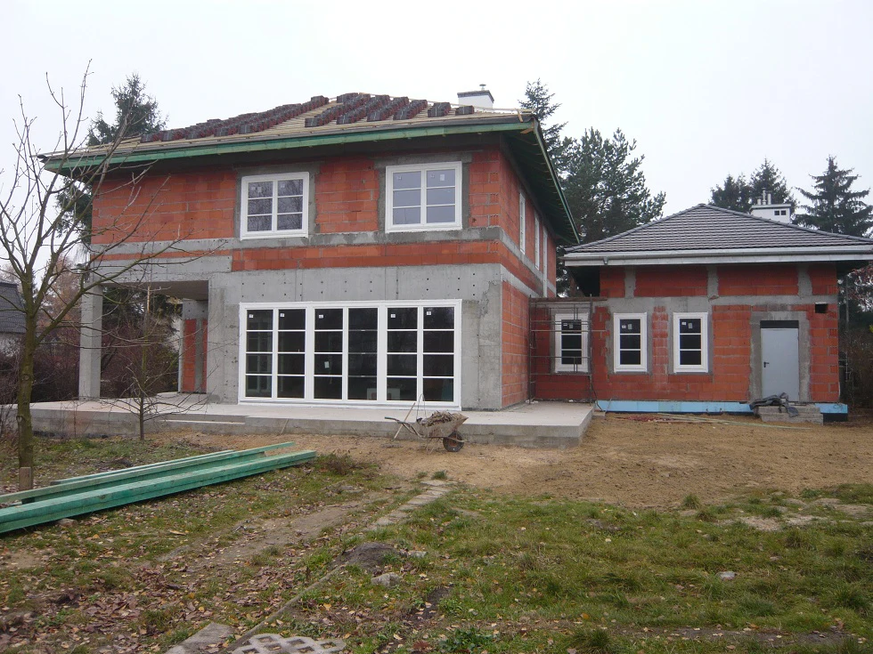 Projekt indywidualny. Budynek posadowiony na ławach fundamentowych żelbetowych z izolacją przeciwwilgociową. Ściany murowane z POROTHERM 25 P+W. Stropy żelbetowe oraz schody żelbetowe. Dach o konstrukcji drewnianej, pokrycie dachu dachówka karpiówka. Elewacja w systemie ocieplenia z tynkiem cienkowarstwowym oraz detalami architektonicznymi w postaci boniowania i opasek. Stolarka okienna PCV, duże przeszklenia od strony ogrodu. Ogrzewanie nadmuchowe. Powierzchnia domu 371 m².