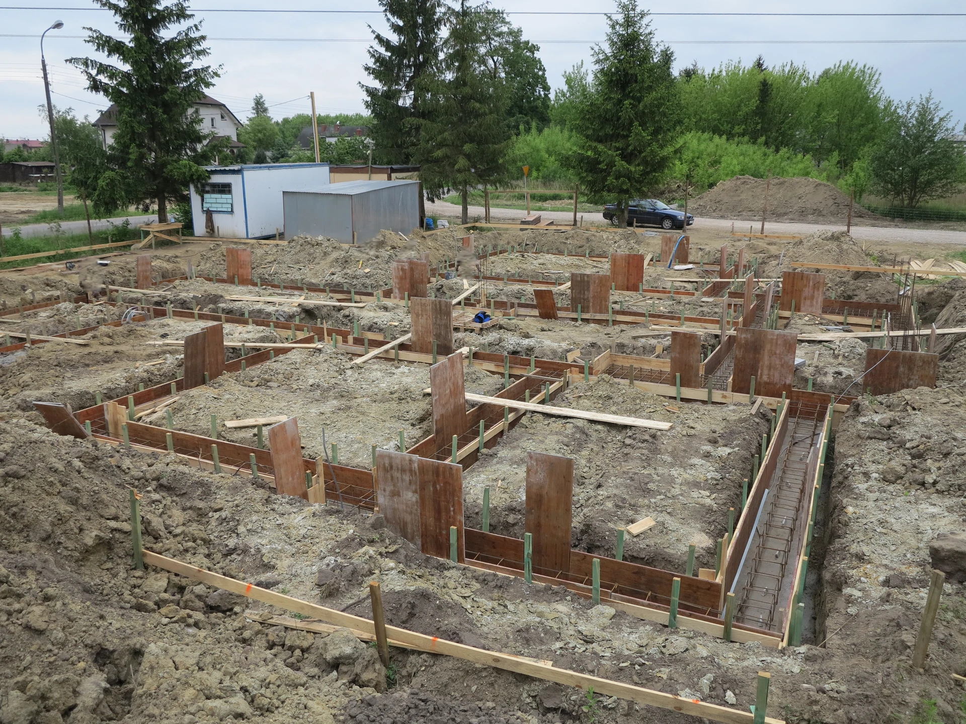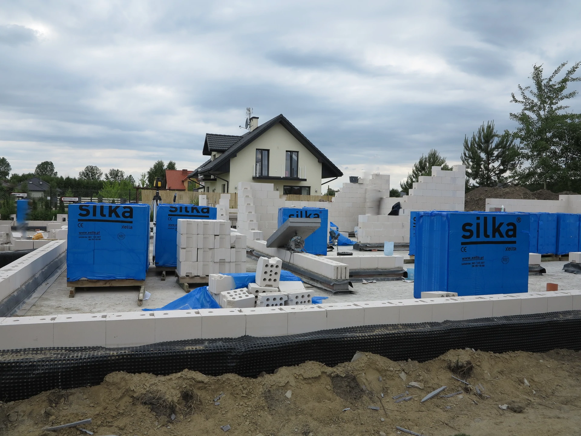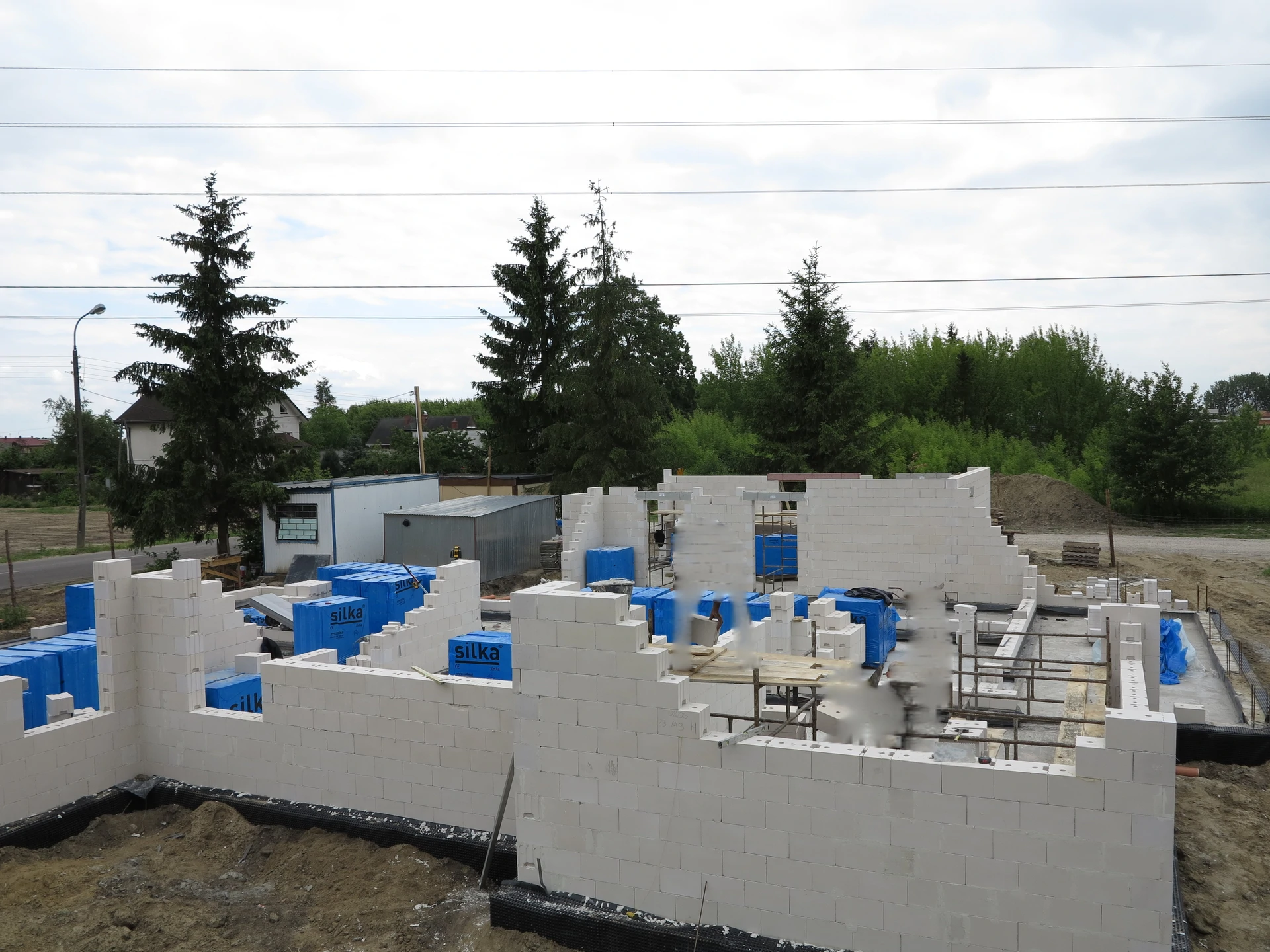 Budowa domu jednorodzinnego, budynek posadowiony na ławach fundamentowych. Ściany parteru wykonane z pustaka ceramicznego. Więźba dachowa z deskowaniem.