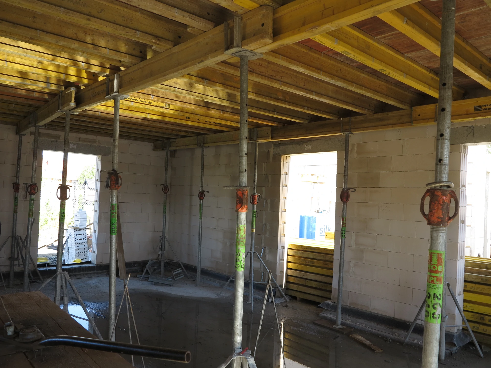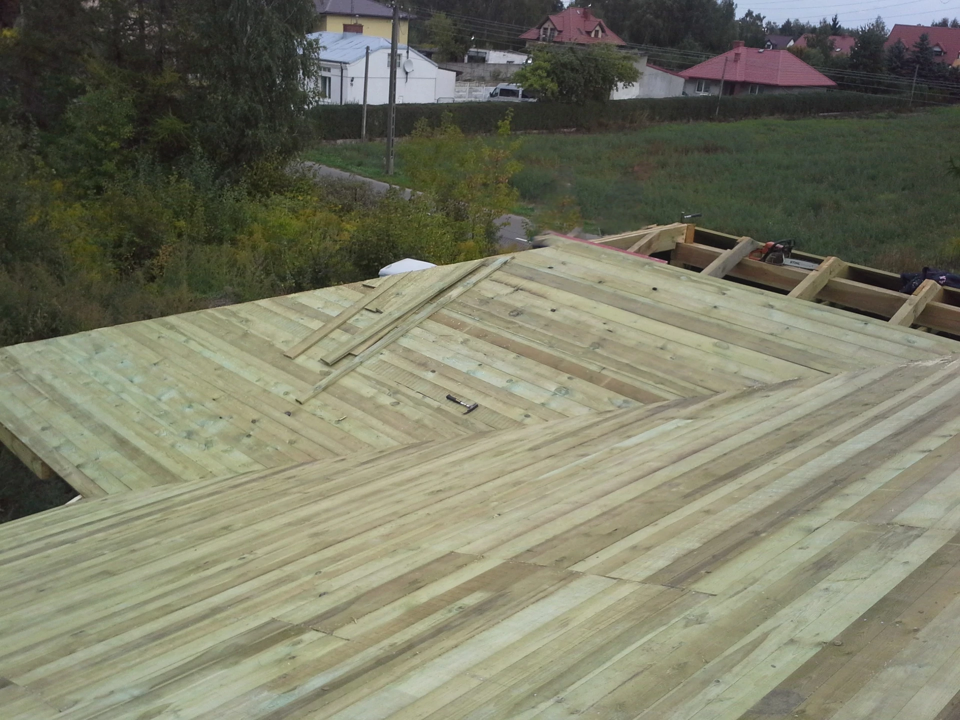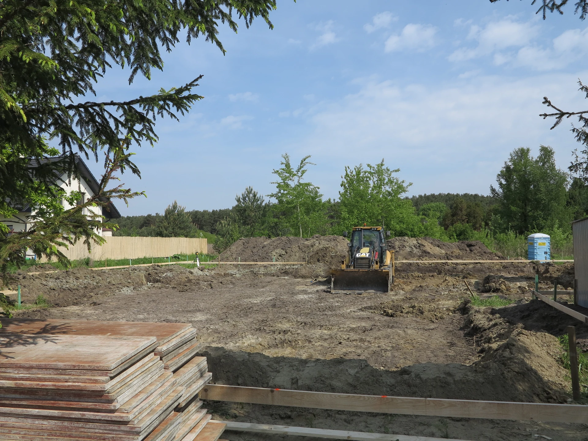 Budowa domu jednorodzinnego, budynek posadowiony na ławach fundamentowych. Ściany parteru wykonane z pustaka ceramicznego. Więźba dachowa z deskowaniem.
