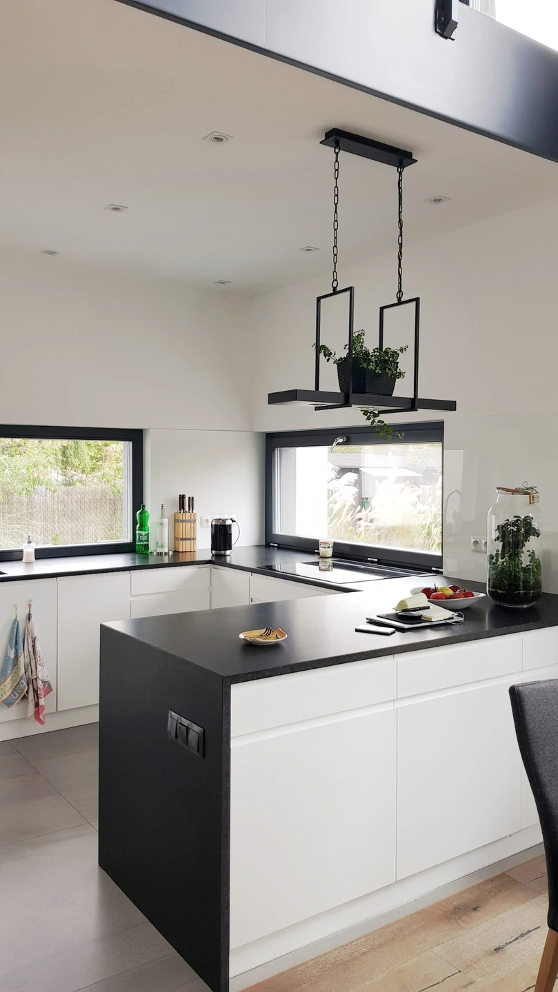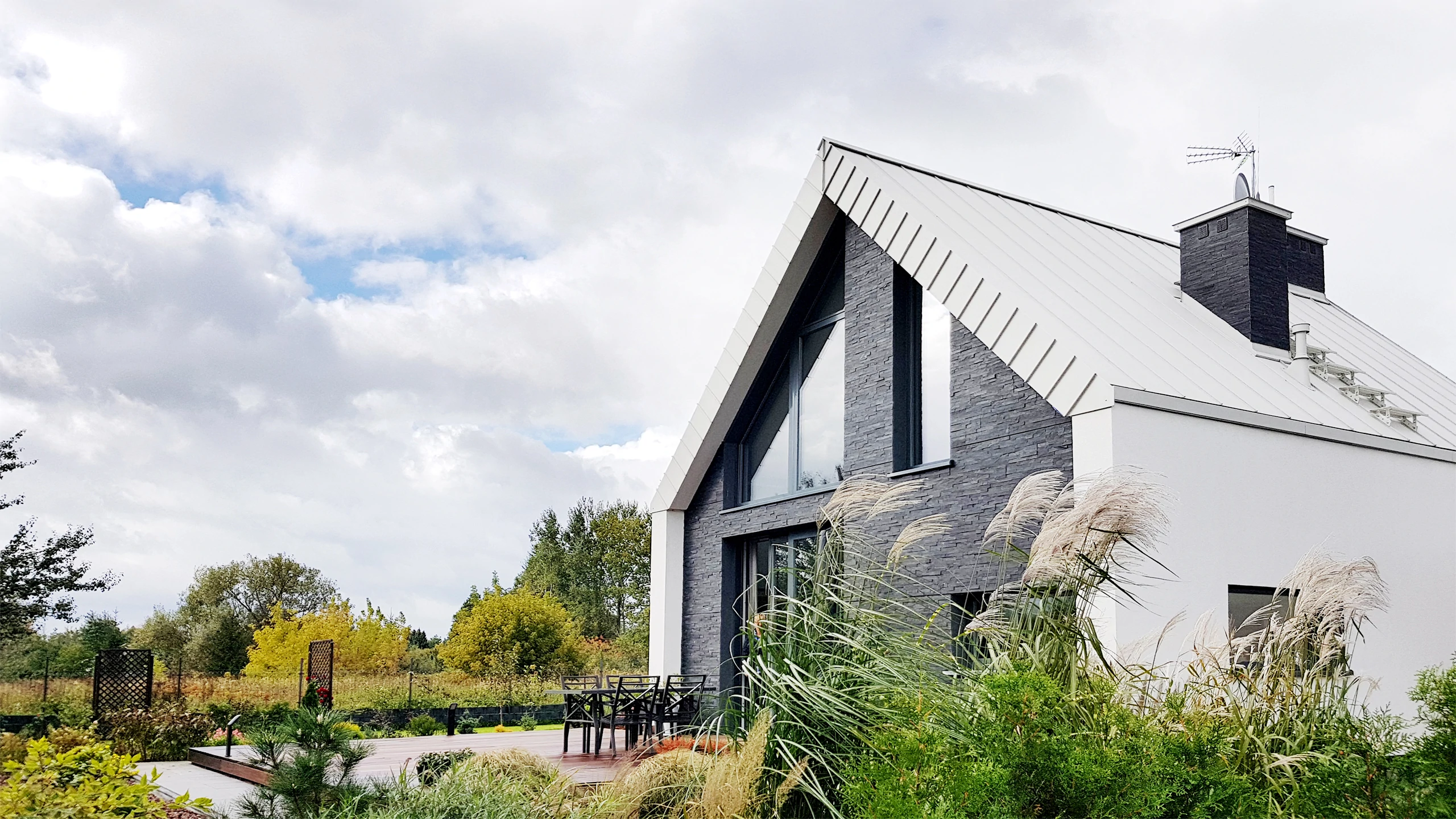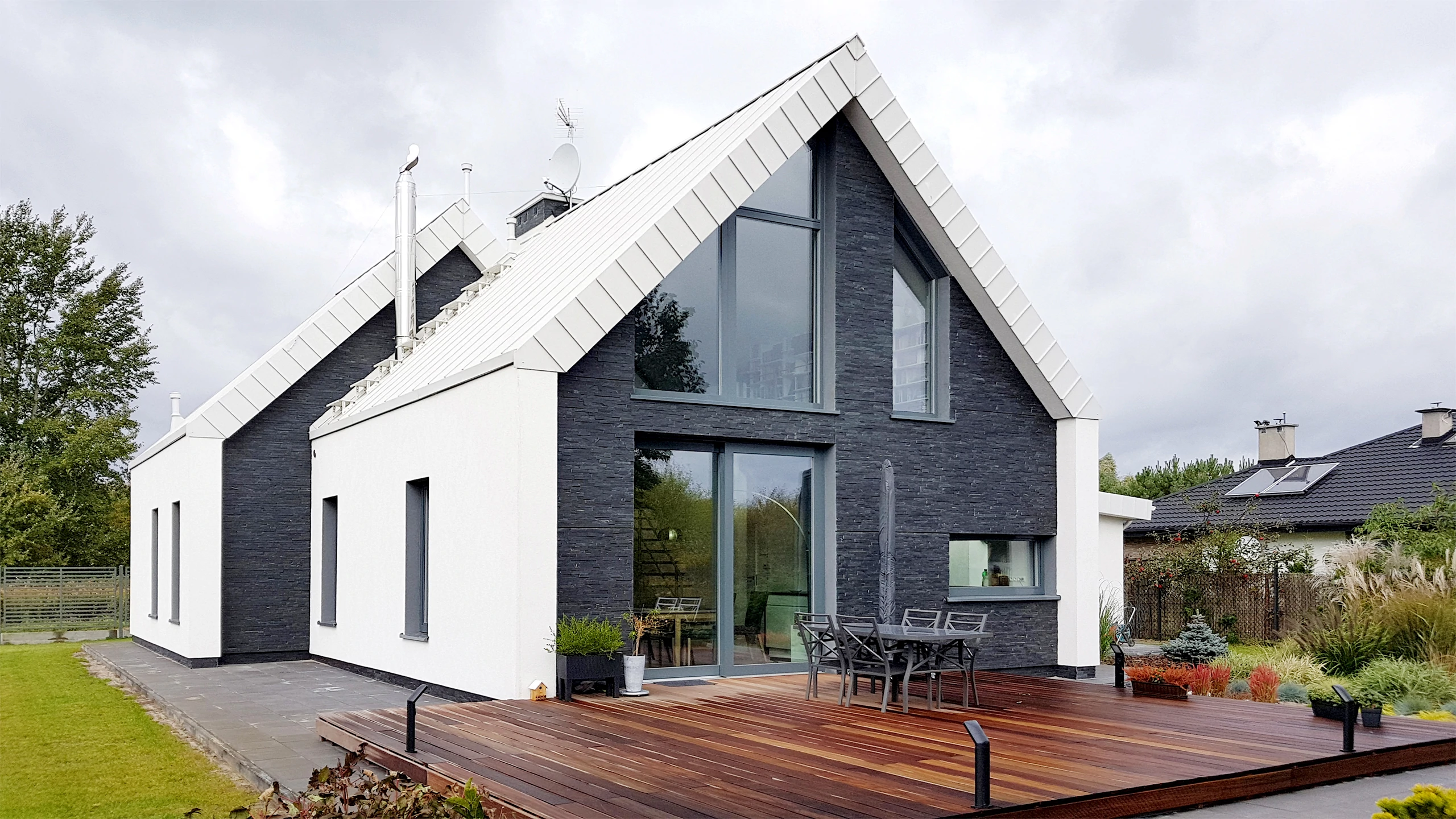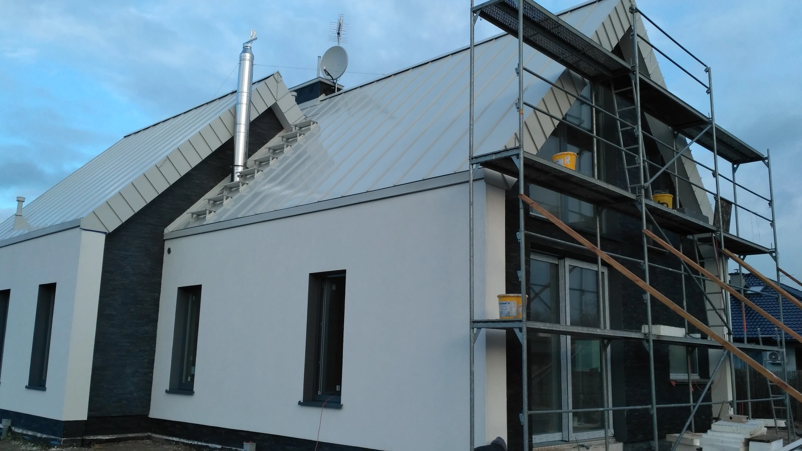 Projekt indywidualny. Budynek posadowiony na ławach fundamentowych. Ściany nadziemia wykonane z silikatów. Schody wspornikowe. Ściana z betonu architektonicznego. Pokrycie blacha aluminiowa na rąbek. Ukryte rynny. Na elewacji częściowo łupek. Stolarka zespolona aluminiowo-drewniana. Powierzchnia domu: 133 m2 Projekt: A8 Architektura Piotr Lewandowski