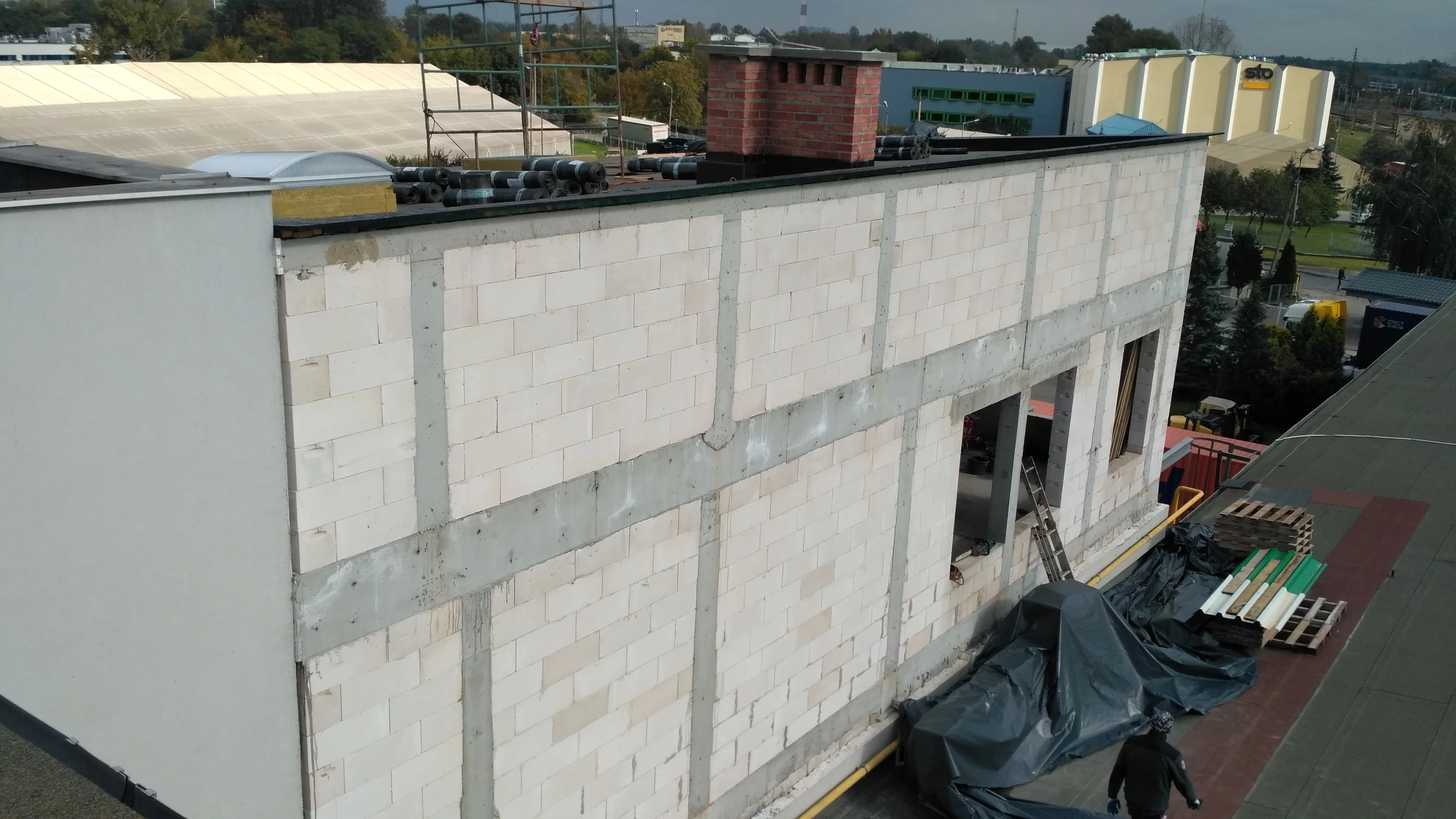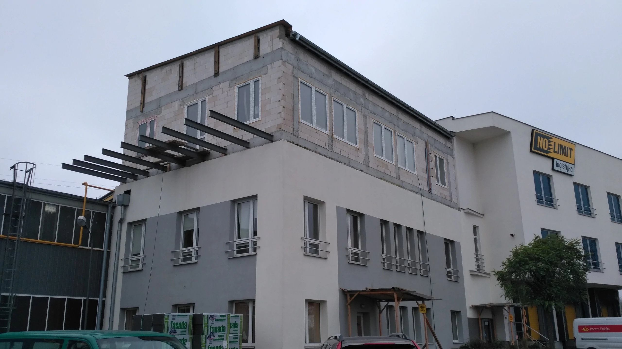 Wykonanie nadbudowy w budynku biurowym nad drugim piętrem. Ściany wykonane z silikatów, wiązary dachowe. Wystawienie belek pod montaż tarasu w przyszłości. Wykonanie docieplenia stropu, i adaptacja nadbudowy na pomieszczenia biurowe.