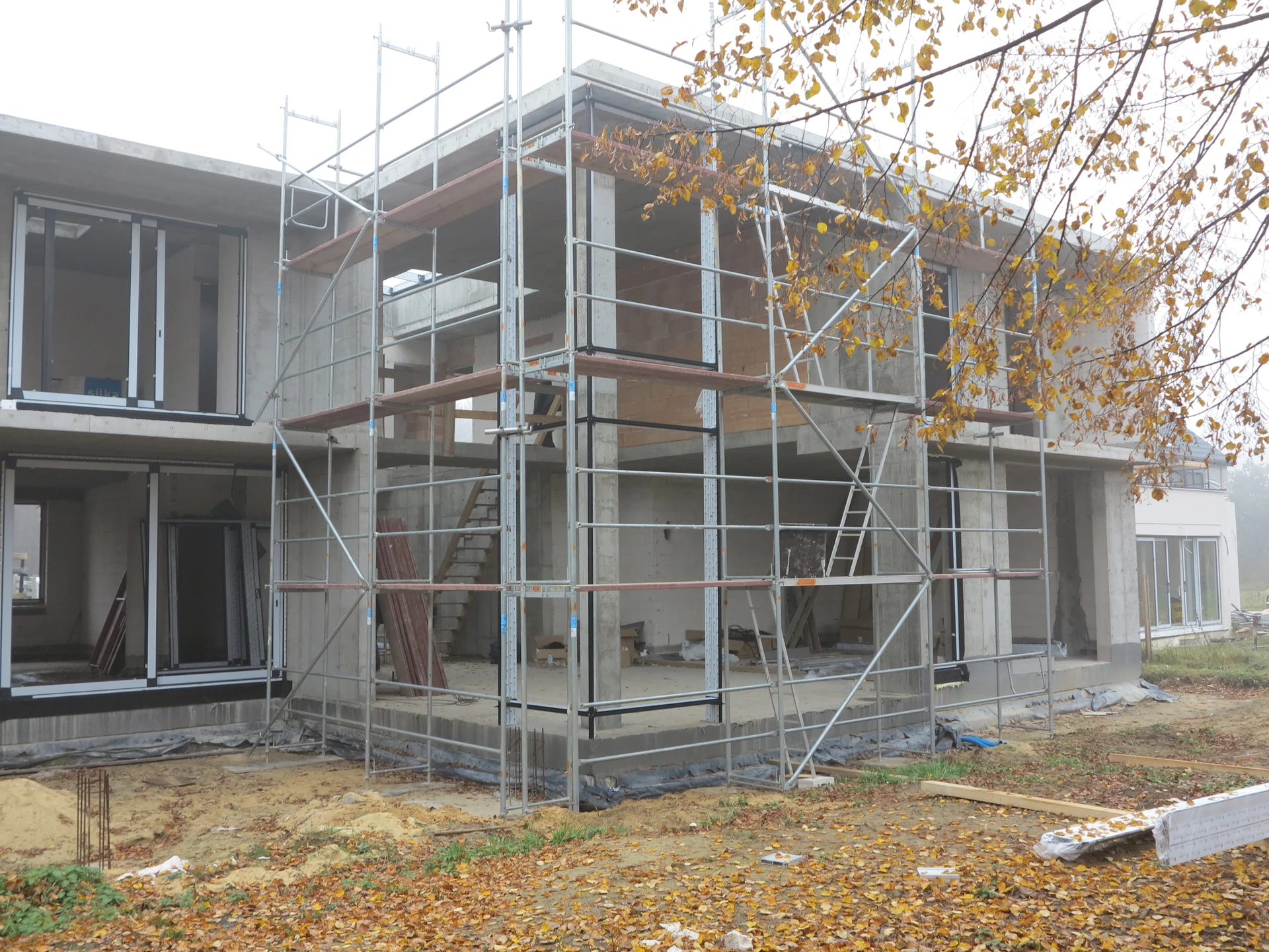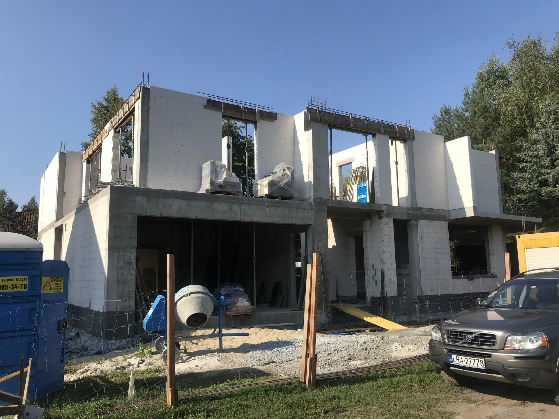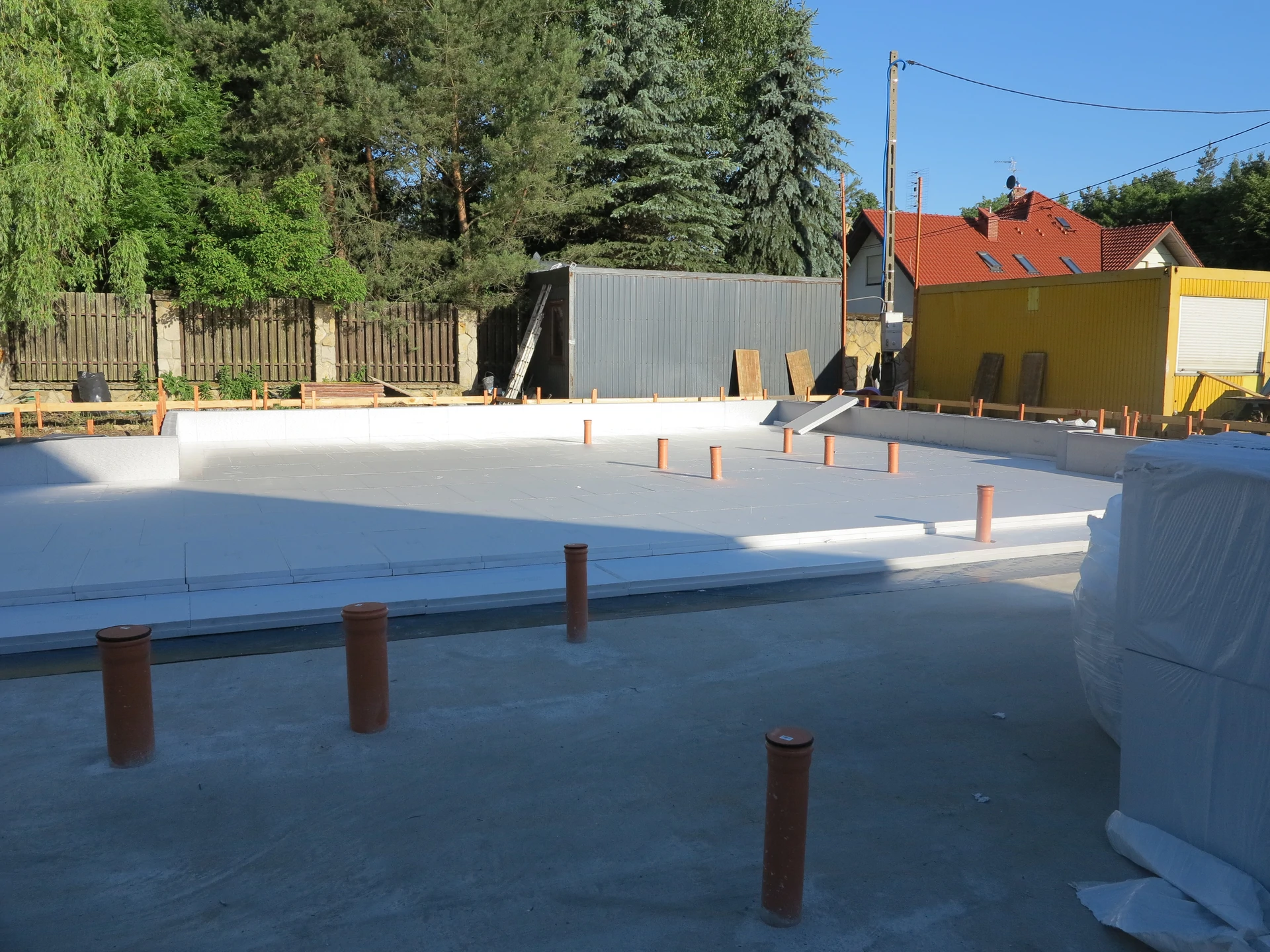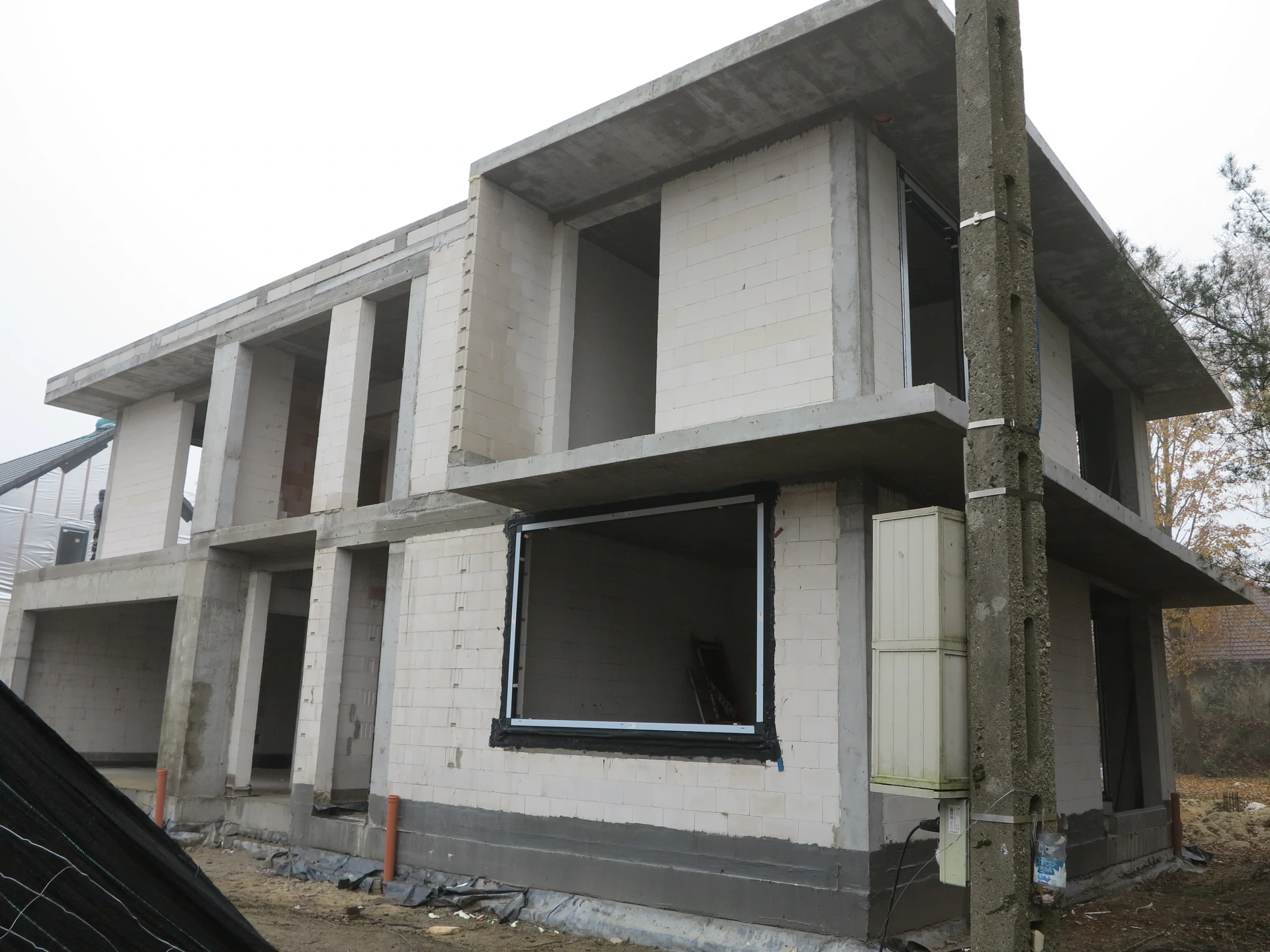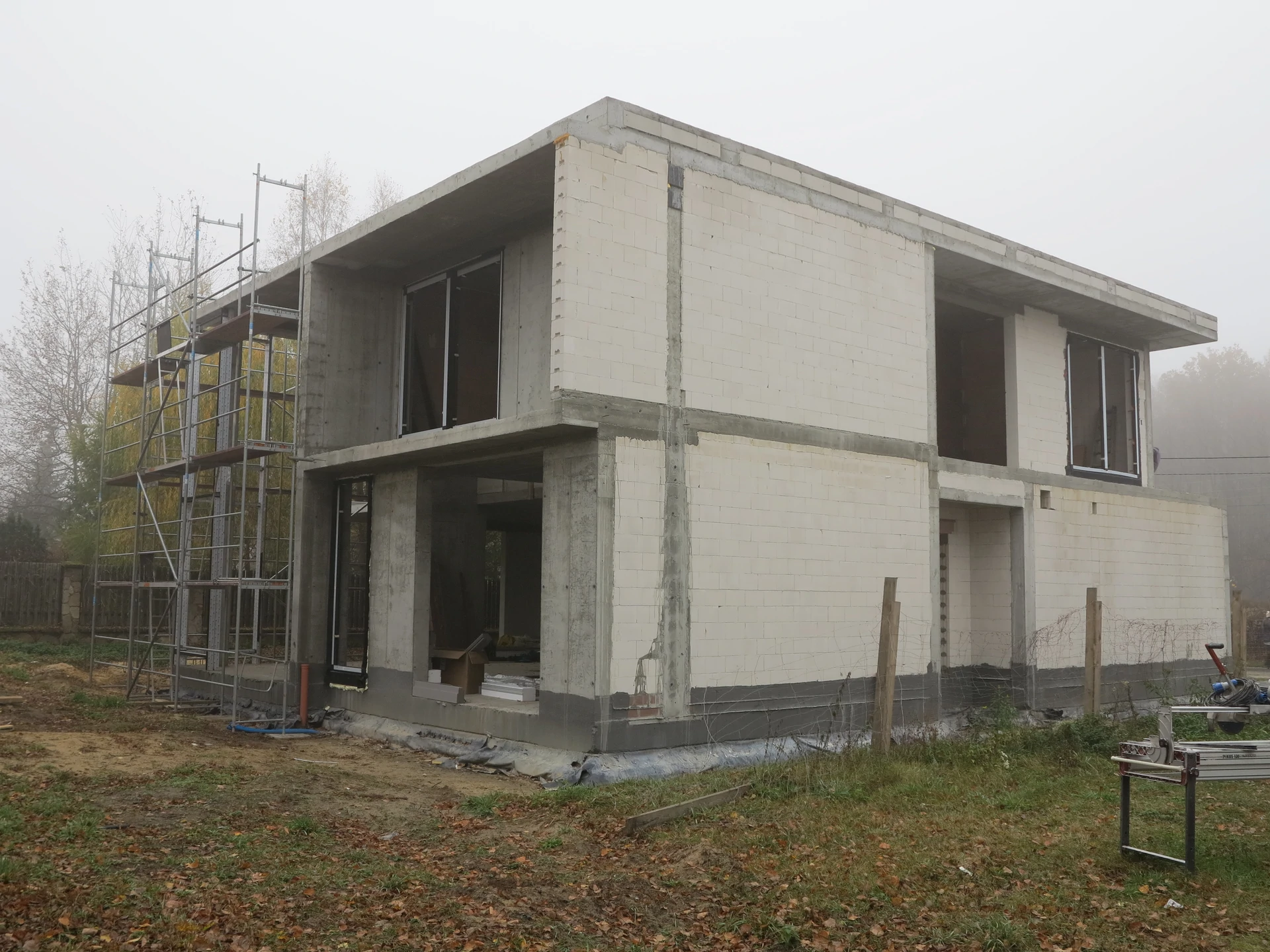 Budowa domu jednorodzinnego, budynek posadowiony na płycie fundamentowej. Ściany wykonane z pustaka ceramicznego. Dach płaski.