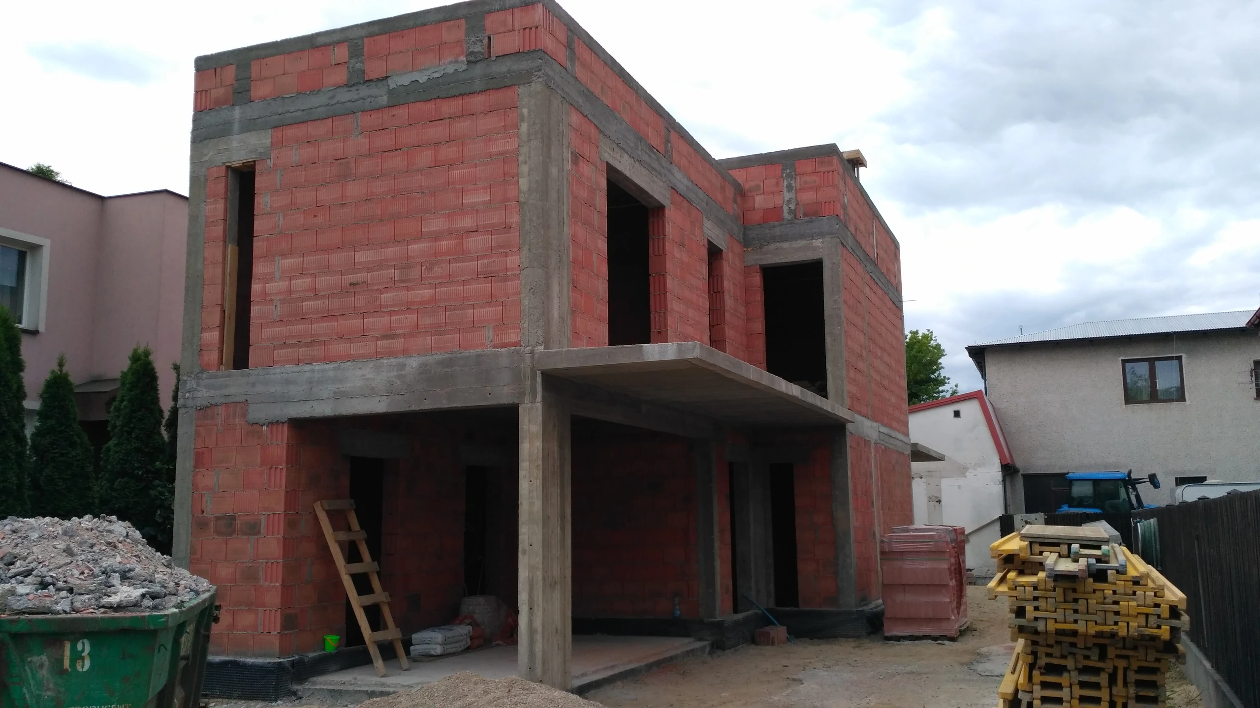 Budowa domu jednorodzinnego, budynek posadowiony na ławach fundamentowych, ściany wykonane z porothermu Dach płaski