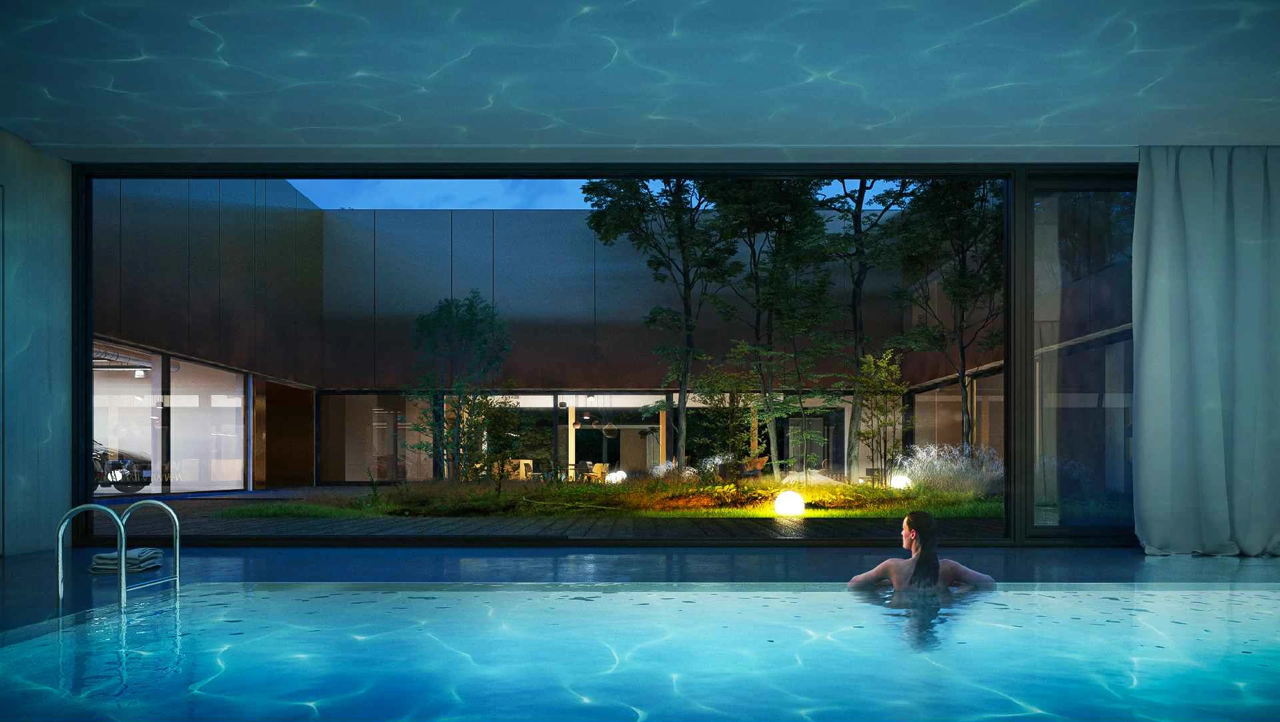 Realizacja: budynek z patio – konstrukcja żelbetowa, beton architektoniczny, dach wylany po skosie, biała wanna, płyta fundamentowa, basen