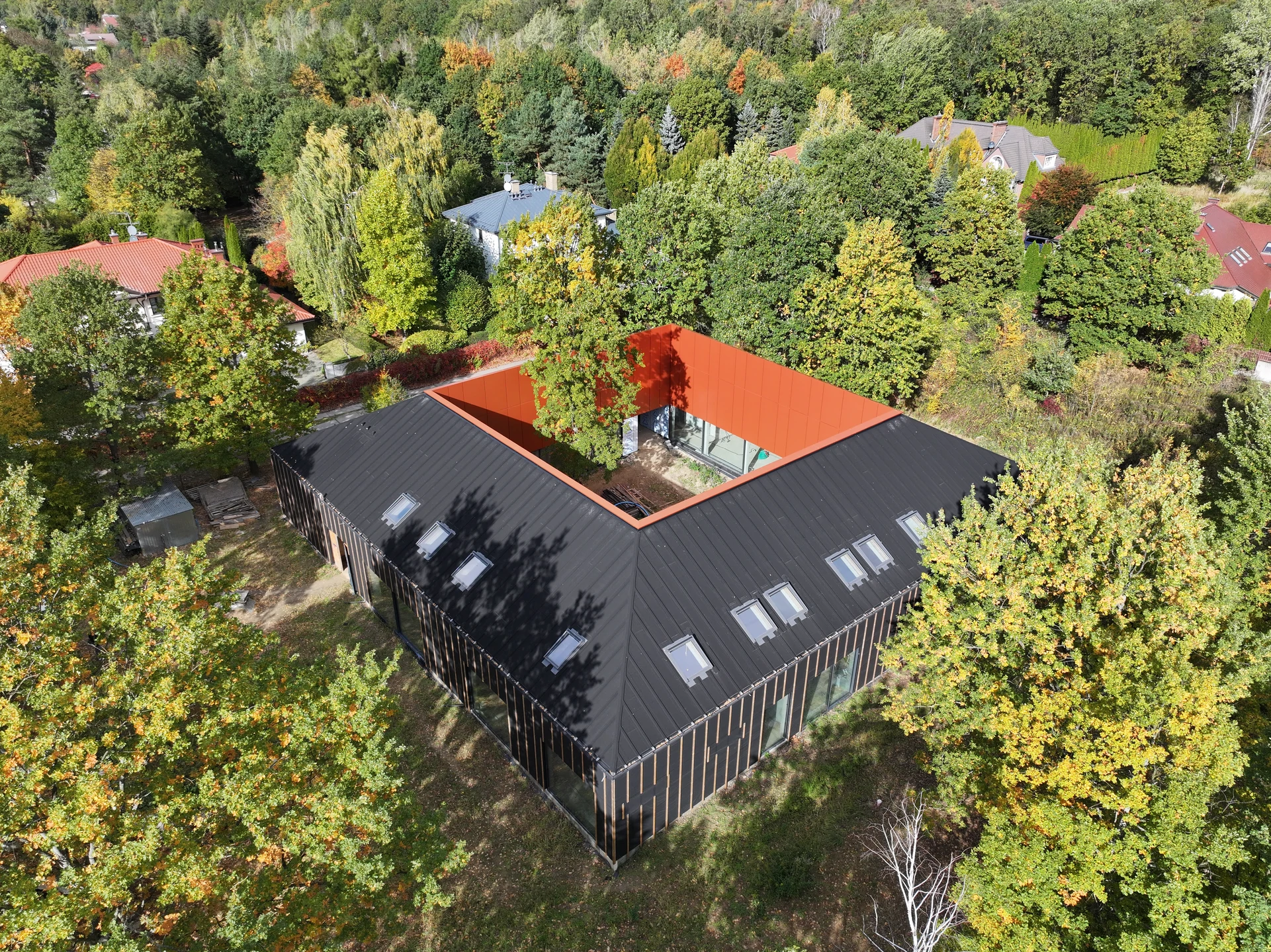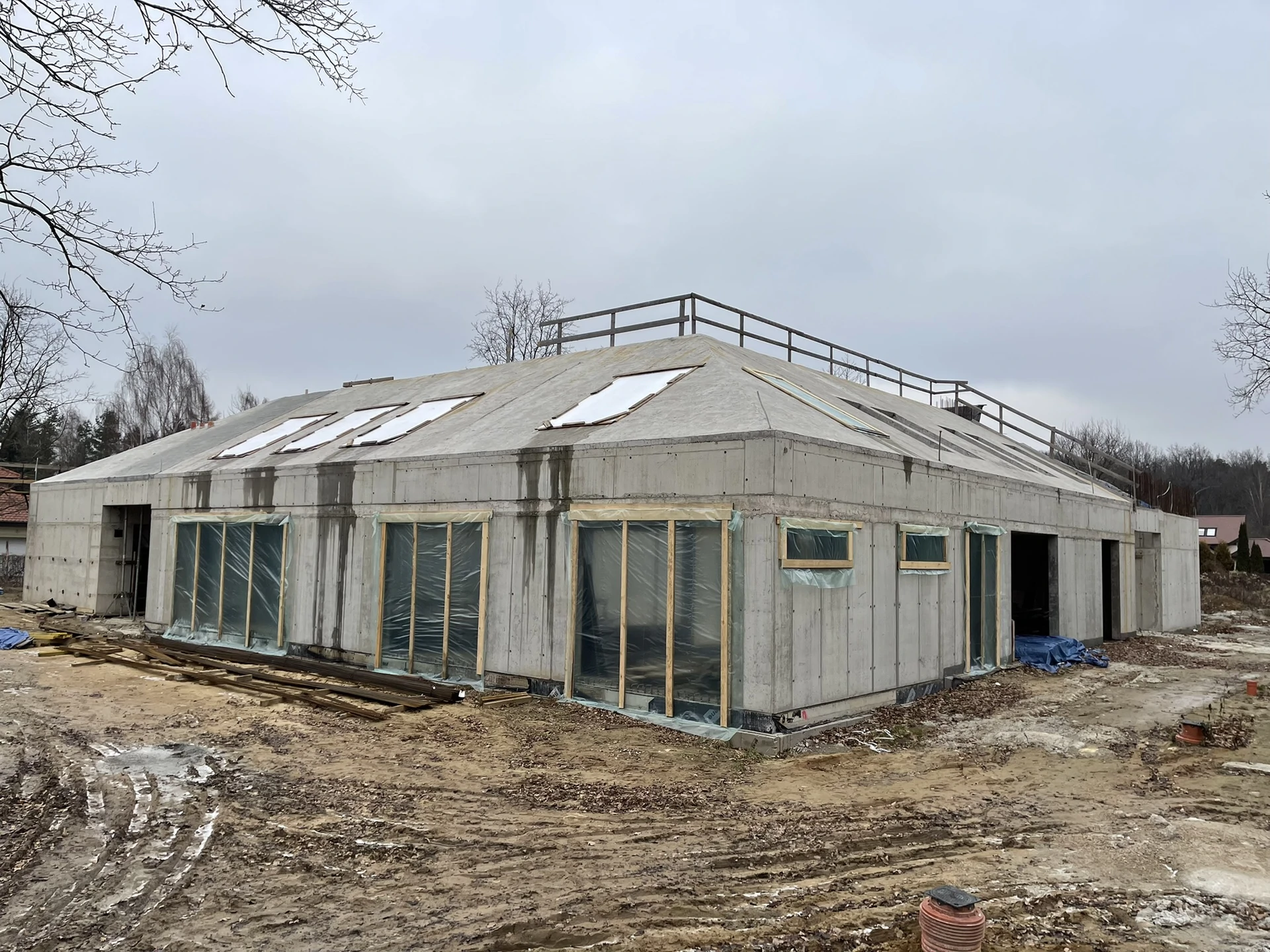 Budynek łączy wymagającą geometrię (patio, duże przeszklenia, strop skośny) z wysokimi wymaganiami technologicznymi: szczelna piwnica – biała wanna, posadowienie na płycie fundamentowej, oraz dodatkowe obiekty żelbetowe (basen). Finalny charakter architektury podkreśla beton architektoniczny i konsekwentnie prowadzona geometria bryły.