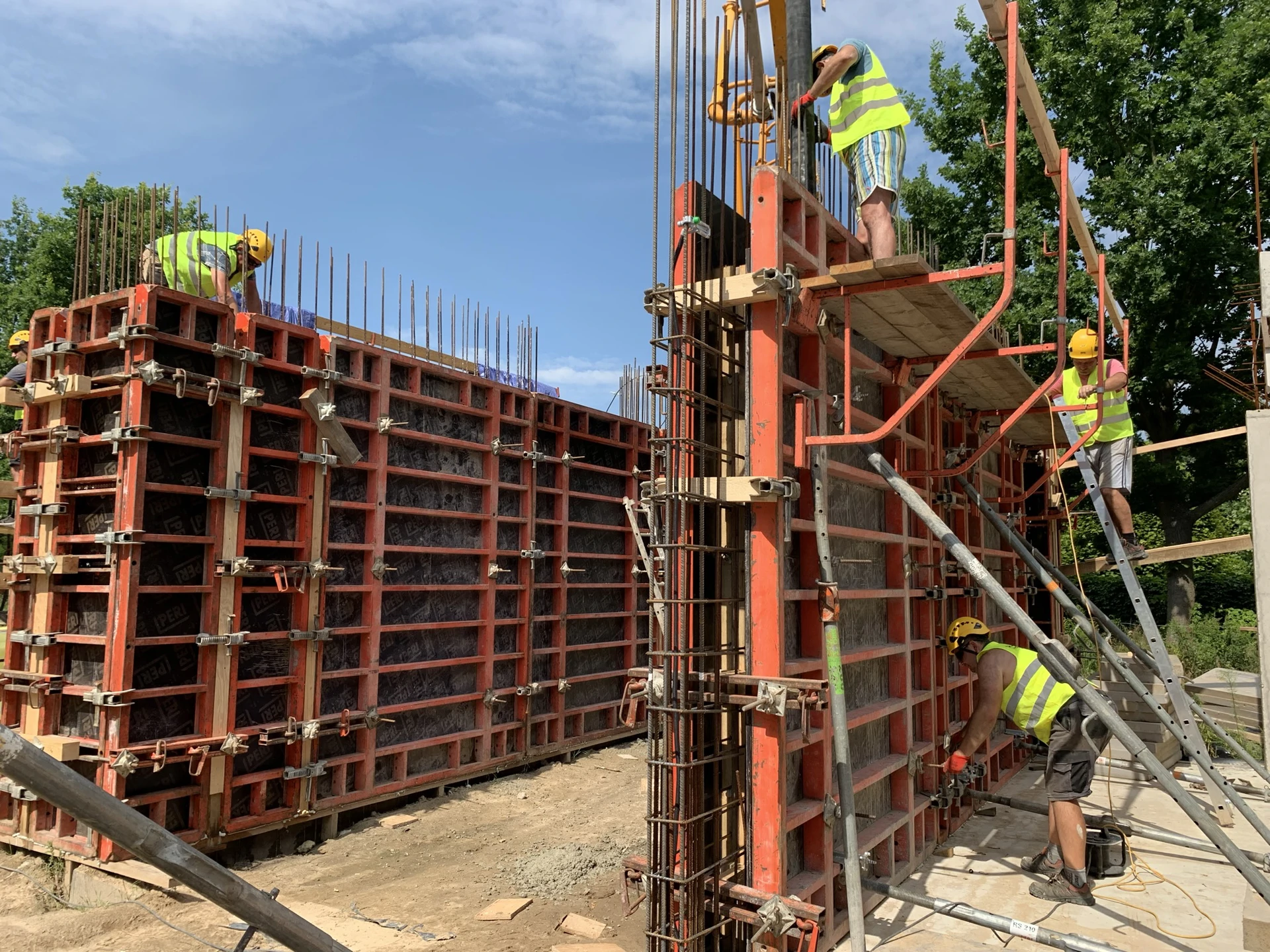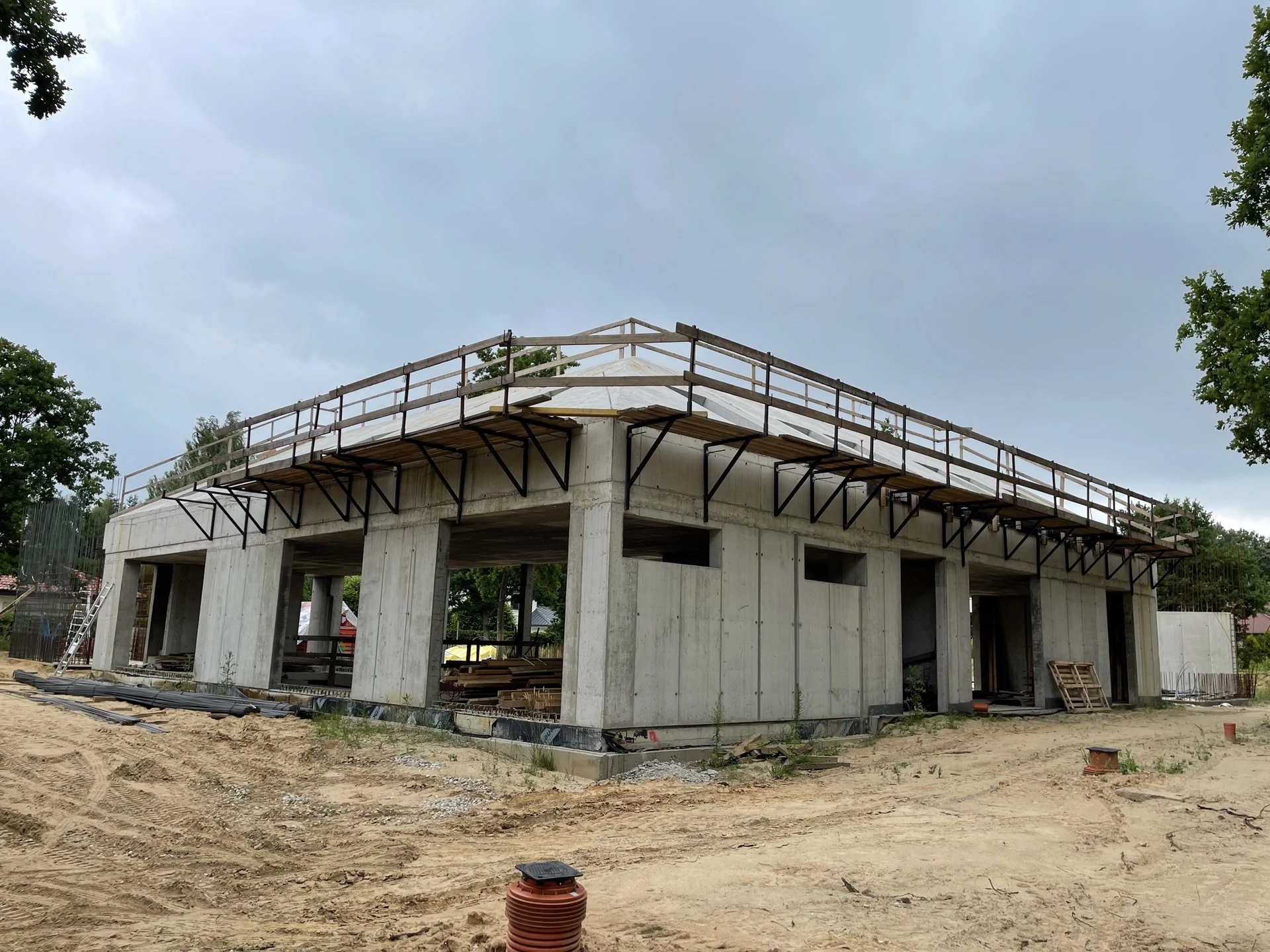 Pozostała część obiektu została posadowiona na płycie fundamentowej, z odpowiednim przygotowaniem podłoża i zbrojenia pod ściany oraz słupy żelbetowe.