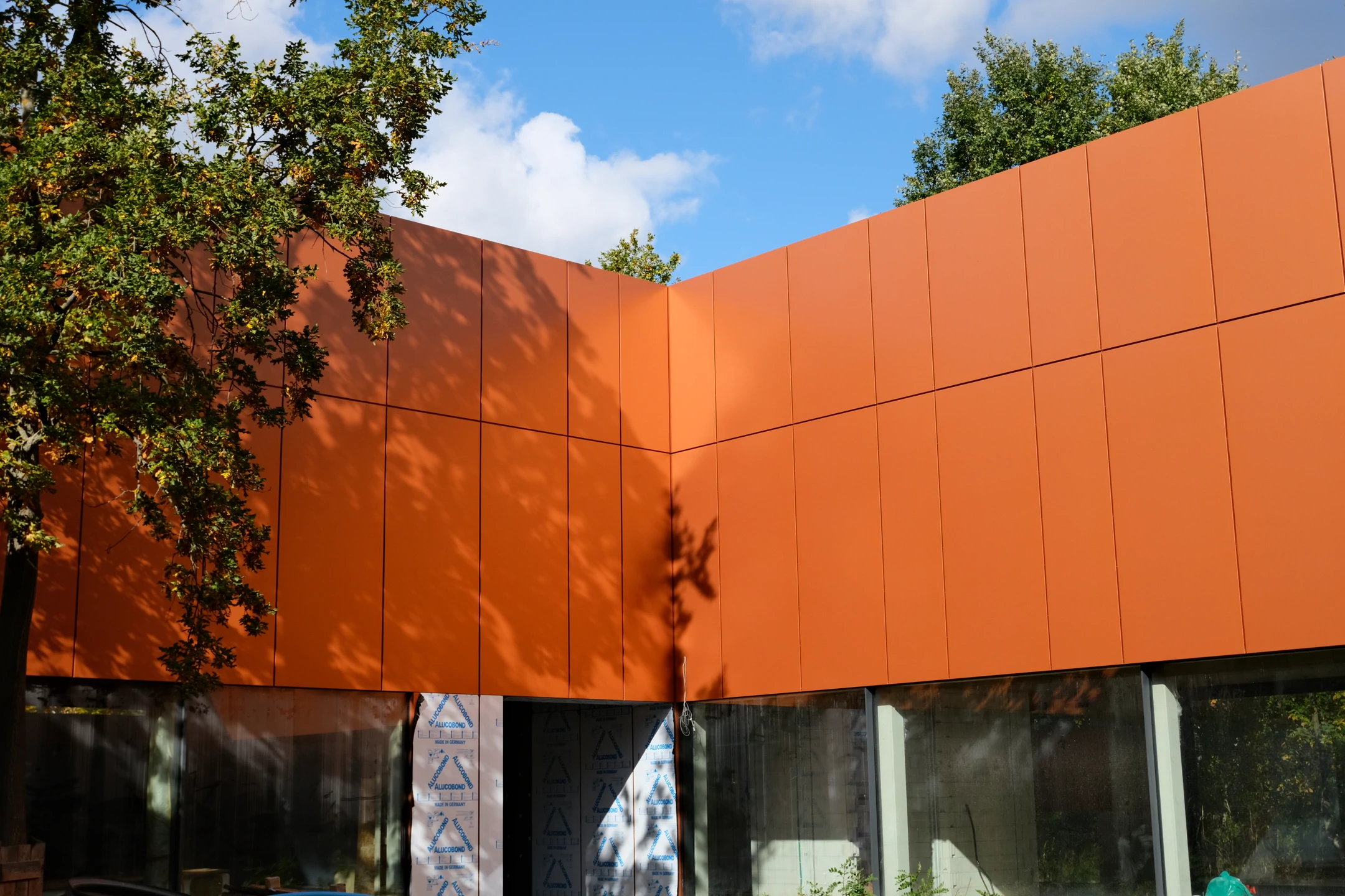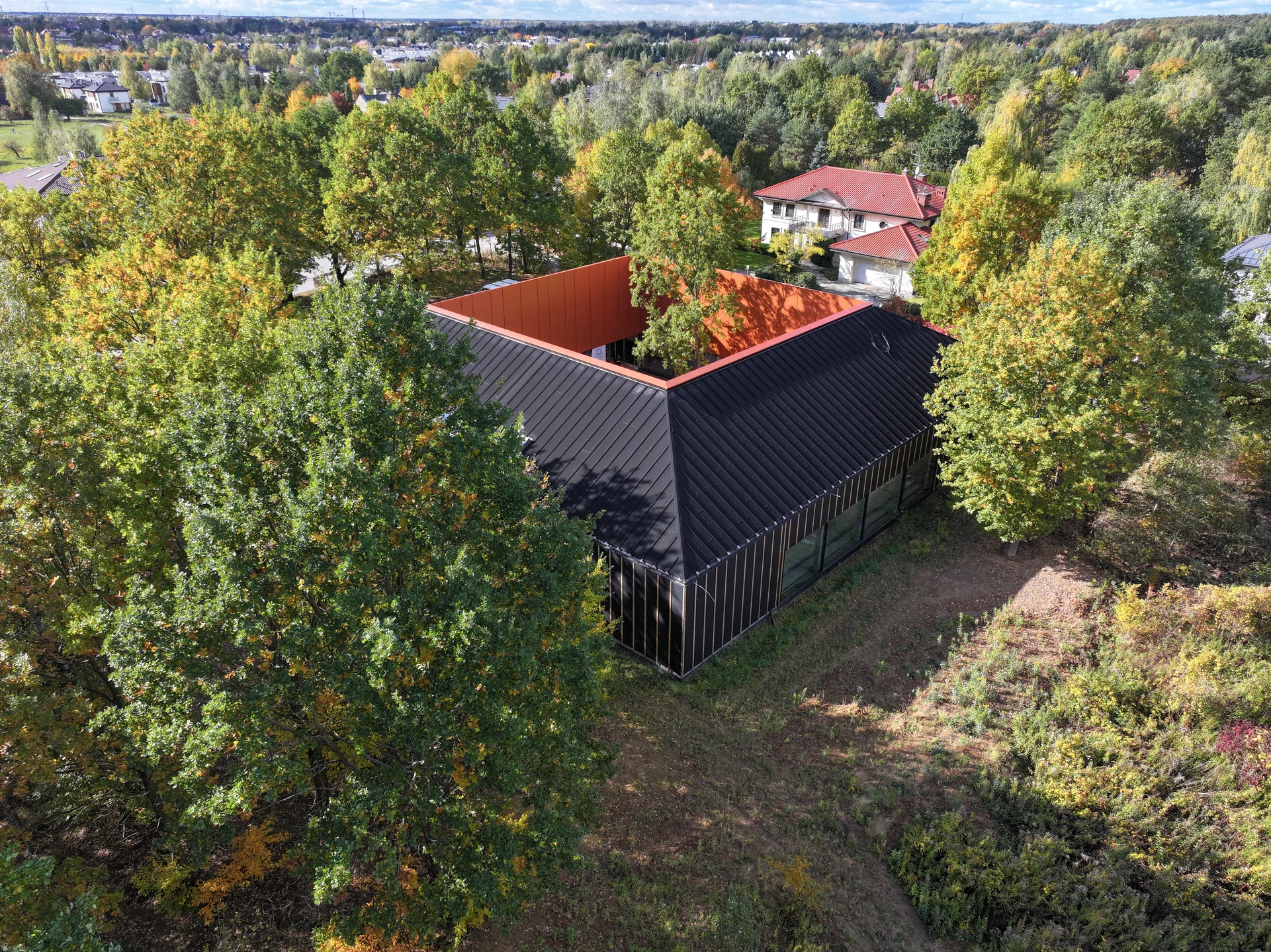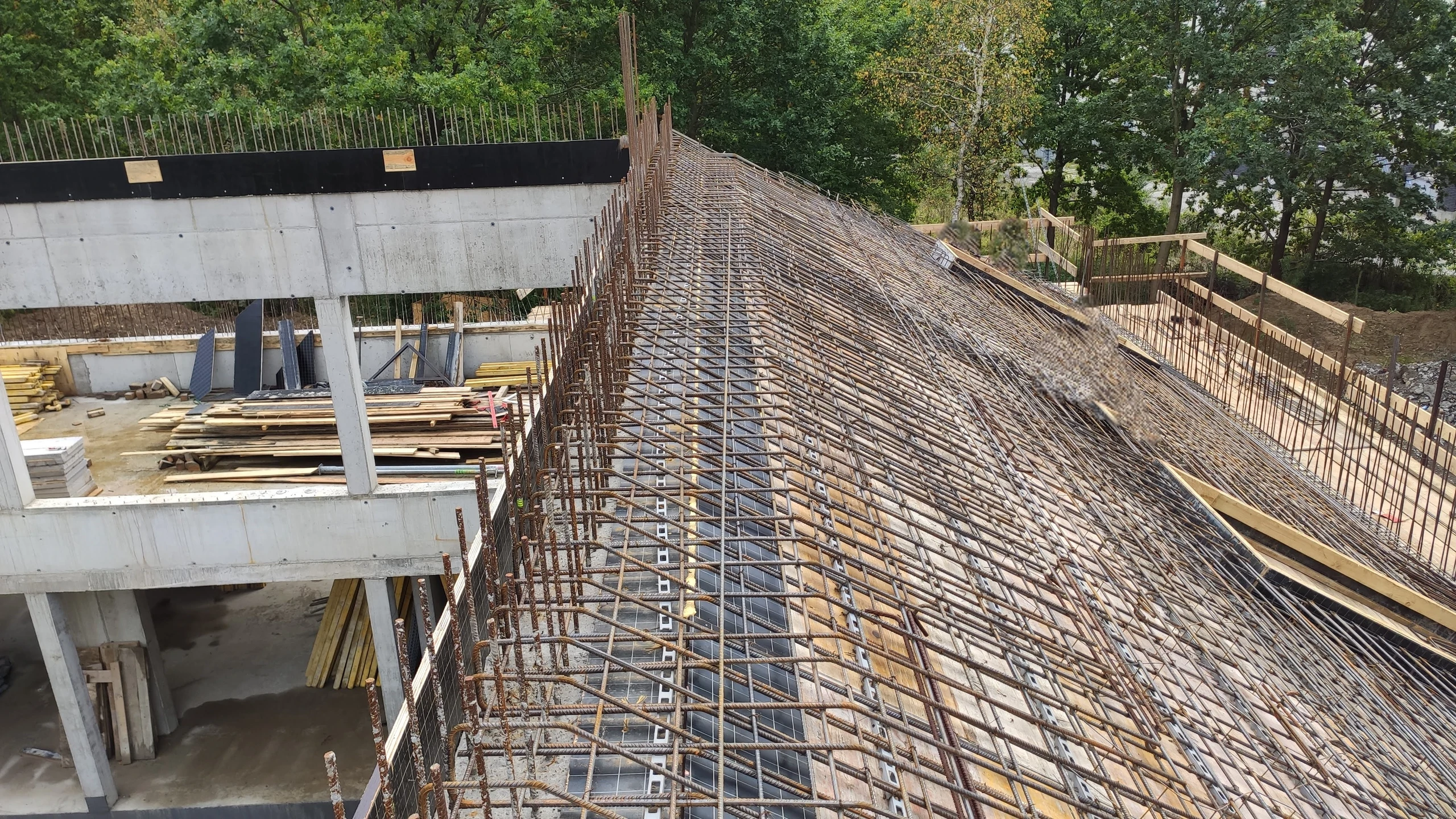 Realizacja obejmuje wykonanie obiektu o układzie zamkniętym wokół wewnętrznego patio. Główna część nadziemna została wykonana w technologii żelbetowej, z zastosowaniem betonu architektonicznego jako docelowej powierzchni ścian na parterze i piętrze. Istotnym elementem geometrii obiektu jest strop/dach po skosie wylewany z żelbetu, wymagający precyzyjnego deskowania oraz gęstego zbrojenia (również w rejonach otworów i krawędzi).